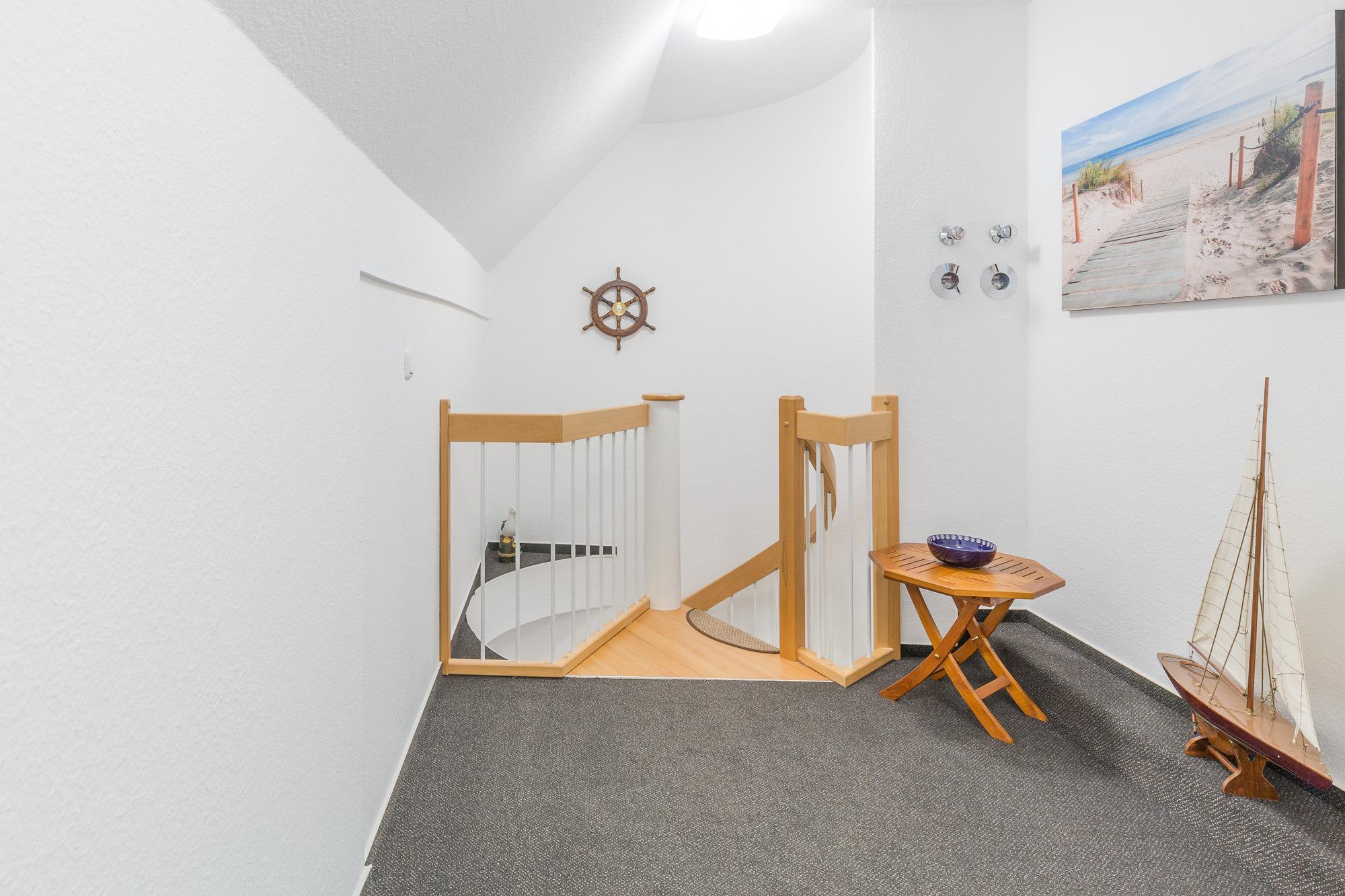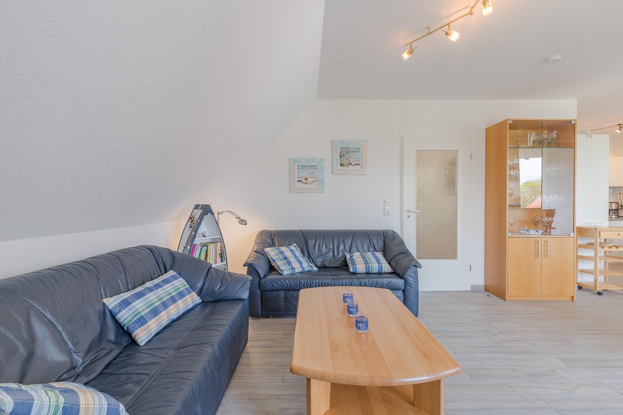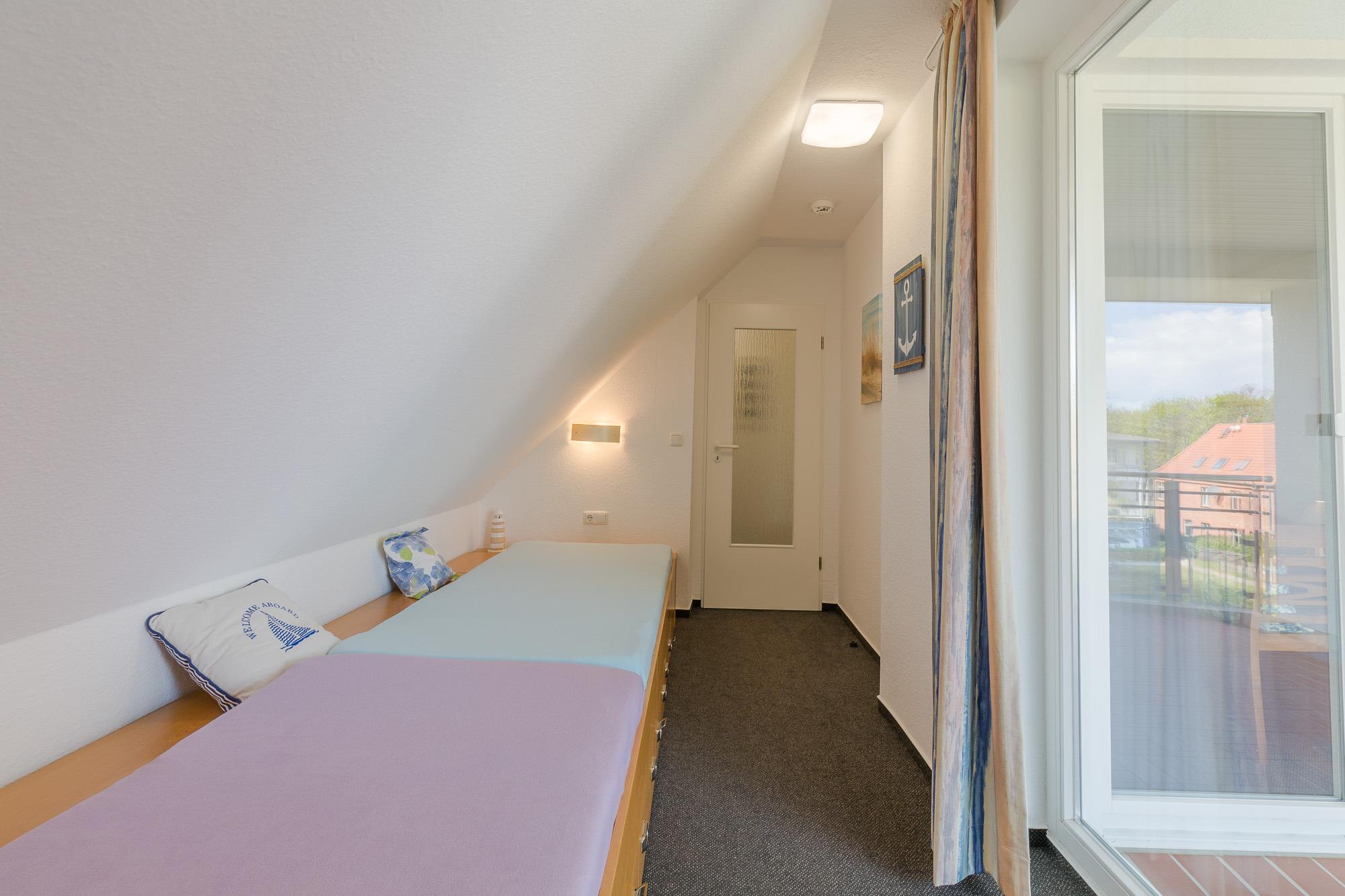 Die Maisonette-Wohnung befindet sich im 2. und 3. OG und sie ist bequem mit einem Fahrstuhl direkt aus der Tiefgarage zu erreichen. Über eine Wendeltreppe ist das DG erreichbar. Beide Ebenen verfügen je über einen Balkon und von beiden Balkonen können Sie den tollen Seeblick genießen. Die Ferienwohnung 41 in der Residenz Likedeeler ist für bis zu 4 Personen ausgestattet. Auf der unteren Ebene (2. OG) befindet sich das große Wohnzimmer mit der offenen moderne Küche (inkl. Einbauküche mit Geschirrspüler, Mikrowelle, Backofen und Cerankochfeld) und einem schönen Essbereich. Vom Wohnzimmer aus können Sie den Balkon betreten. Auch ein großer Flur und ein Duschbad sind auf dieser Ebene vorhanden. Der obere Bereich ist freundlich und hell gestaltet. Hier befinden sich ein Schlafzimmer mit einem Doppelbett (180 x 200 cm) und Flatscreen-TV, ein zweites Schlafzimmer mit 2 hintereinander stehenden Einzelbetten (2 x 90 x 200 cm) und der Zugang zum zweiten Balkon. Auch ein weiteres Duschbad ist vorhanden.