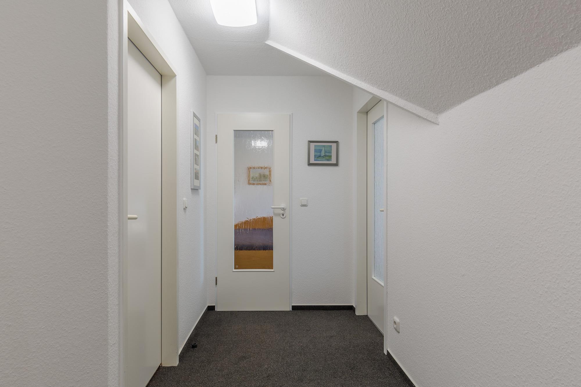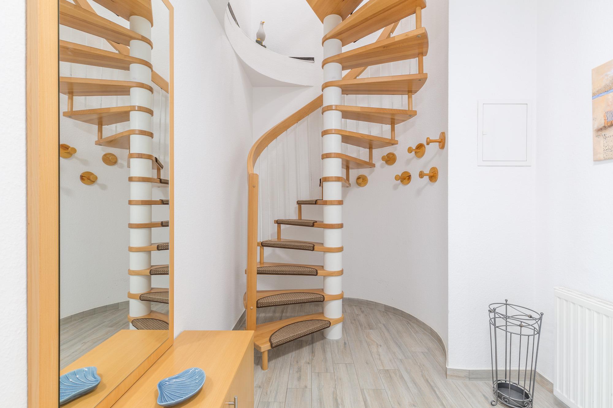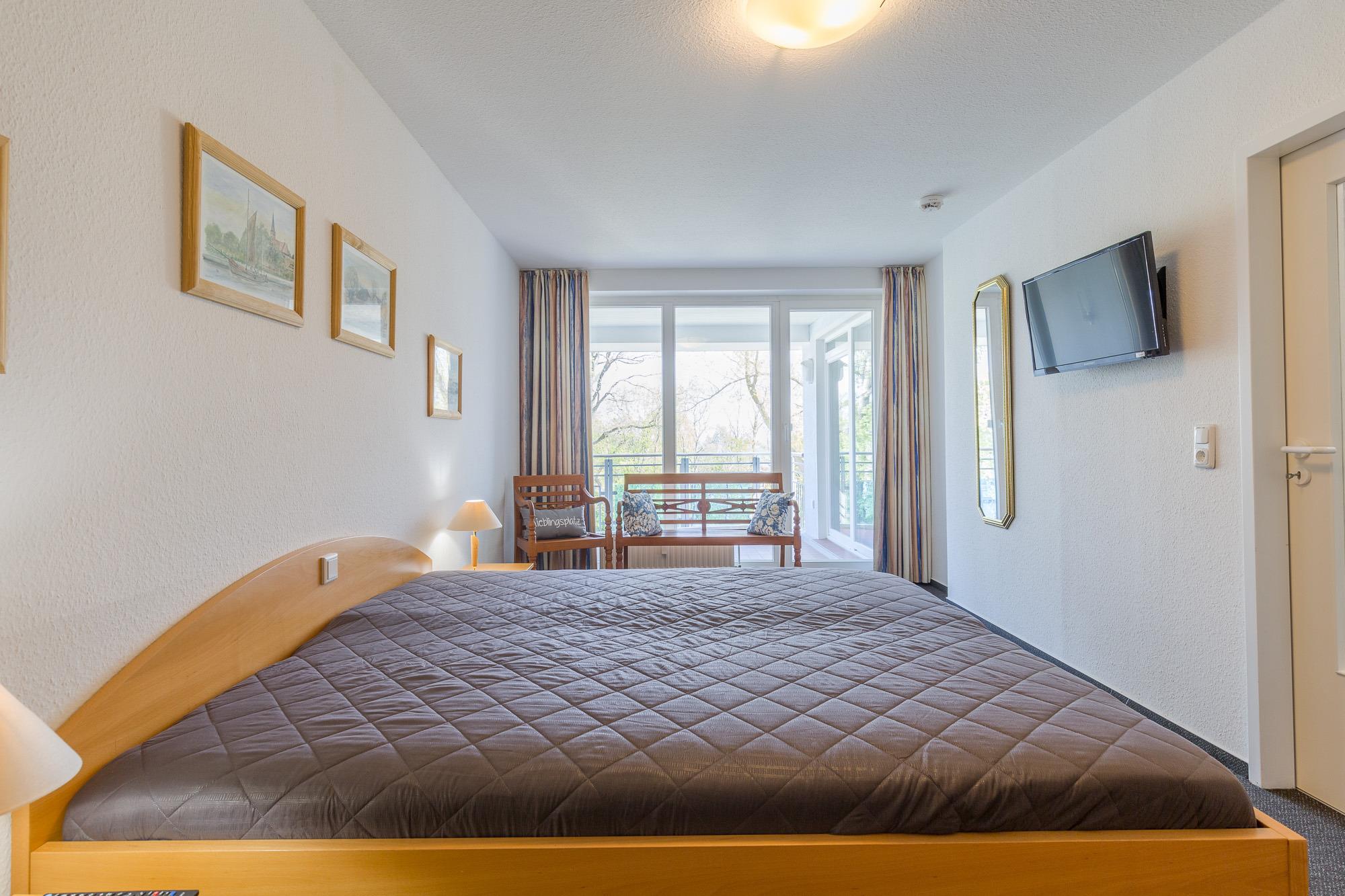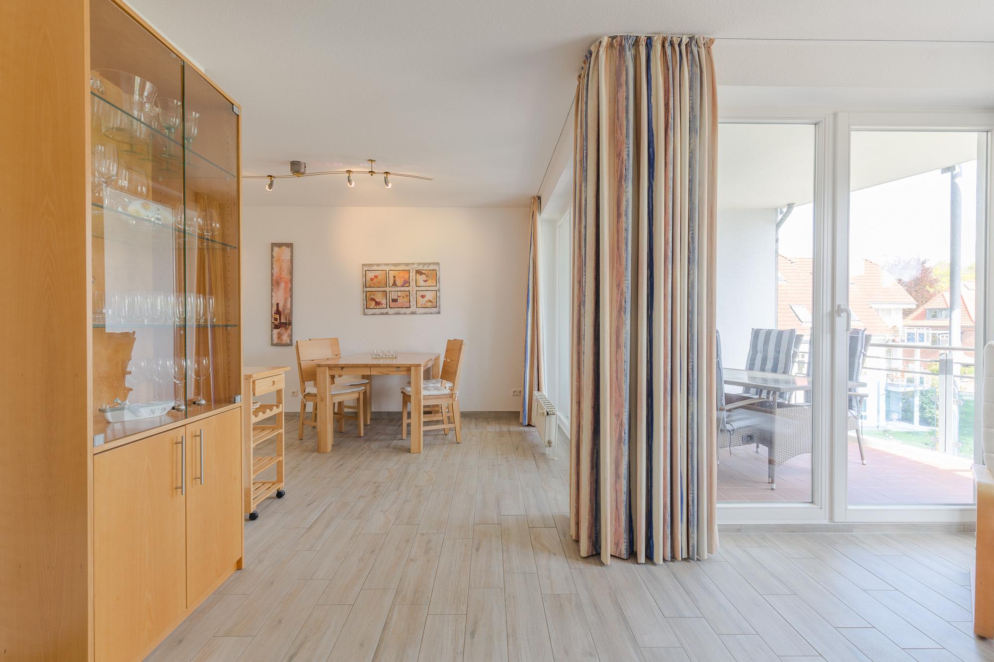 Die Maisonette-Wohnung befindet sich im 2. und 3. OG und sie ist bequem mit einem Fahrstuhl direkt aus der Tiefgarage zu erreichen. Über eine Wendeltreppe ist das DG erreichbar. Beide Ebenen verfügen je über einen Balkon und von beiden Balkonen können Sie den tollen Seeblick genießen. Die Ferienwohnung 41 in der Residenz Likedeeler ist für bis zu 4 Personen ausgestattet. Auf der unteren Ebene (2. OG) befindet sich das große Wohnzimmer mit der offenen moderne Küche (inkl. Einbauküche mit Geschirrspüler, Mikrowelle, Backofen und Cerankochfeld) und einem schönen Essbereich. Vom Wohnzimmer aus können Sie den Balkon betreten. Auch ein großer Flur und ein Duschbad sind auf dieser Ebene vorhanden. Der obere Bereich ist freundlich und hell gestaltet. Hier befinden sich ein Schlafzimmer mit einem Doppelbett (180 x 200 cm) und Flatscreen-TV, ein zweites Schlafzimmer mit 2 hintereinander stehenden Einzelbetten (2 x 90 x 200 cm) und der Zugang zum zweiten Balkon. Auch ein weiteres Duschbad ist vorhanden.