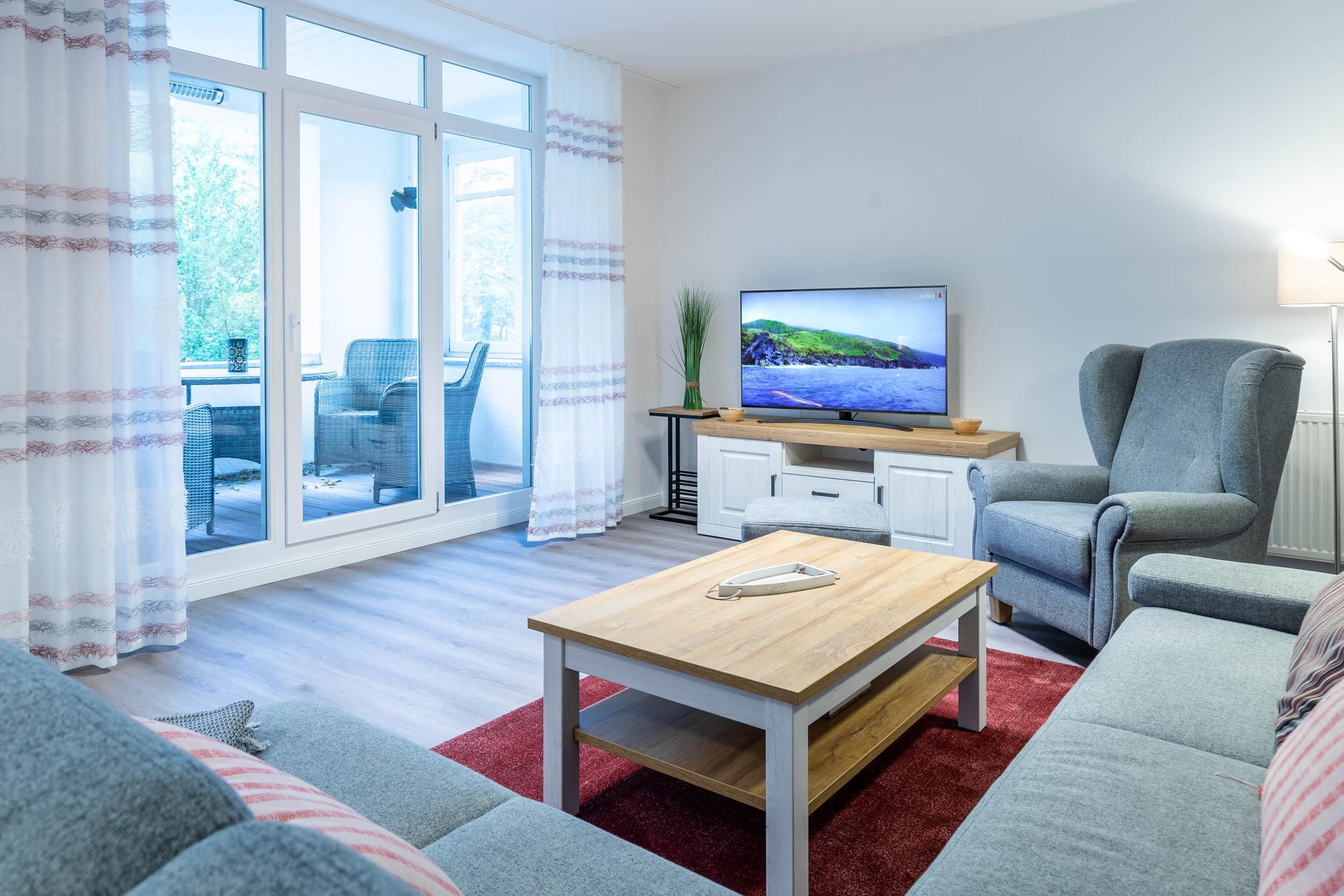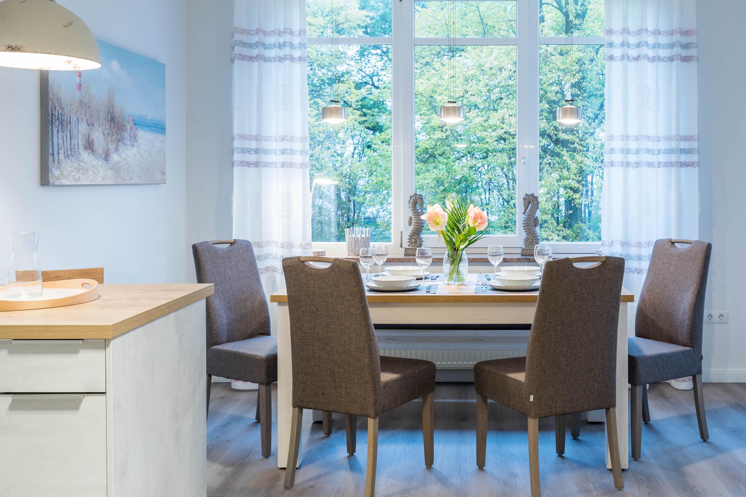 The large cosy living room with its classic-modern sofa corner and grandma's wing chair invites you to spend quiet evenings - with a glass of wine or tea in front of the TV, engrossed in a book or simply with a view of maritime nature. At the large dining table, you can also enjoy a wonderful view of the Baltic Sea during convivial meals and entertaining rounds of board games.