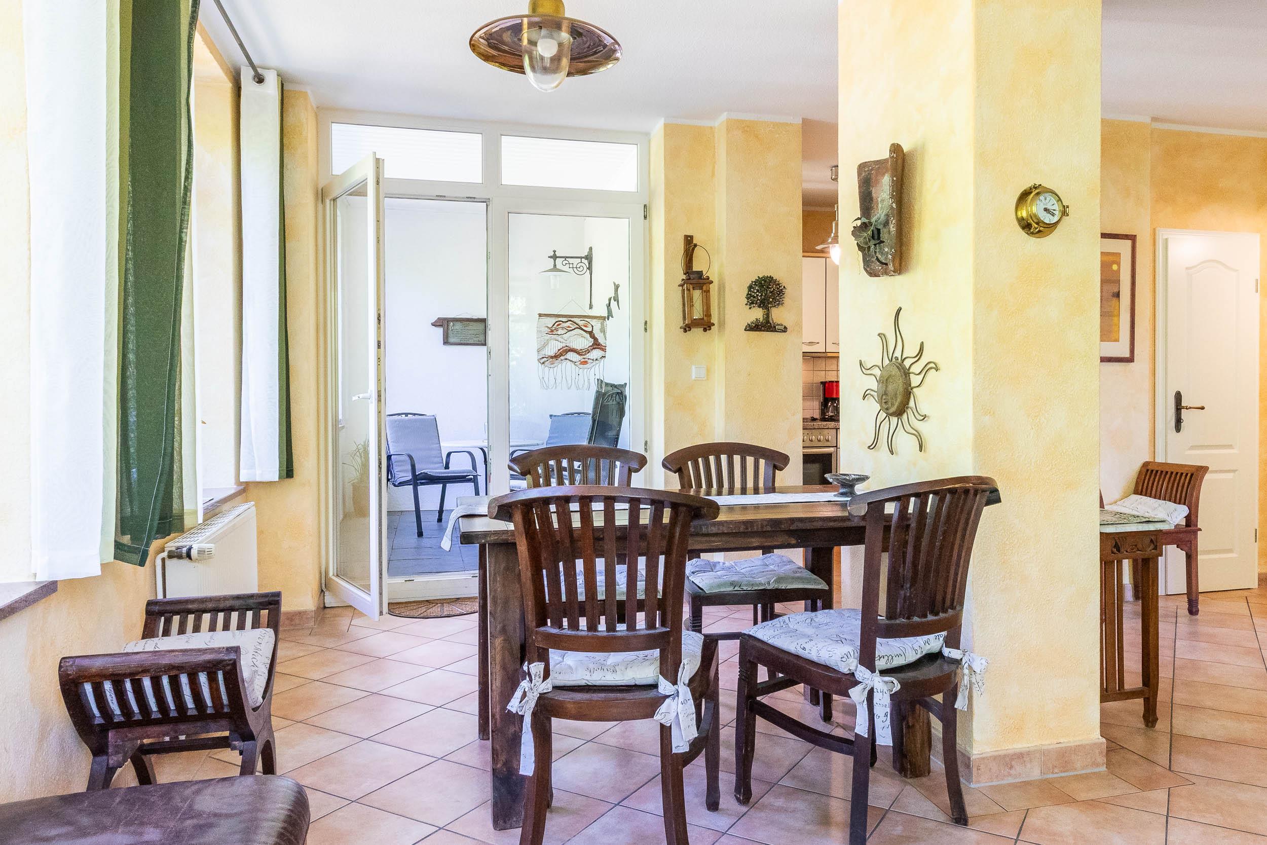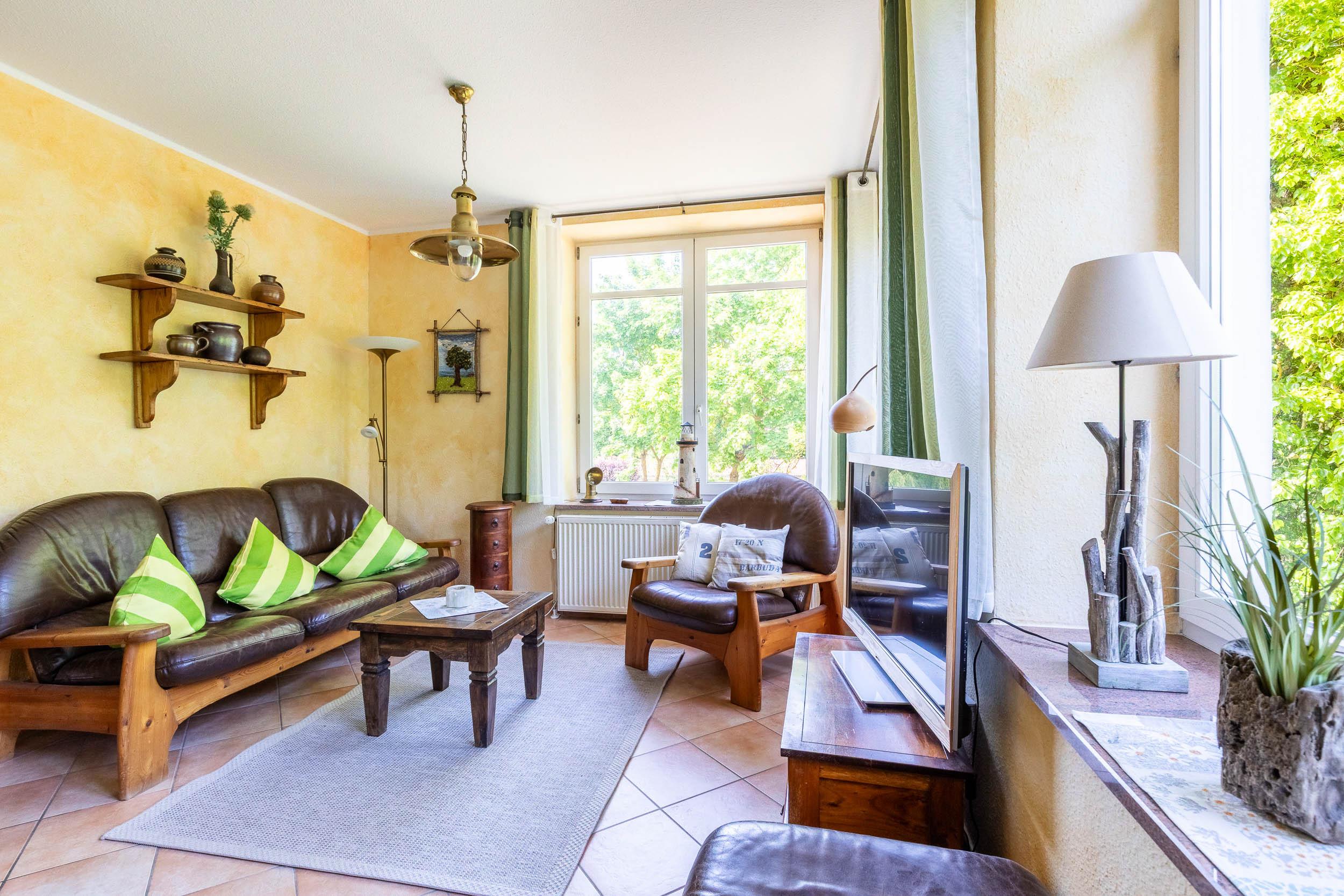 Der weitläufige Wohnbereich, welcher in warmen Farben und im Kolonialstil eingerichtet ist, umfasst eine gemütliche Sitzecke und einen bequemen Essplatz. SAT-TV (Flatscreen) sowie verschiedene Bücher sorgen für Ihre Unterhaltung.