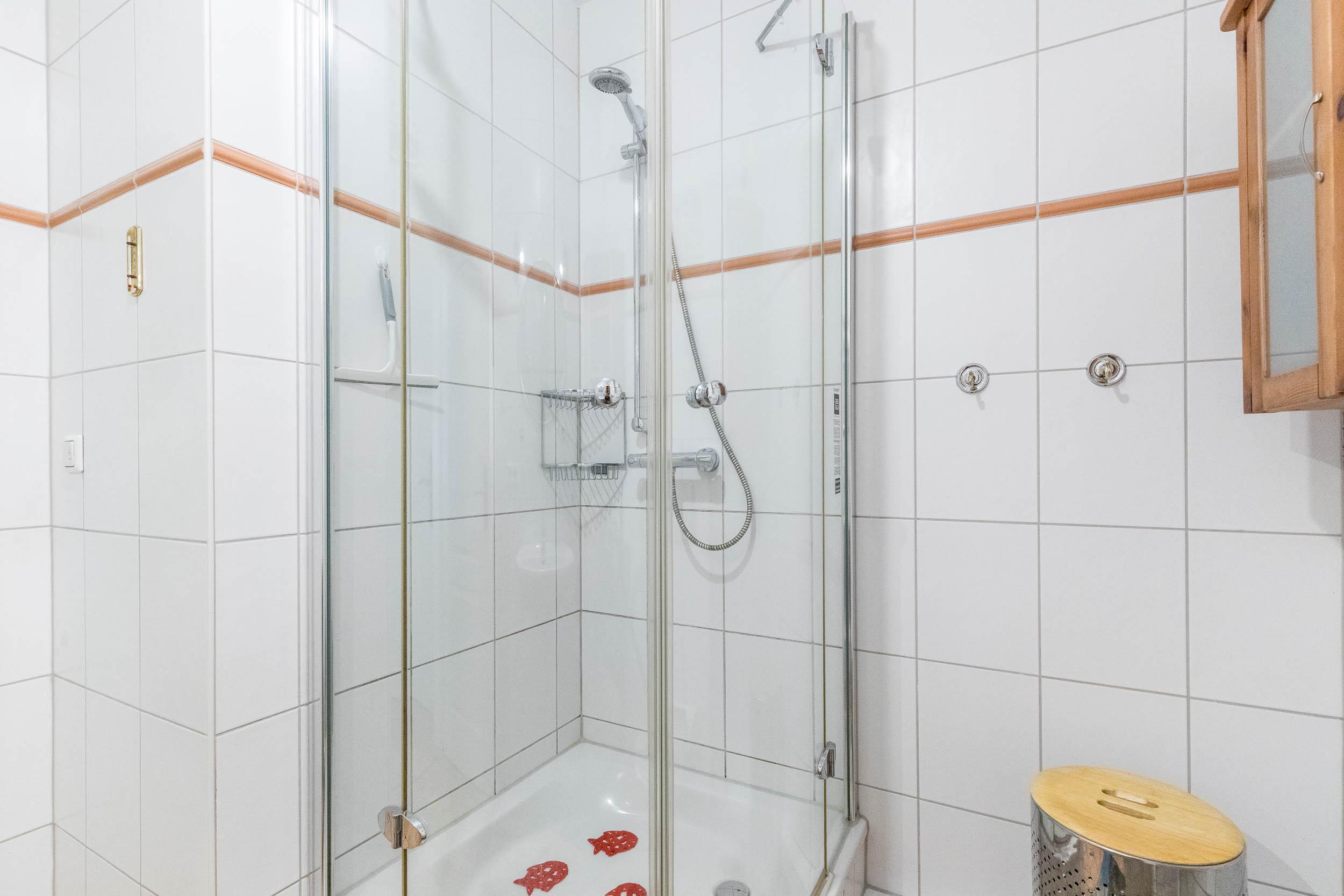 Das moderne, innenliegende Badezimmer bietet eine Dusche und WC. Die Handtuchheizung sorgt für wohlige Wärme.