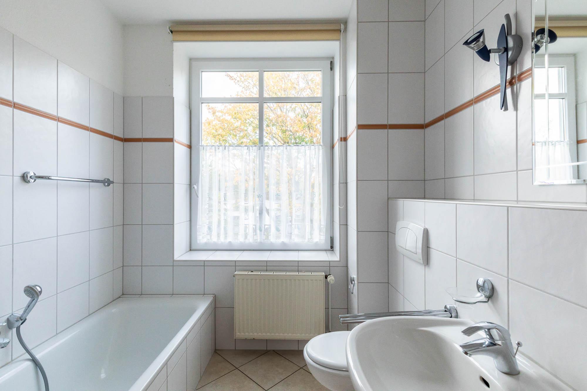 Das moderne, hell geflieste Badezimmer ist mit Dusche, Badewanne und WC ausgestattet. Das Fenster spendet zusätzliches Tageslicht und erleichtert das Lüften nach dem Baden oder Duschen.