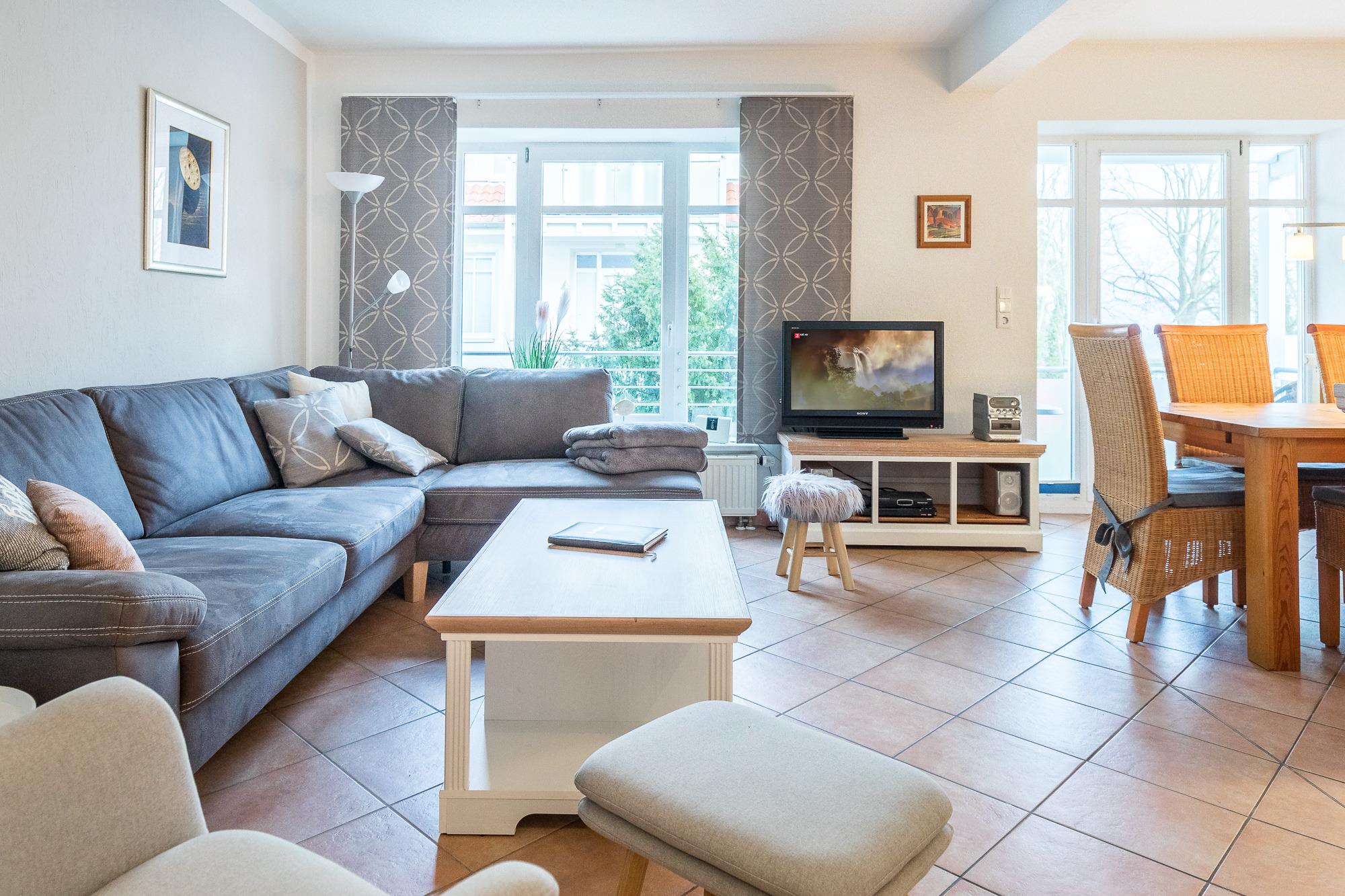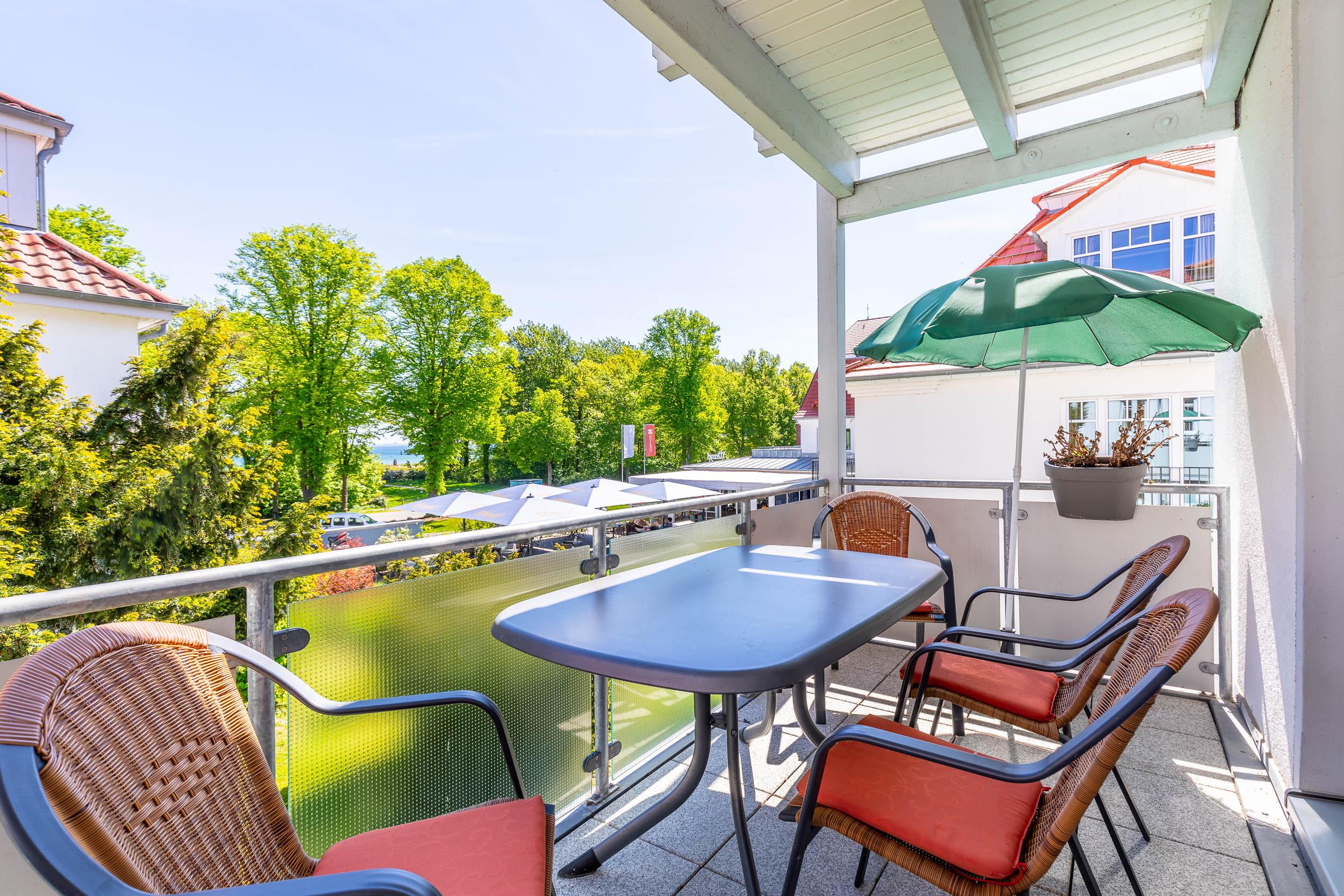 Gleich zwei möblierte Balkone (Richtung Nordost sowie Südwest), einer davon mit Meerblick, komplettieren das behagliche Urlaubsdomizil in Boltenhagen. Hier werden Sie sich wohlfühlen.