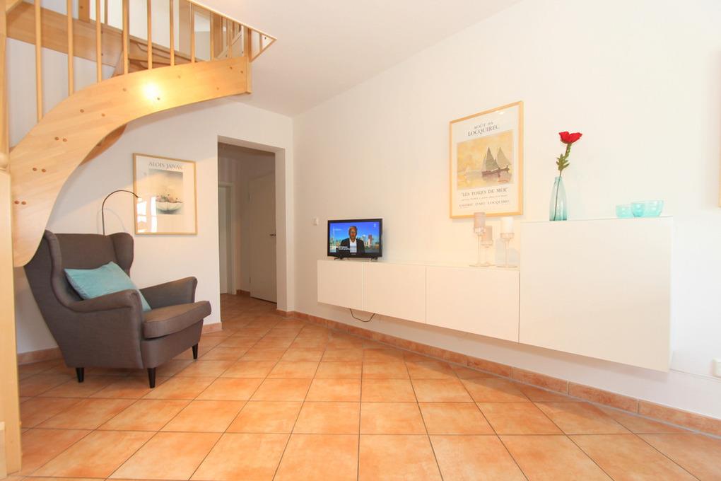 Unter der Holztreppe zum DG steht noch ein gemütlicher Sessel und ein kleiner Fernseher.