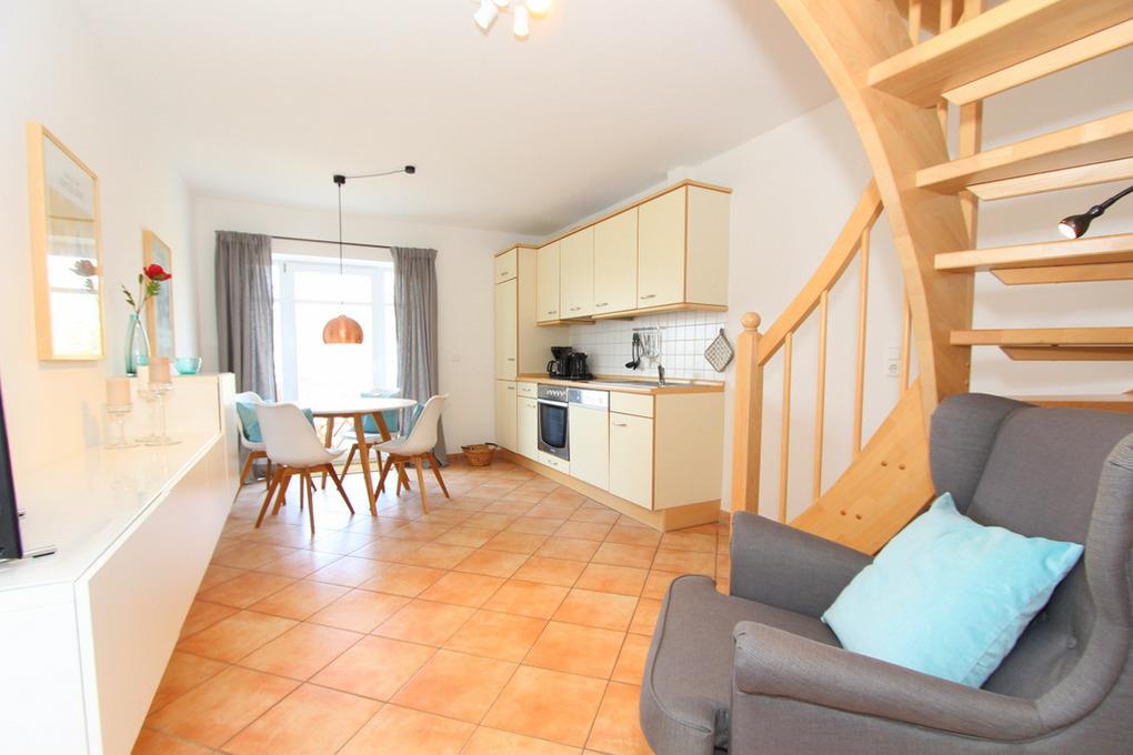 Auf der 1. Ebene (2.OG) befindet sich eine moderne Küchenzeile. Diese bietet eine sehr gute Ausstattung für eine Rund-Um-Selbstverpflegung. An der separaten Essecke lässt es sich gemütlich gemeinsam speisen.