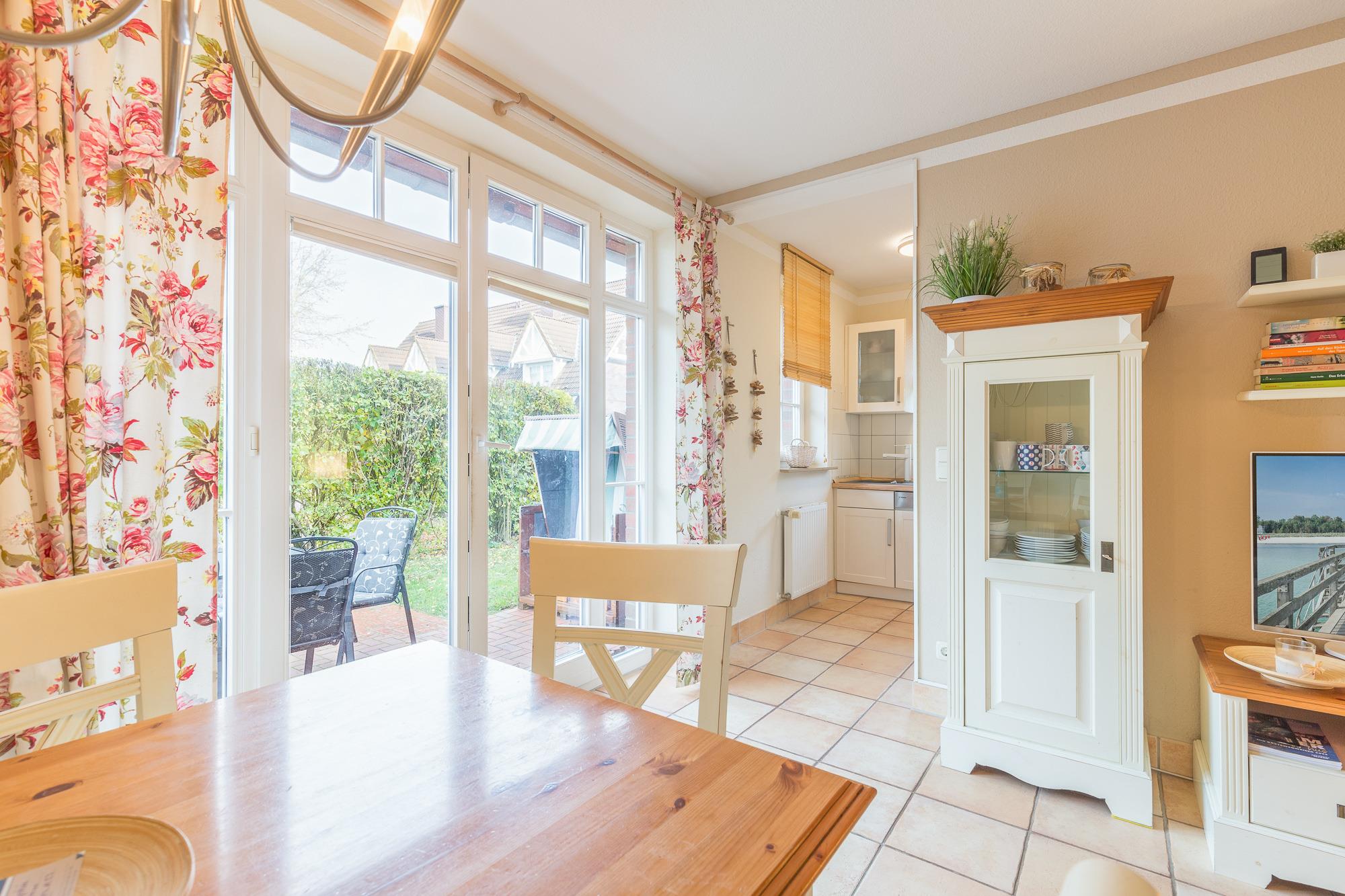 Vom Wohnzimmer aus gelangen Sie auf die begrünte, kleine Terrasse. Die vorhandene Hecke bietet Sichtschutz und Privatsphäre für das Familienfrühstück auf der Terrasse. Auf der andern Seite befindet sich der Außenstellplatz. Ein schöner Strandkorb auf der Terrasse rundet das Angebot ab.