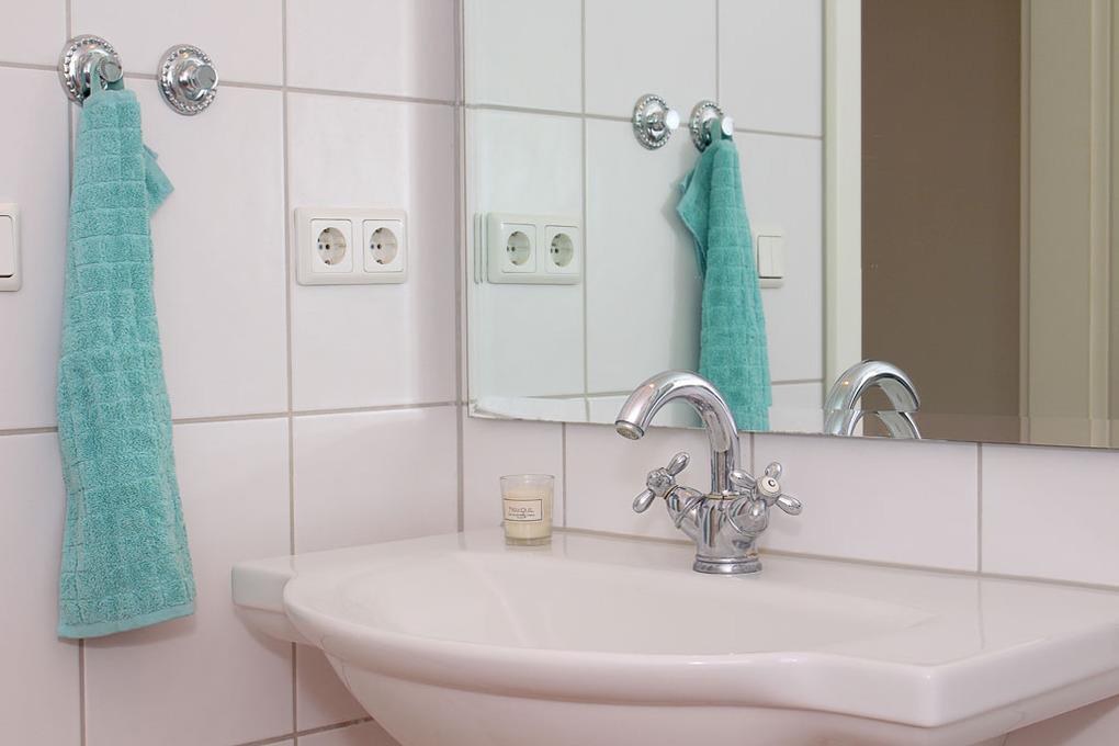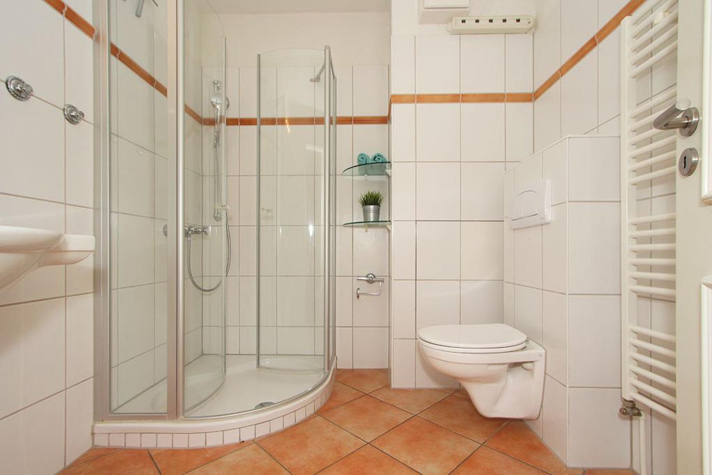 Das moderne Bad bietet eine große Dusche mit sehr niedrigem Einstieg, Waschbecken, einen Handtuchtrockner und ein WC.