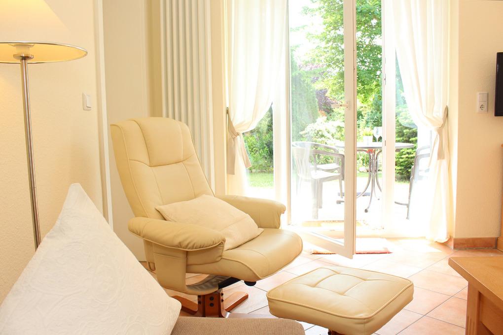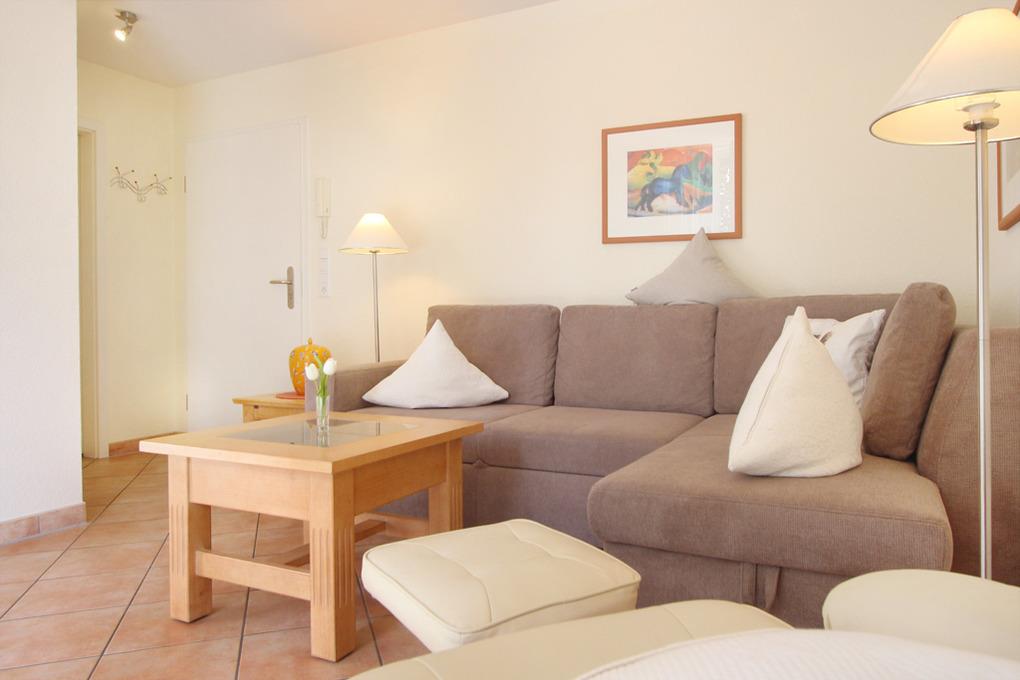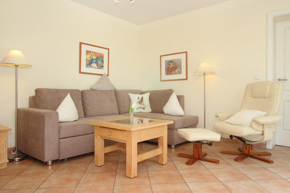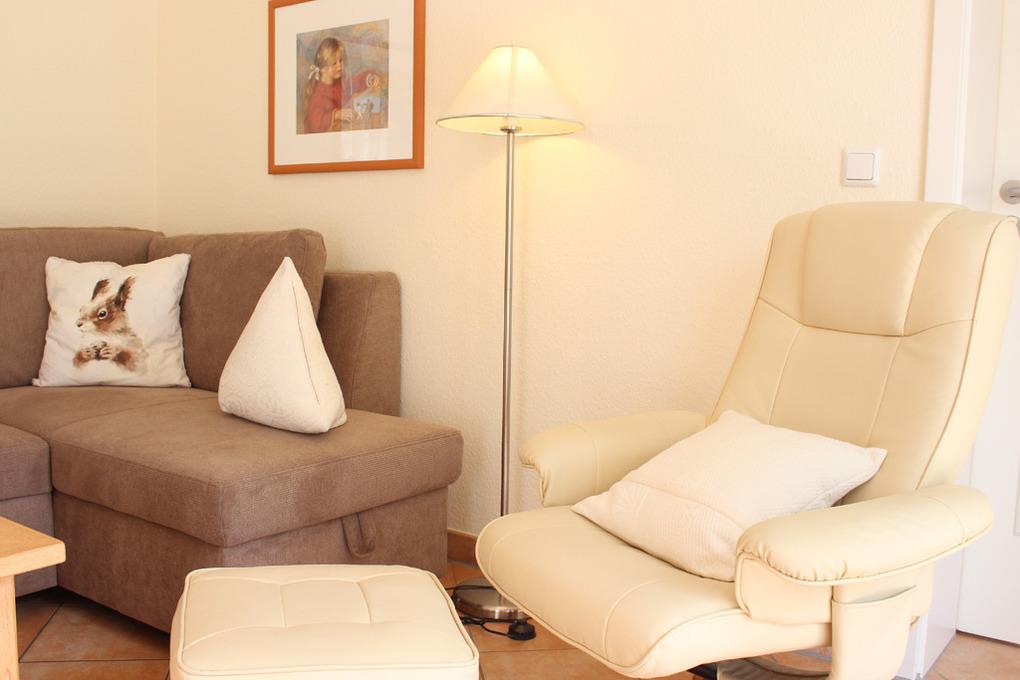 Sie verfügt über einen großzügigen harmonischen Wohnbereich mit einem schönen Sofa und einem gemütlichen Relax-Sessel. Das Sofa dient auch als weitere Schlafgelegenheit, z.B. für die dritte und max. vierte Person (Liegefläche ausgezogen 125x200cm). Flatscreen-TV und Musikanlage sorgen hier für Unterhaltung.