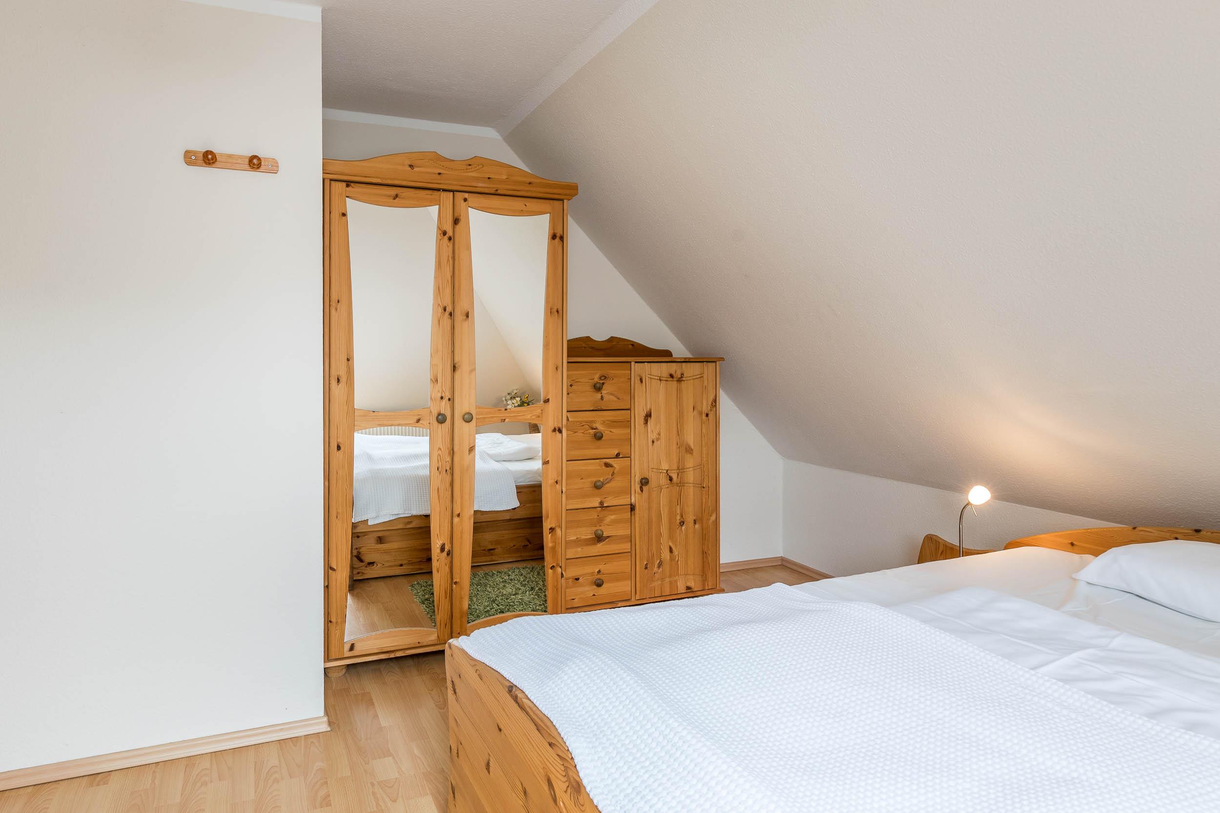 Hier erwartet Sie das Schlafzimmer mit Doppelbett (160x200cm/ Höhe 52cm), Kleiderschrank und Kommode.