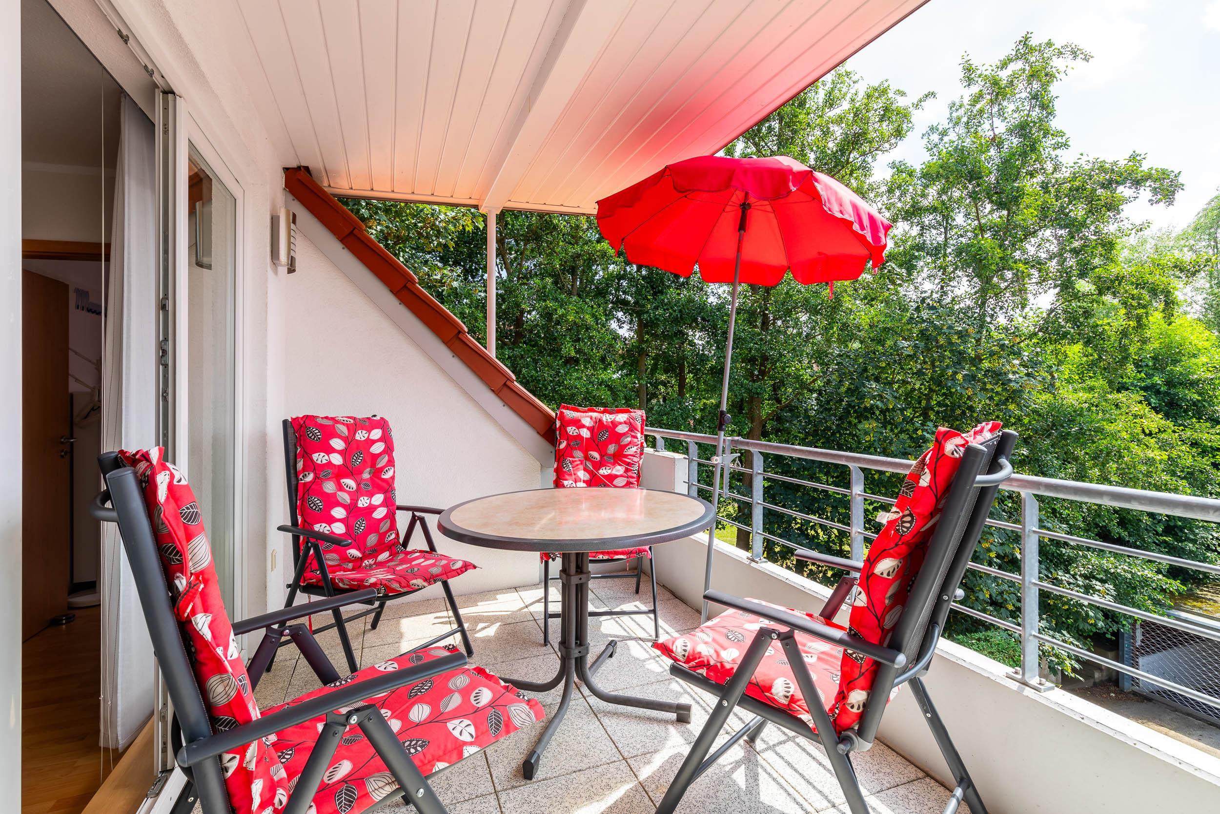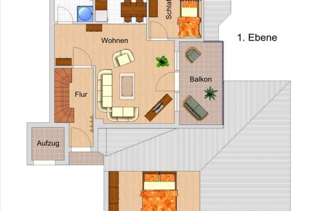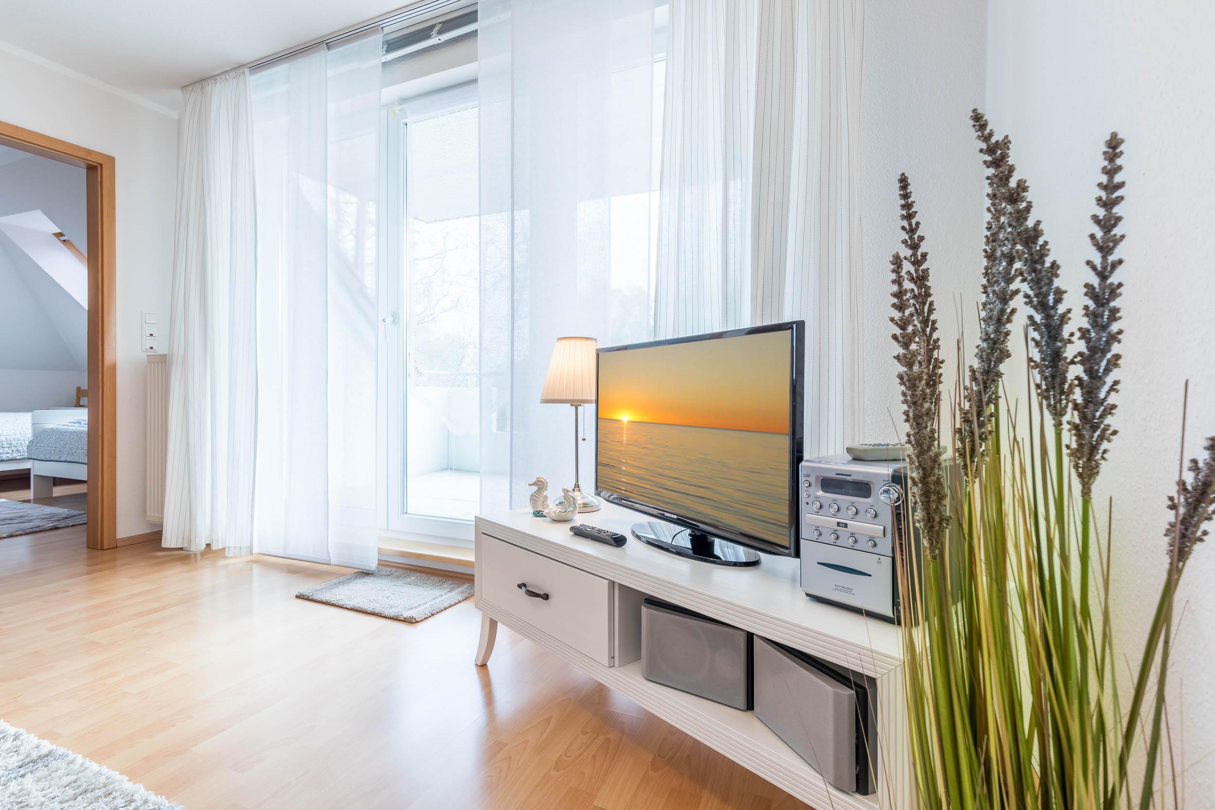 In der 1. Wohnebene (2.OG) finden sich ein behagliches Wohnzimmer mit direktem Zugang zum möblierten Südbalkon. Machen Sie es sich auf der großen Couch bequem und nutzen Sie gern den Flatscreen-TV (Sat), DVD-Player, kleine Musikanlage sowie diverse Gesellschaftsspiele und Bücher zur Unterhaltung.