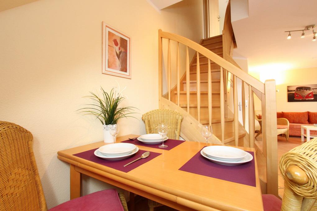 Die offene moderne Wohnküche bietet eine hervorragende Ausstattung für eine Selbstverpflegung: z.B. Backofen mit Ceranfeld-Herd, Kühlschrank mit Gefrierfach, Geschirrspüler und Mikrowelle, diverse Küchenkleingeräte uvm. An der separaten Essecke können Sie gemeinsam speisen.