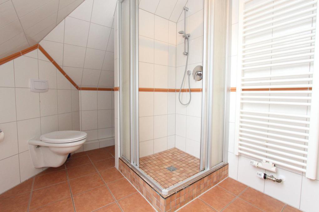 Ebenso finden Sie auf dieser unteren Wohnebene das Bad mit Dusche, WC und Fußbodenheizung. Die Handtuchheizung sorgt zusätzlich für wohlige Wärme.