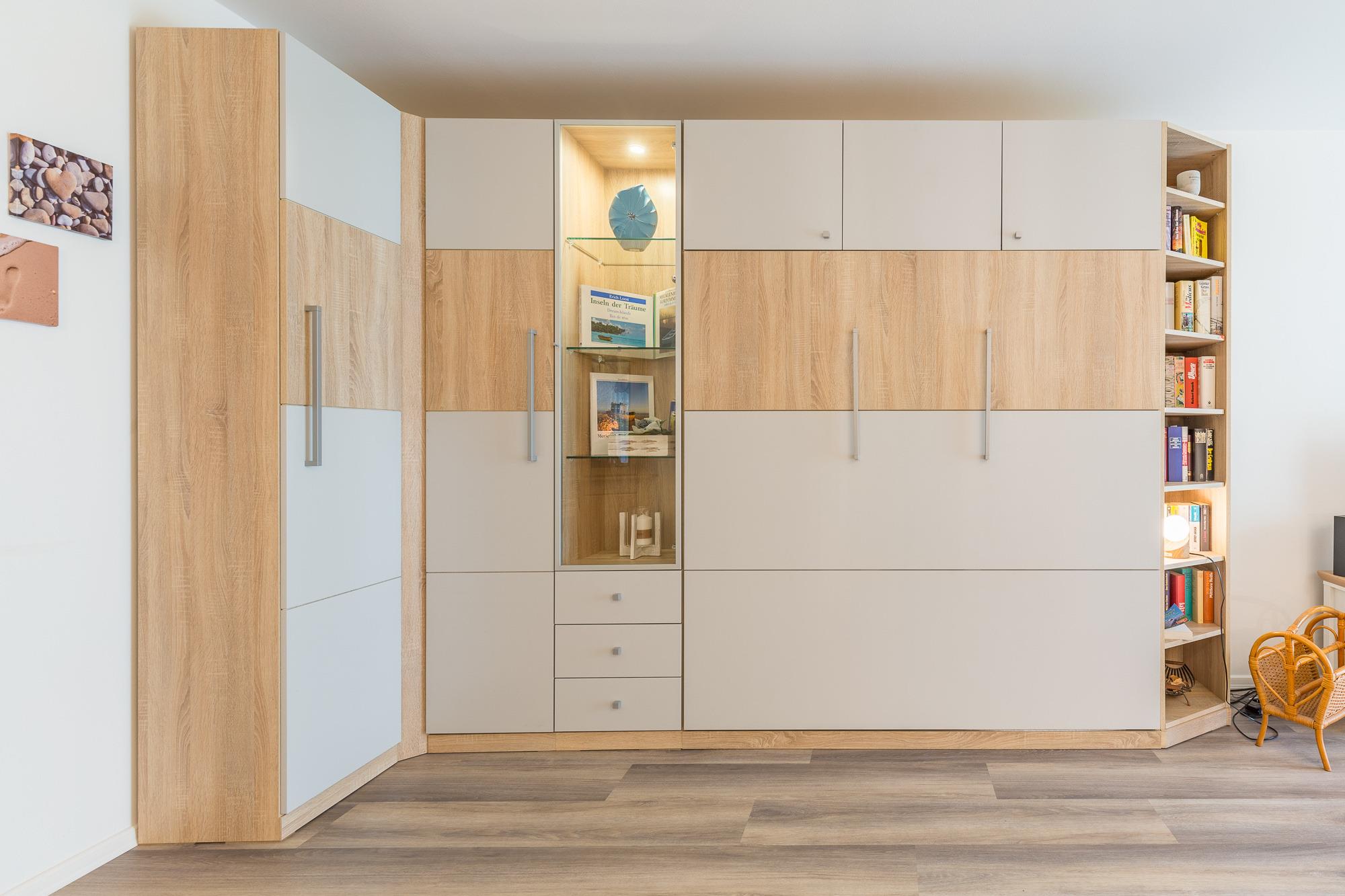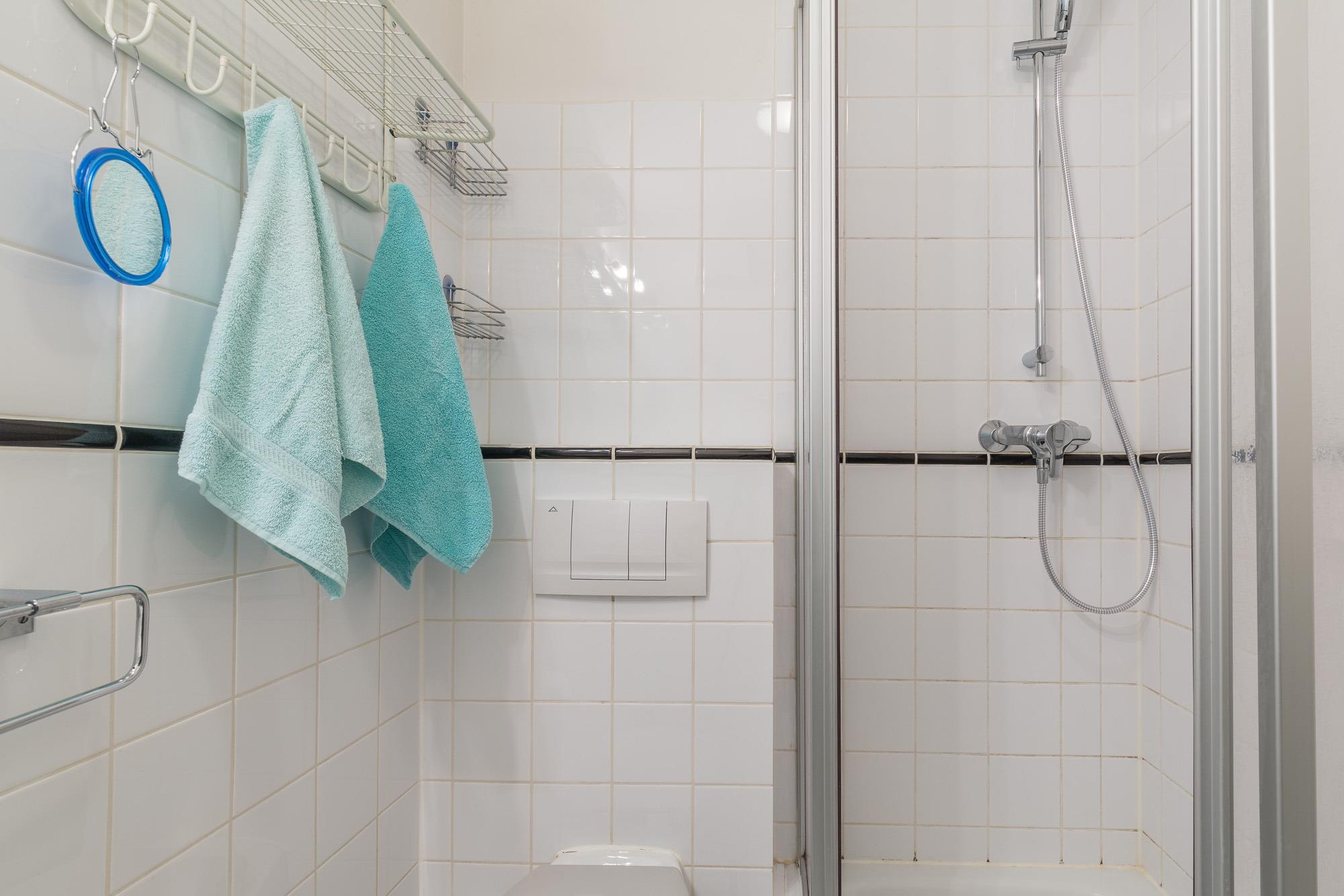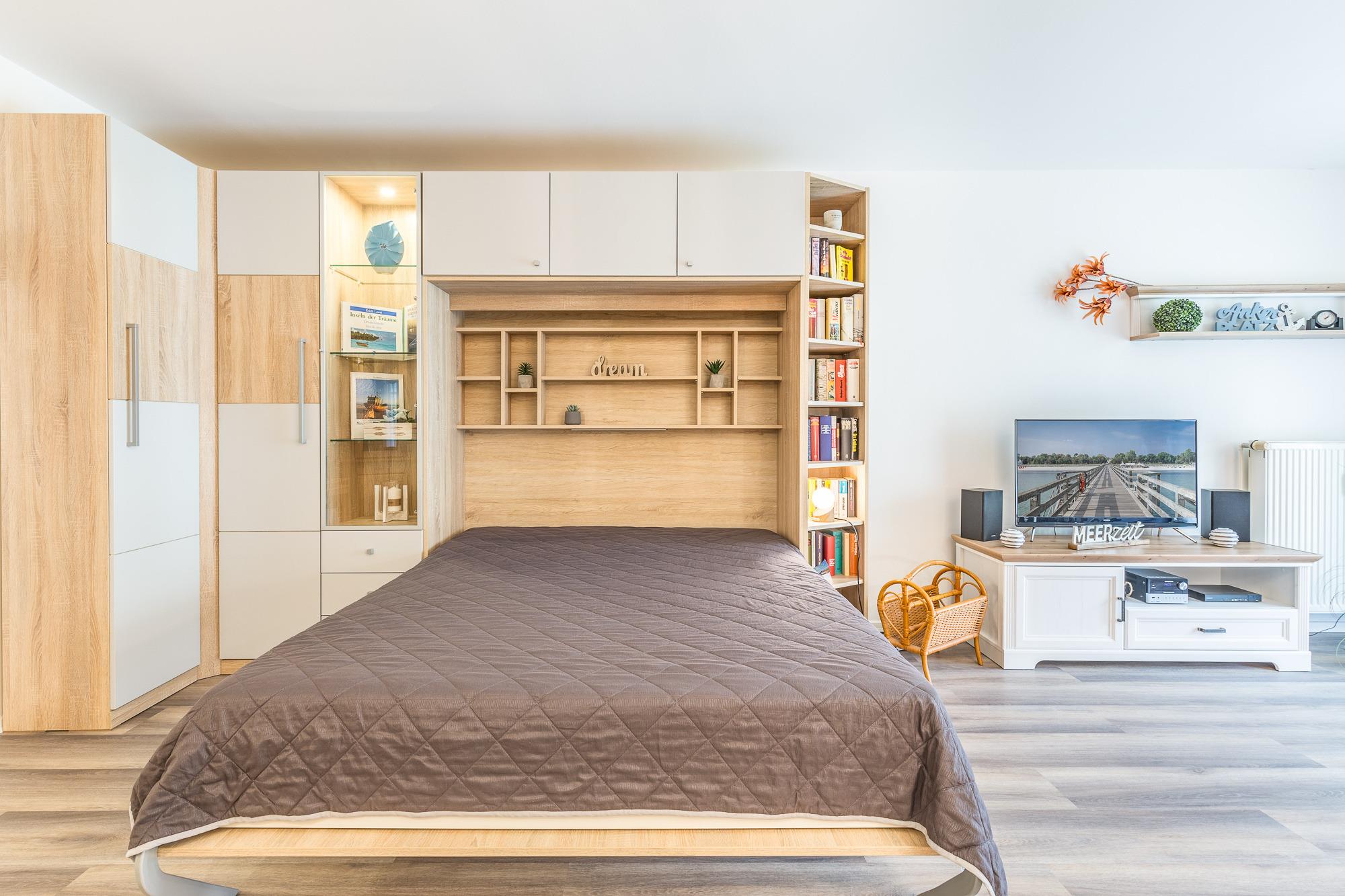 Die separate voll ausgestattete Küche ist durch ein Glaselement vom Wohn- und Schlafbereich getrennt. Das Wohnzimmer besitzt zusätzlich eine gemütliche Sofaecke zum Entspannen, sowie einen Esstisch mit 4 Stühlen. Im Wirtschaftsraum der Ferienwohnung finden Sie einen Staubsauger sowie weitere Haushaltsutensilien.