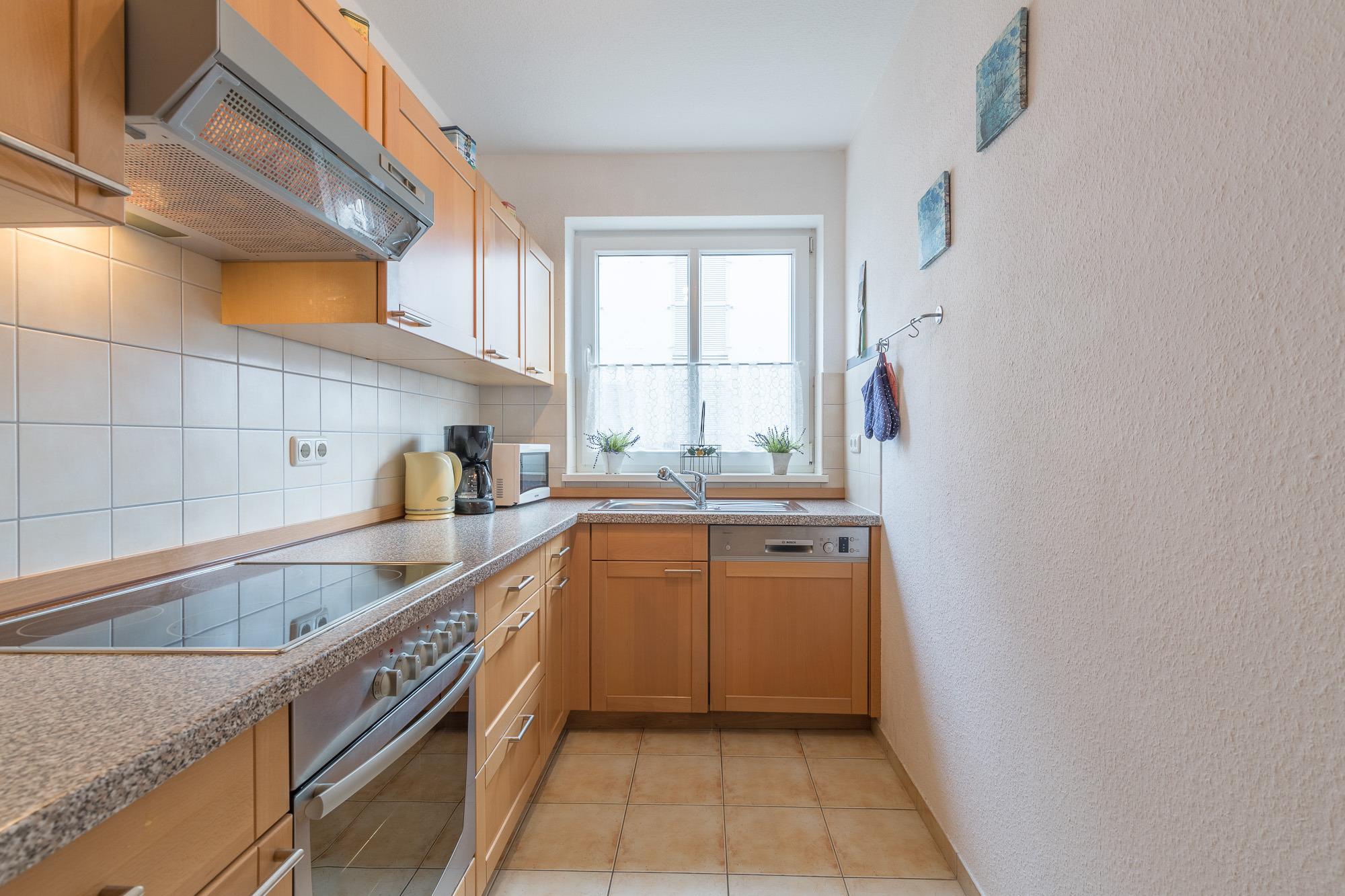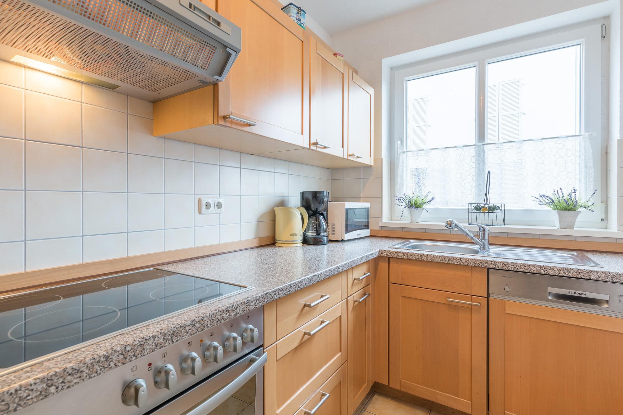 Außerdem verfügt Sie über eine separate, komplett ausgestattete Küche mit Geschirrspülmaschine sowie ein komfortables Badezimmer mit Badewanne und Dusche. Eine Waschmaschine ist ebenfalls vorhanden und kann kostenlos von Ihnen genutzt werden. Der große Balkon ist zur Südseite gelegen.
