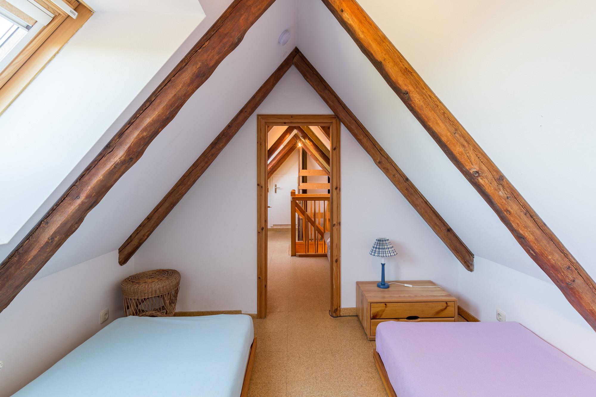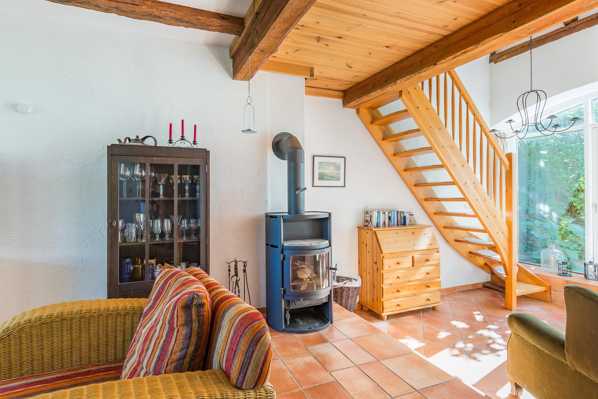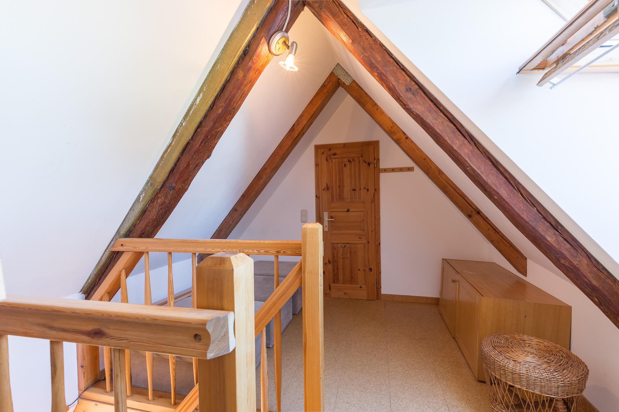 Über eine Treppe aus dem Kaminzimmer gelangt man in das Dachgeschoss mit einer niedrigen Raumhöhe. Hier stehen nochmals 2 bis 3 Schlafmöglichkeiten zur Verfügung. Das Schlafzimmer mit dem Doppelbett befindet sich in der unteren Ebene. Eine Terrasse mit Sitzgelegenheiten steht zur Verfügung. Auf dem Grundstück befindet sich ein separates Gebäude, in dem eine Sauna mit Ruheraum (gegen Gebühr) und eine Waschmaschine vorhanden ist.