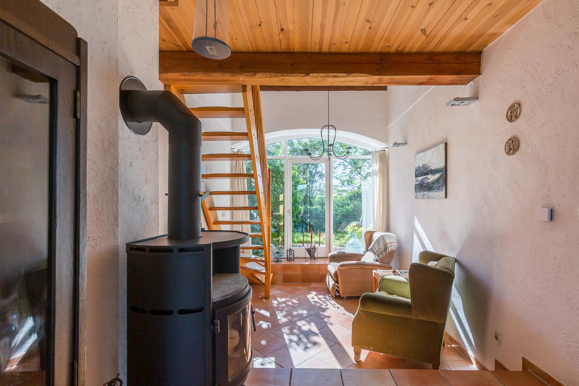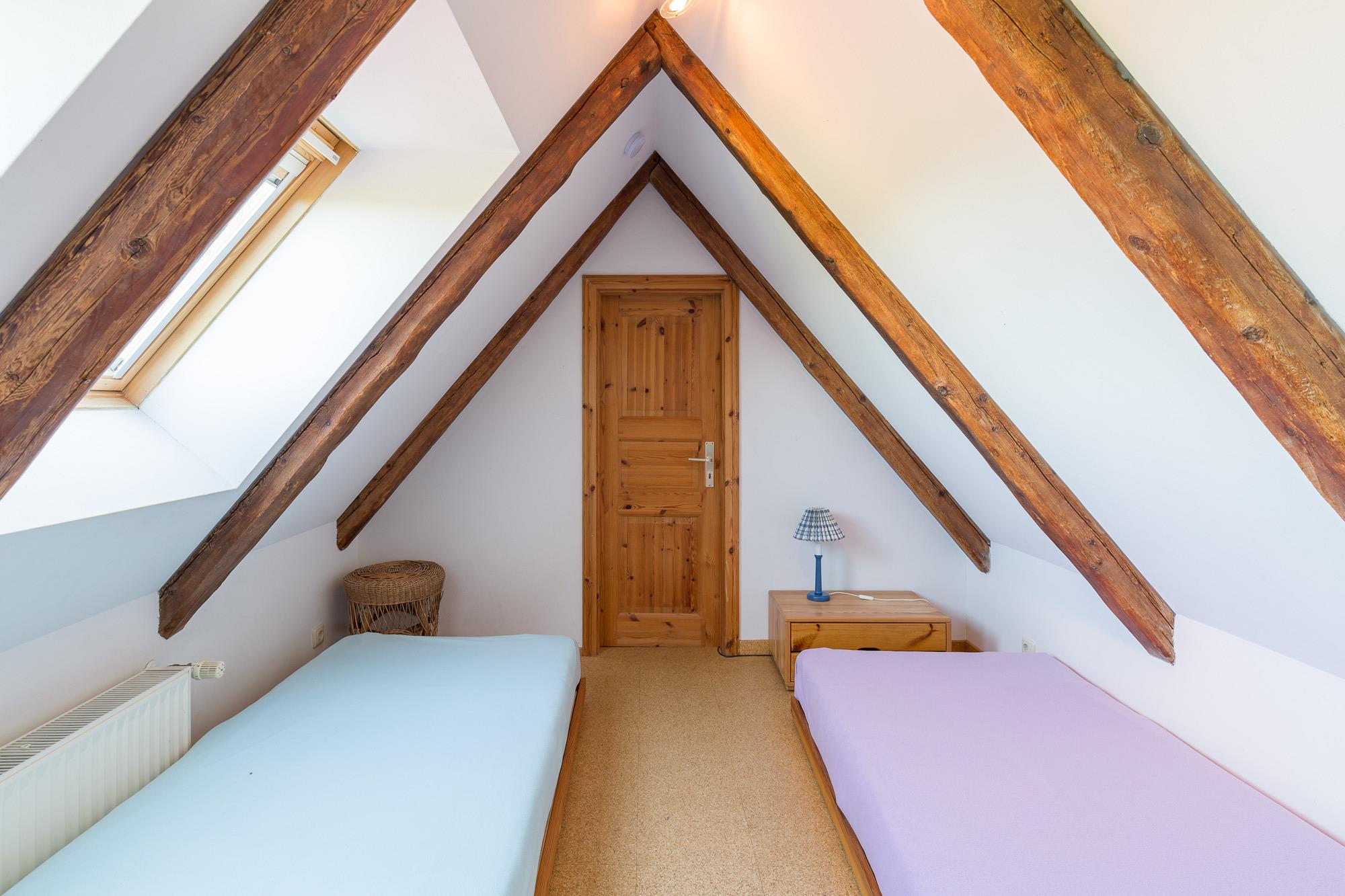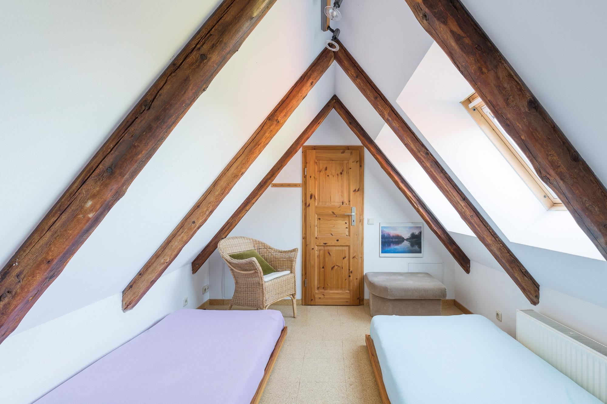 Über eine Treppe aus dem Kaminzimmer gelangt man in das Dachgeschoss mit einer niedrigen Raumhöhe. Hier stehen nochmals 2 bis 3 Schlafmöglichkeiten zur Verfügung. Das Schlafzimmer mit dem Doppelbett befindet sich in der unteren Ebene. Eine Terrasse mit Sitzgelegenheiten steht zur Verfügung. Auf dem Grundstück befindet sich ein separates Gebäude, in dem eine Sauna mit Ruheraum (gegen Gebühr) und eine Waschmaschine vorhanden ist.