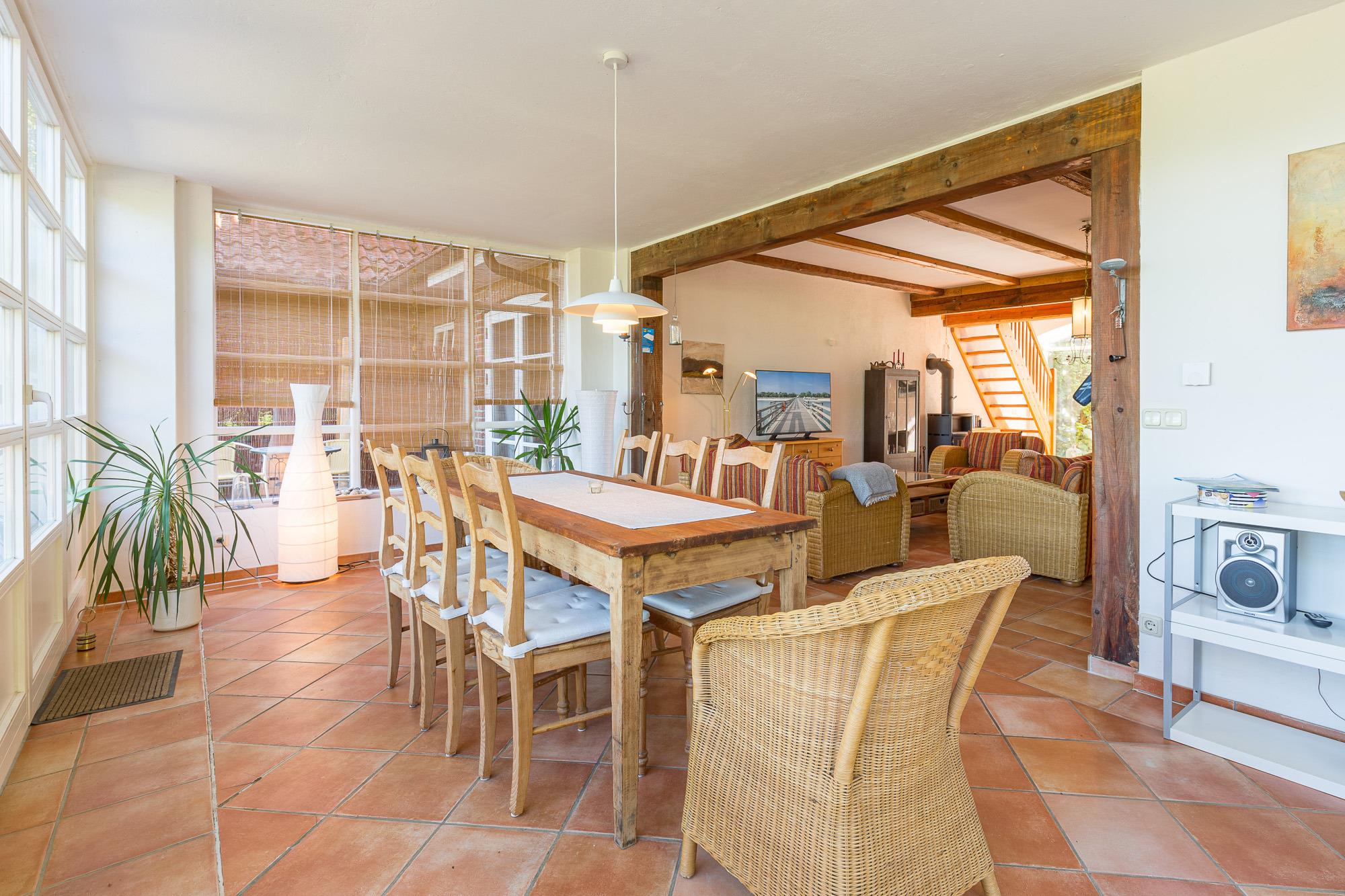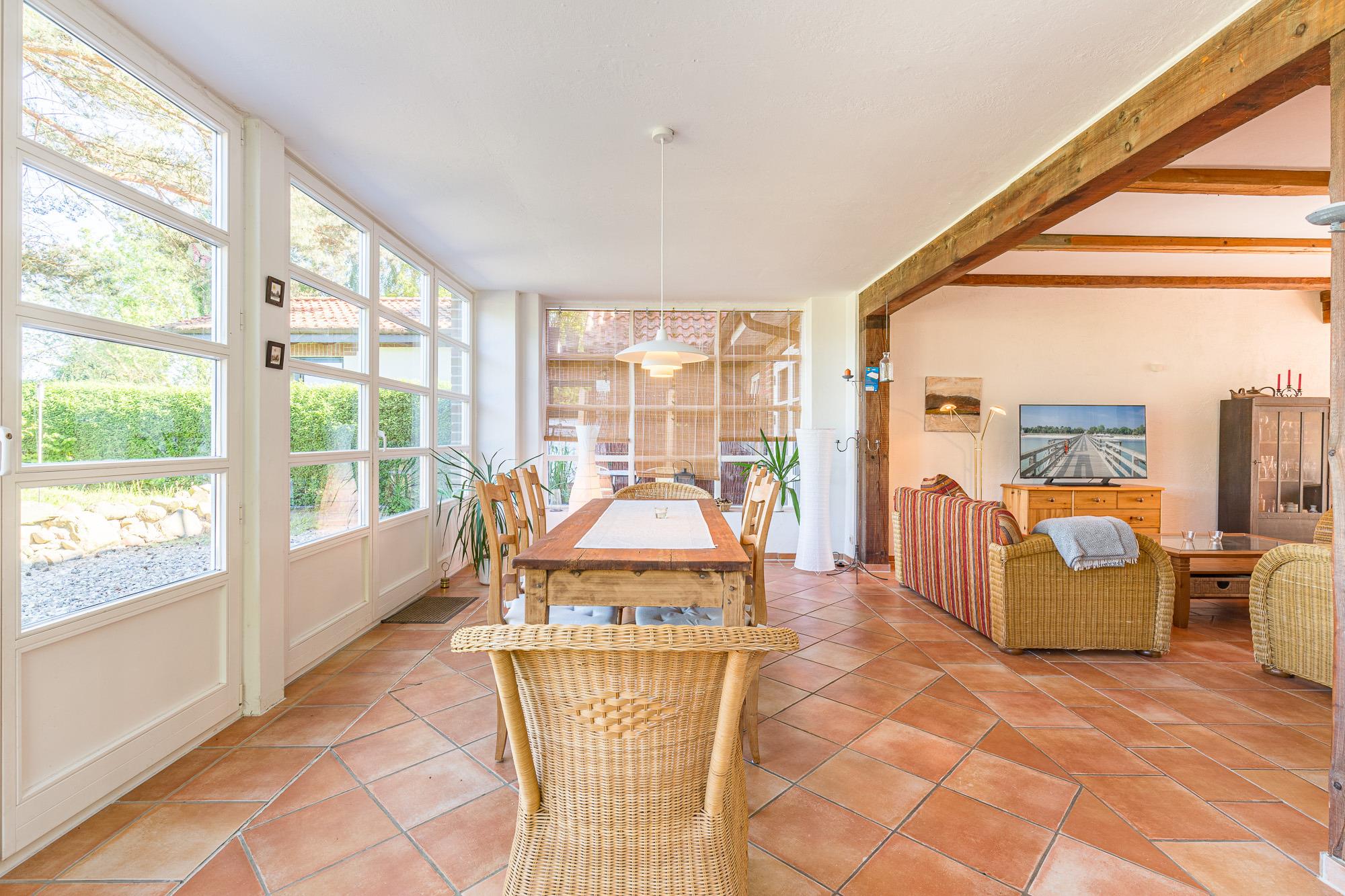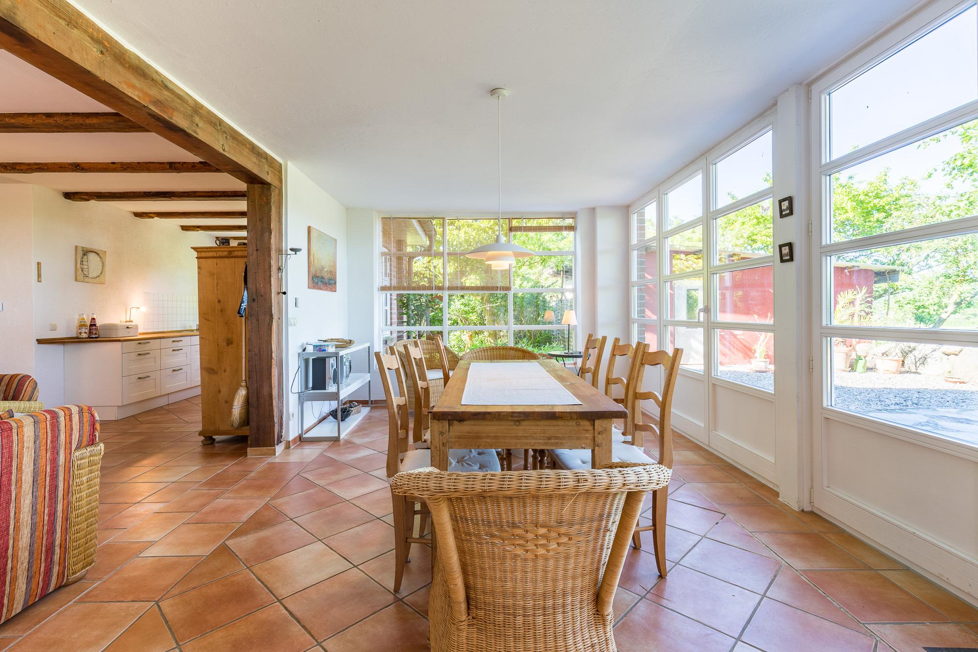 Die Wohnung 01 ist mit 90 m² die größte Ferienwohnung im Erdgeschoss. Sie verfügt über einen Wintergarten mit grossem Esstisch und einem gemütlichem Kaminzimmer. Die Küche ist offen an den Wohnbereich angegliedert.