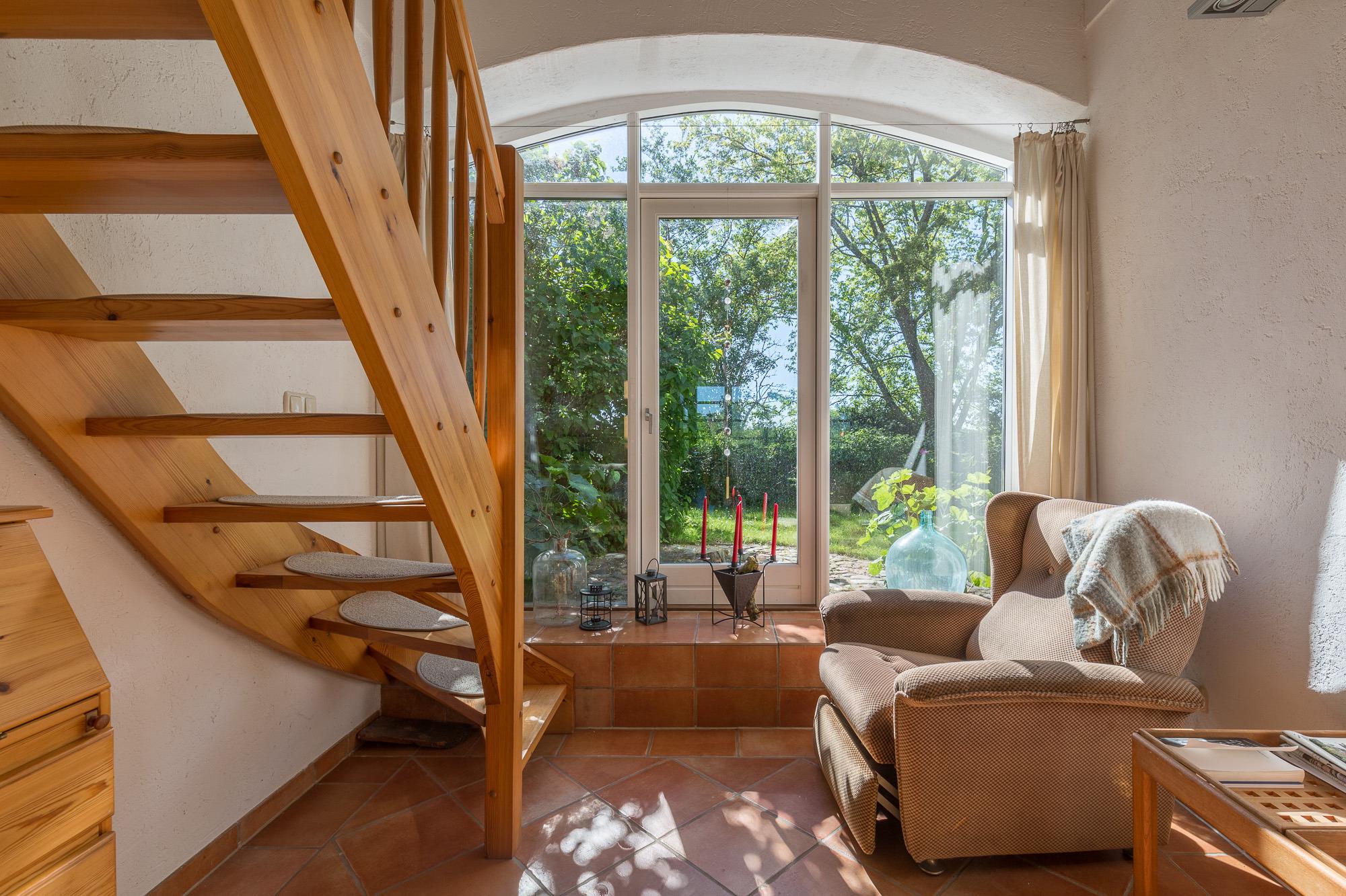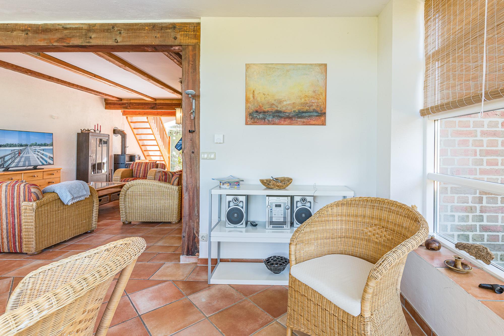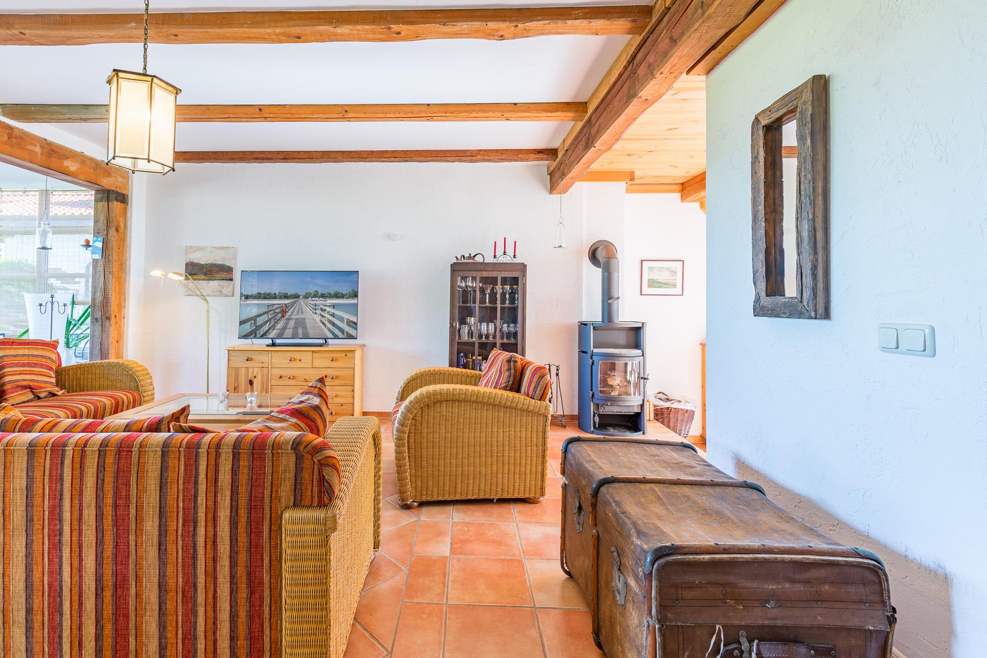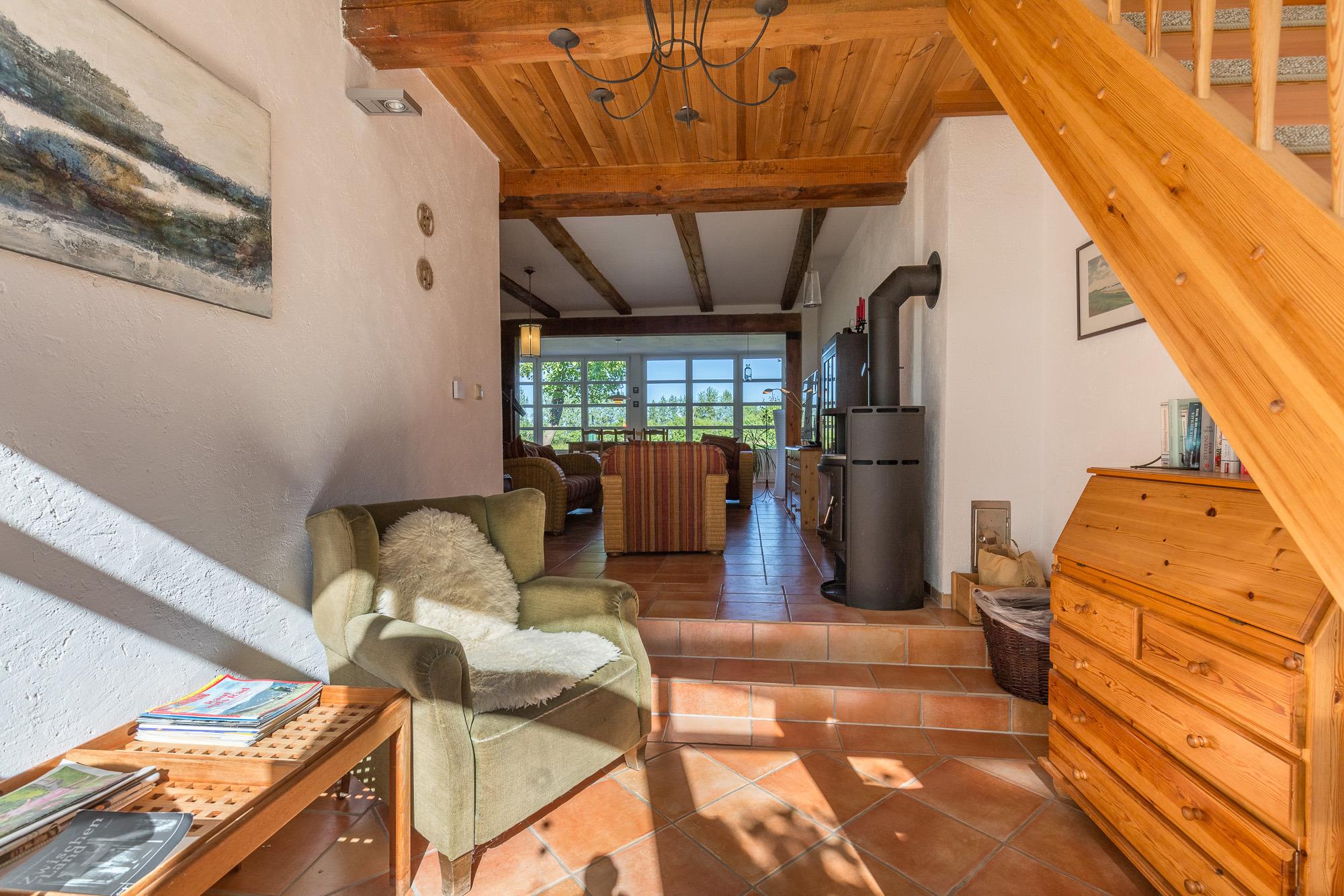 Die Wohnung 01 ist mit 90 m² die größte Ferienwohnung im Erdgeschoss. Sie verfügt über einen Wintergarten mit grossem Esstisch und einem gemütlichem Kaminzimmer. Die Küche ist offen an den Wohnbereich angegliedert.