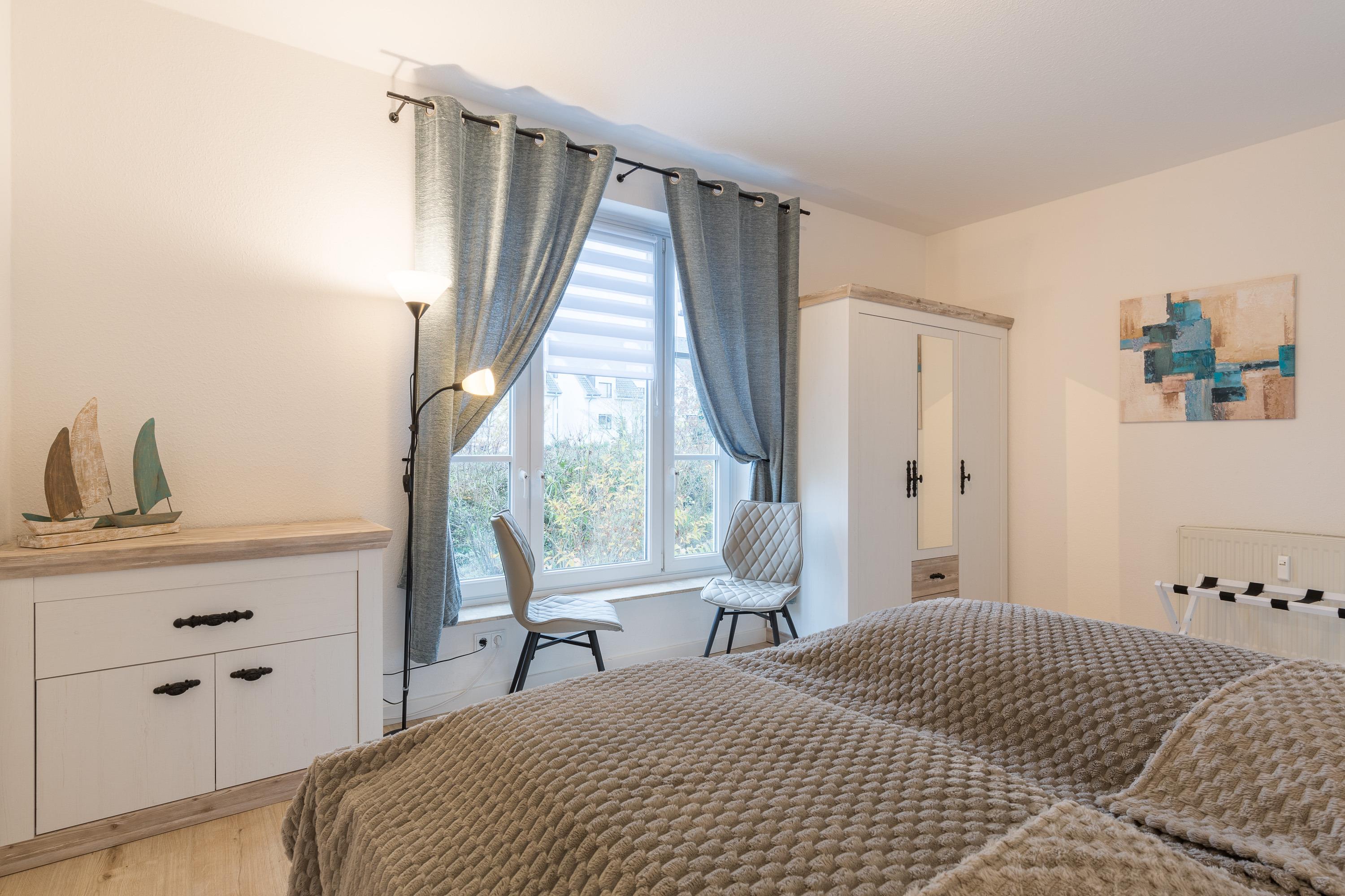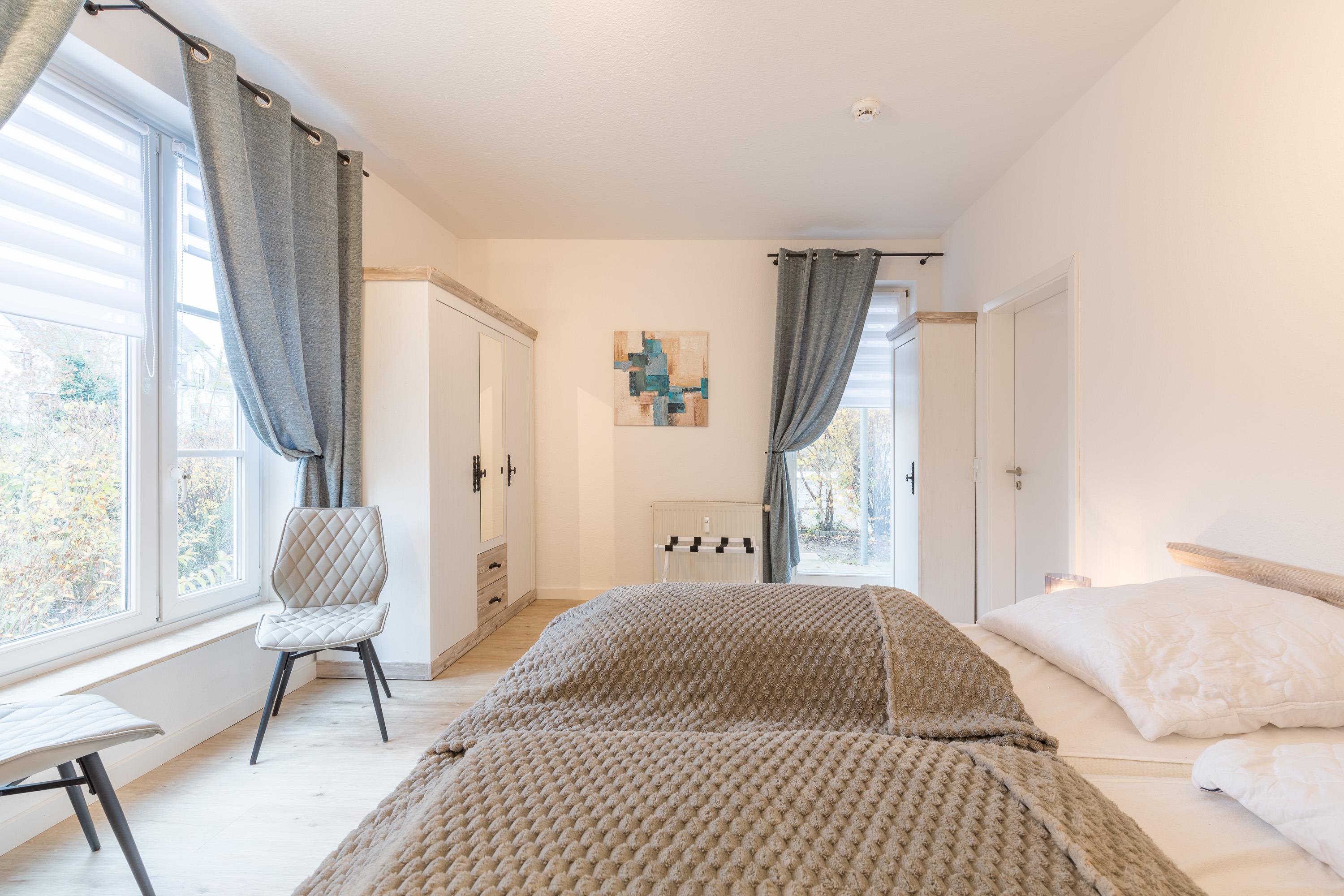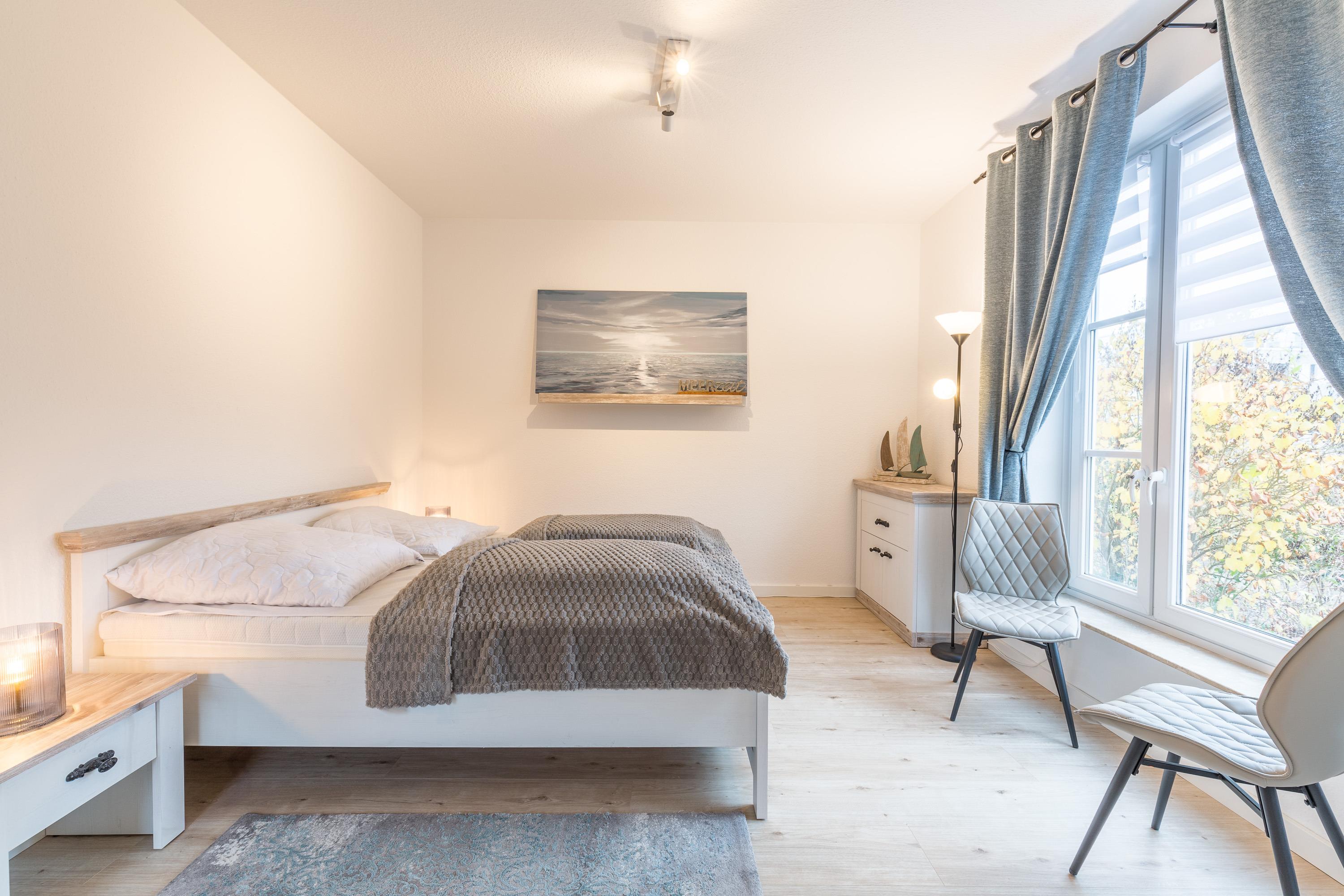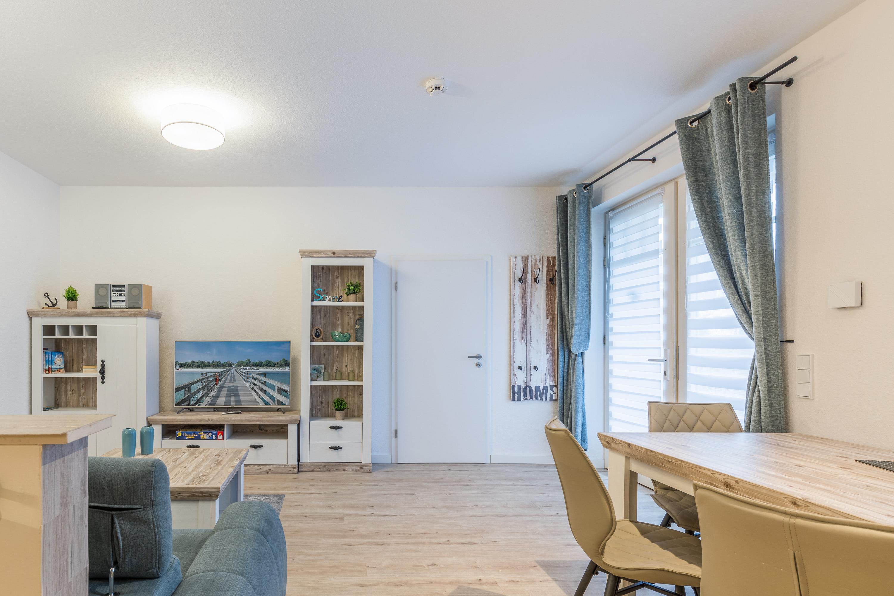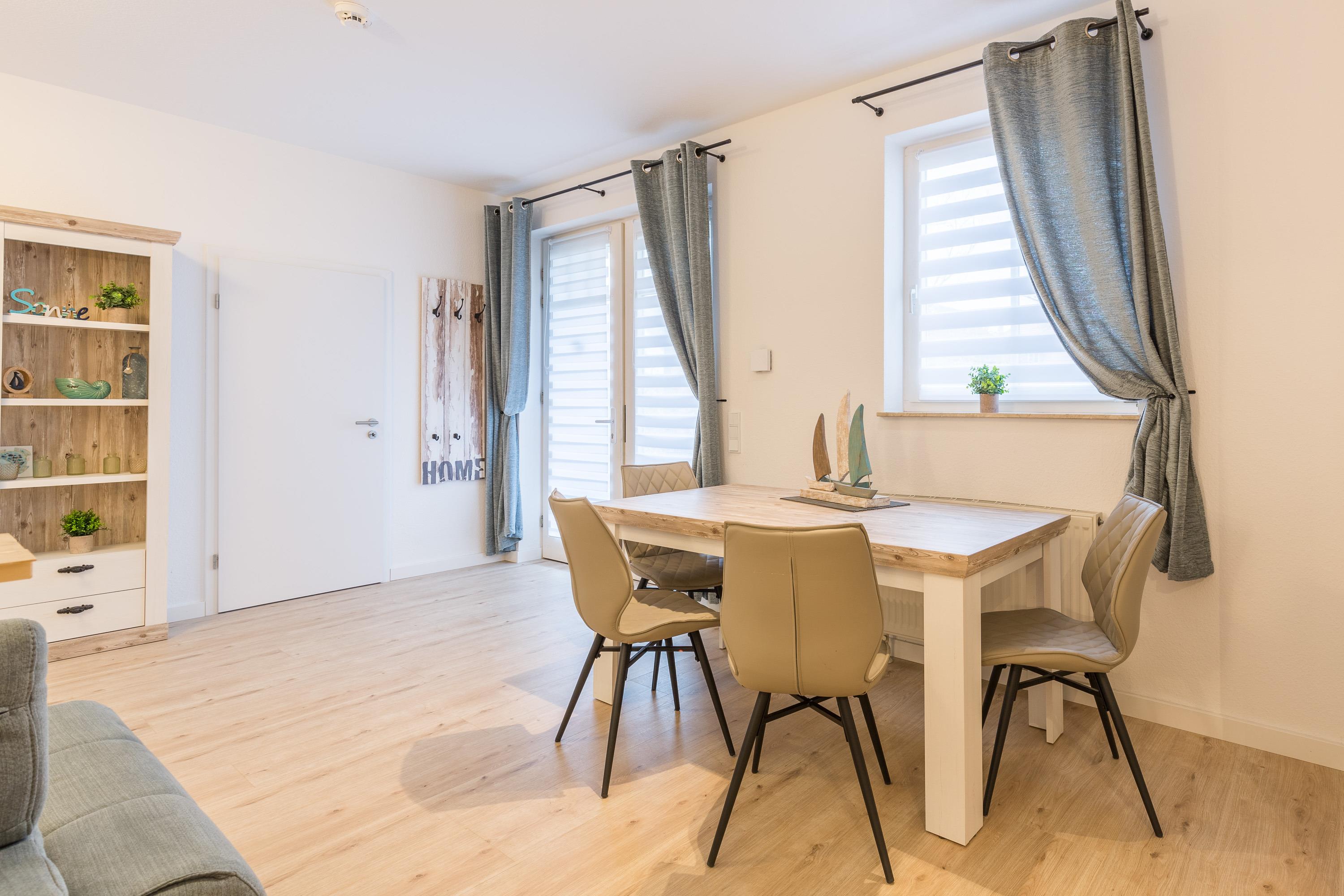 Das Schlafzimmer und das Duschbad mit bodengleicher Dusche haben eine großzügige Raumgröße. Im großen Wohnbereich befinden sich Essbereich und die moderne Einbauküche. Sie ist offen gestaltet und bietet einen schönen Blick in den angrenzenden Wohnraum. Der Geschirrspüler hilft beim Abwasch. Filter-Kaffeemaschine, Wasserkocher und Toaster zählen zur Grundausstattung in unseren Ferienwohnungen.