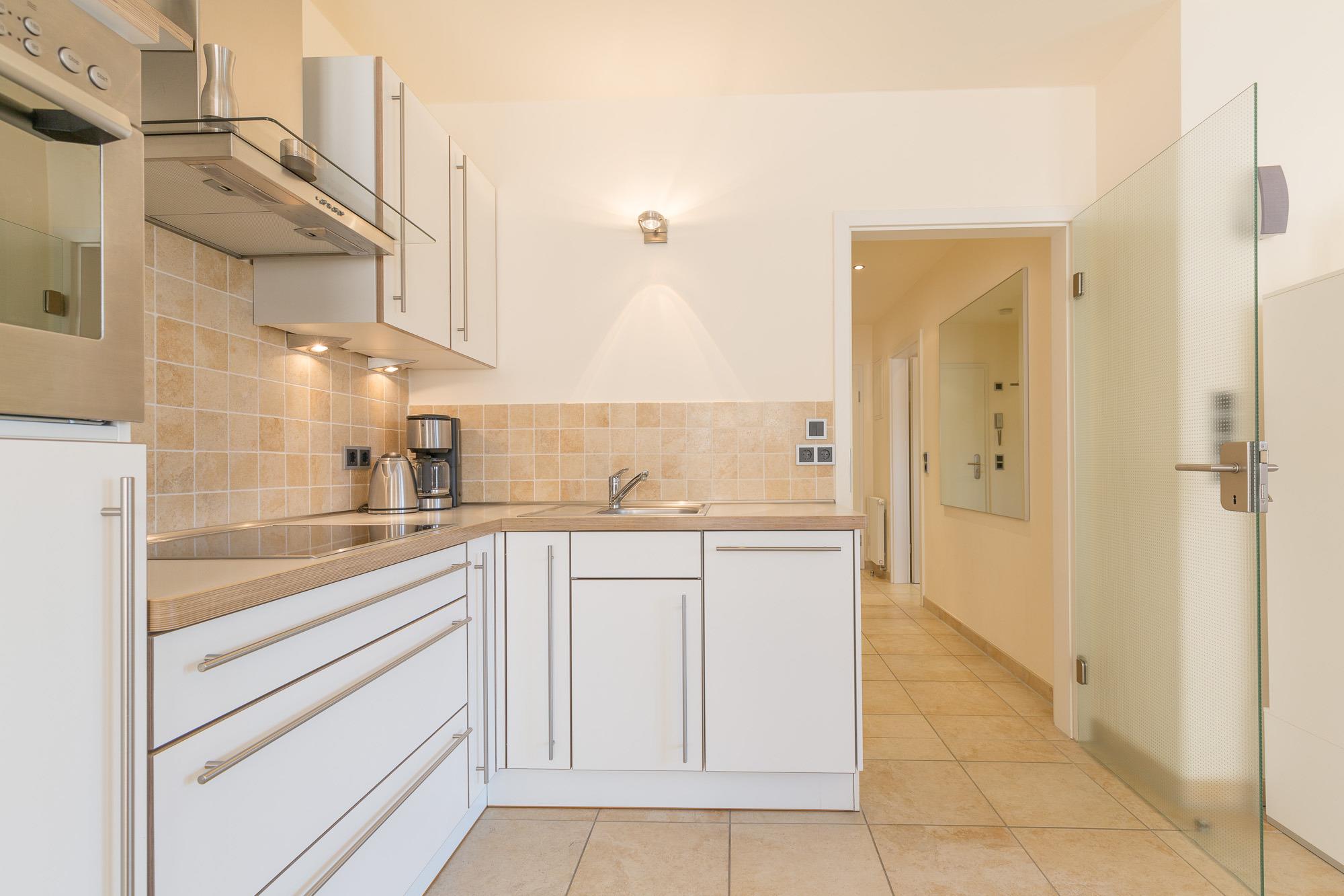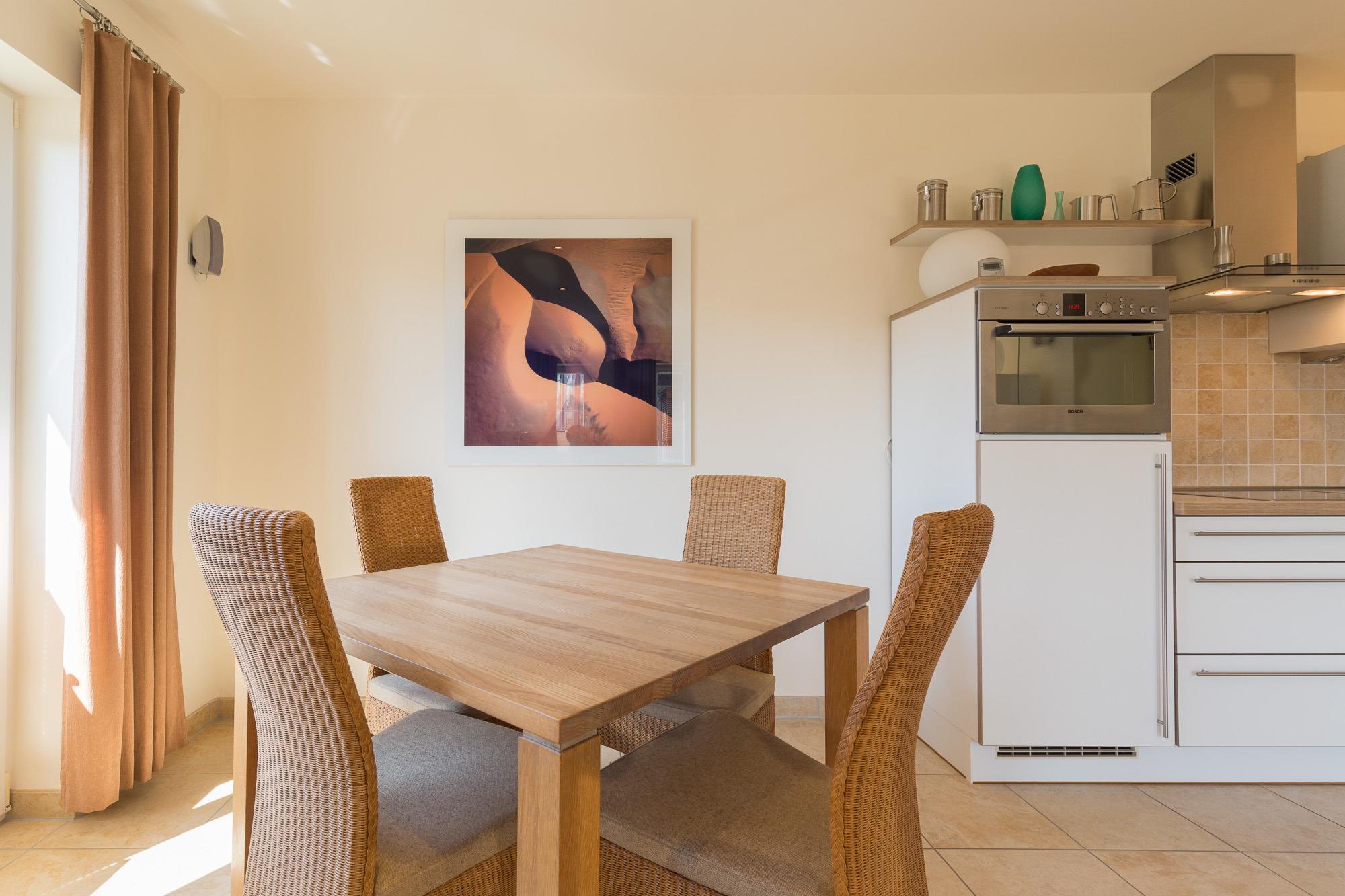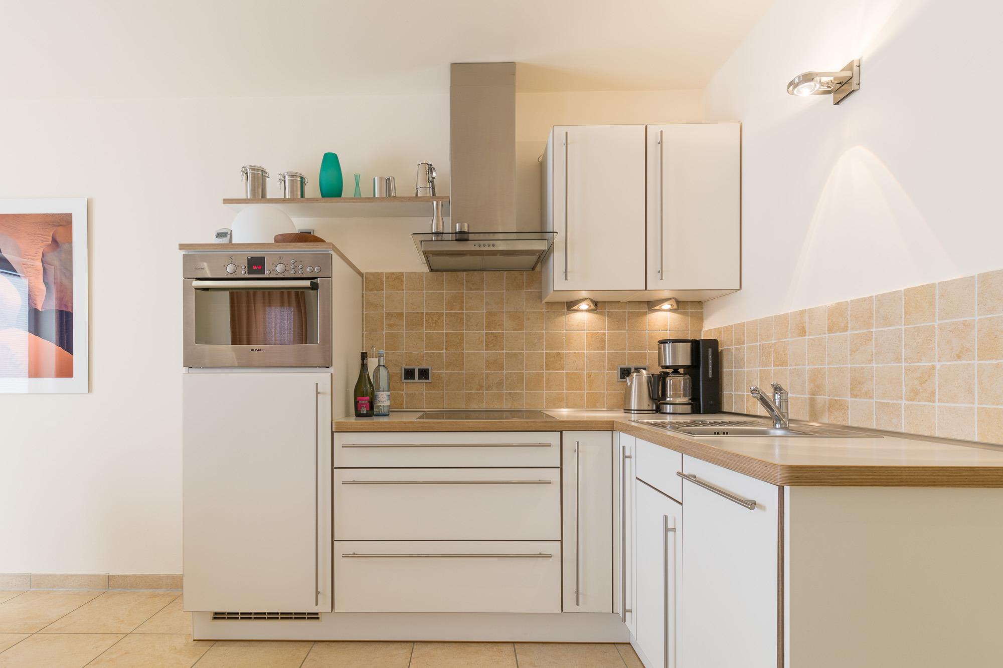 Die Ferienwohnung Nr. 4 liegt im 1. Obergeschoss zur Ostseite und ist 47 m² groß. Sie ist modern und mit hochwertigen Möbeln ausgestattet und verfügt über eine komfortable Küchenzeile mit Backofen, Geschirrspülmaschine und Mikrowelle sowie ein Bad mit Dusche und WC.