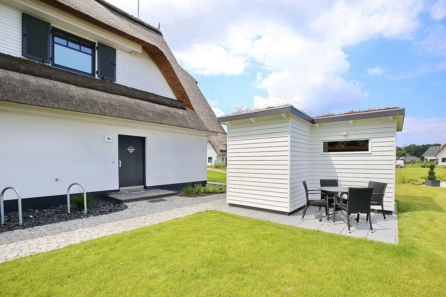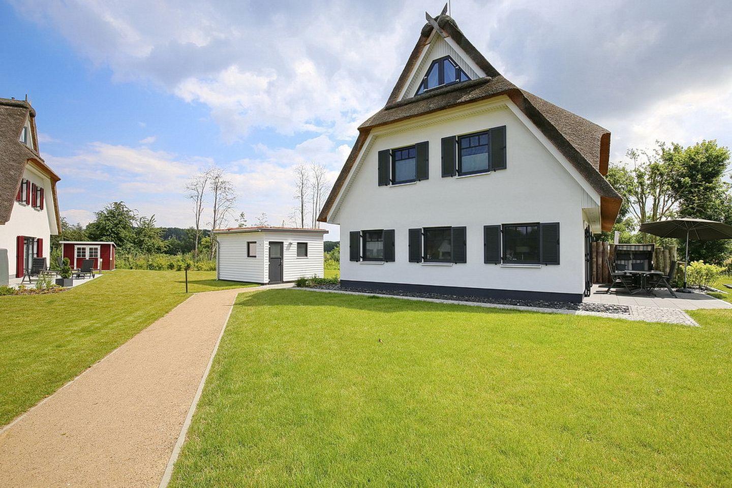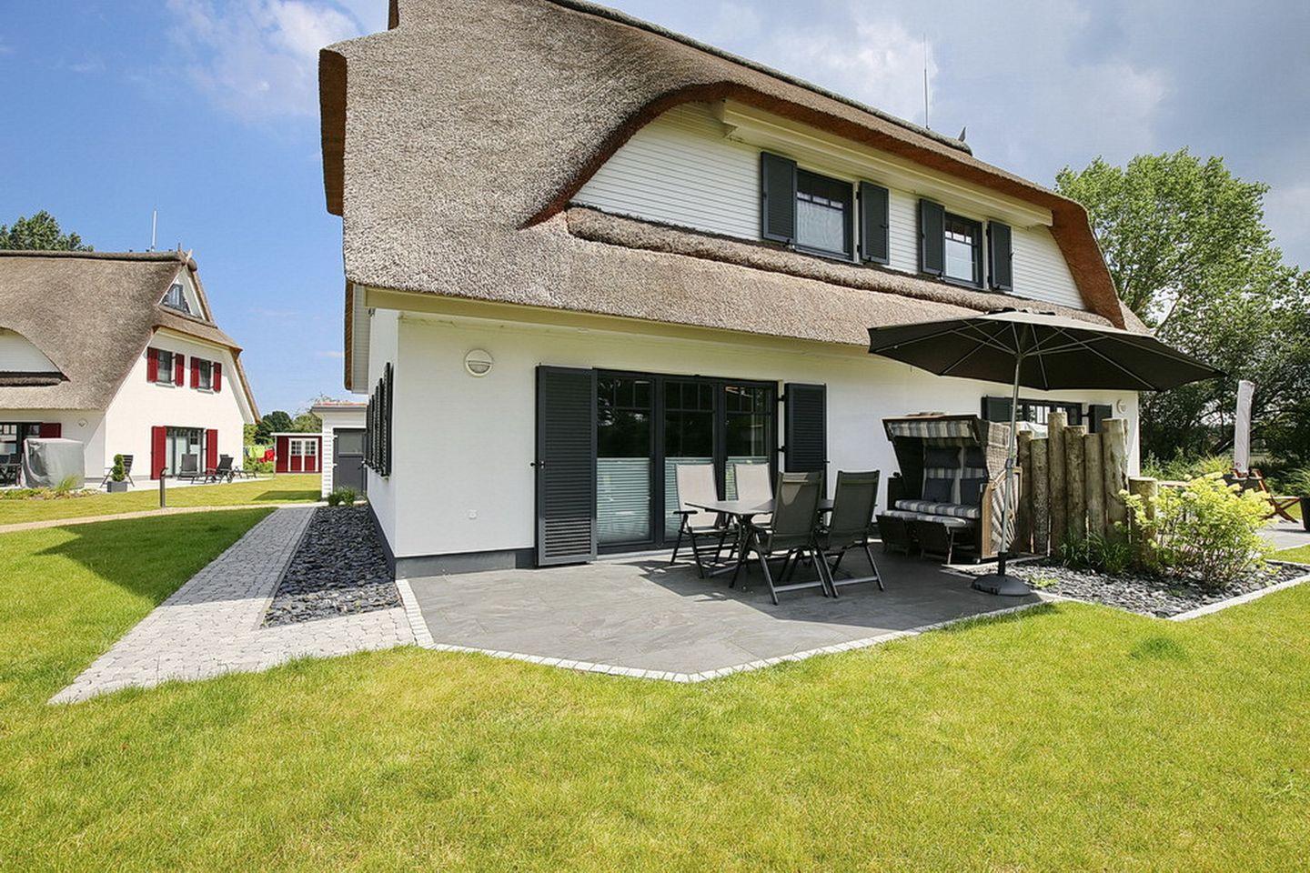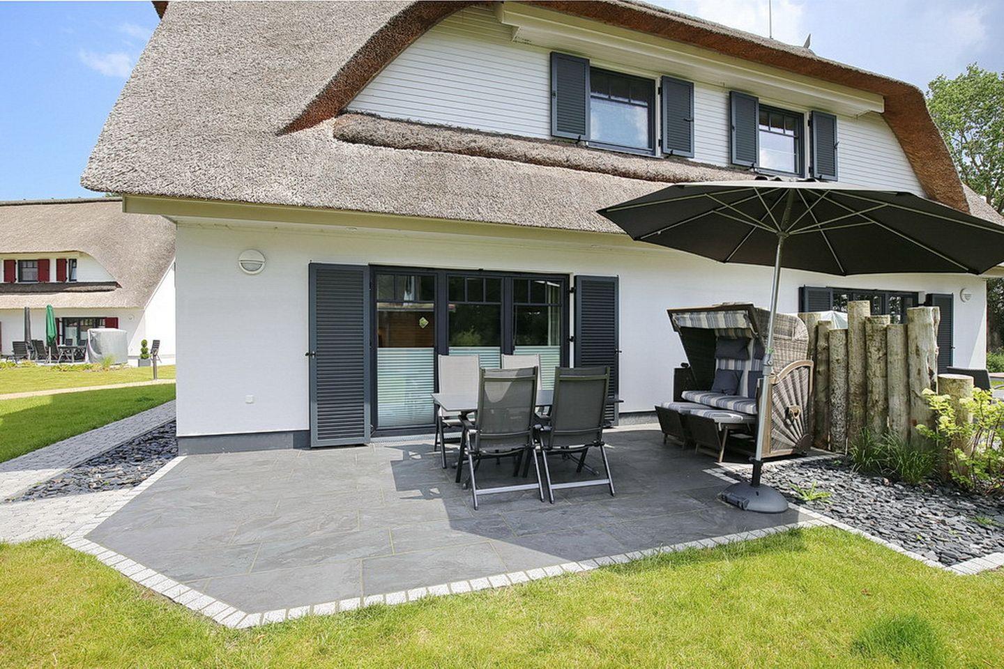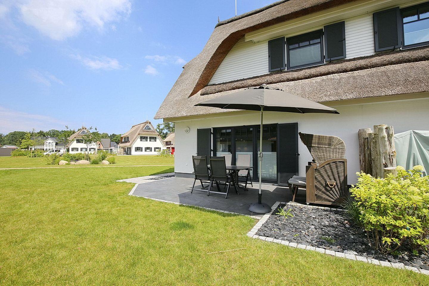 Großzügige Doppelhaushälfte mit Reetdach in Boltenhagen, nur 400 m vom Strand entfernt, mit Terrasse, Sauna und moderner Ausstattung.