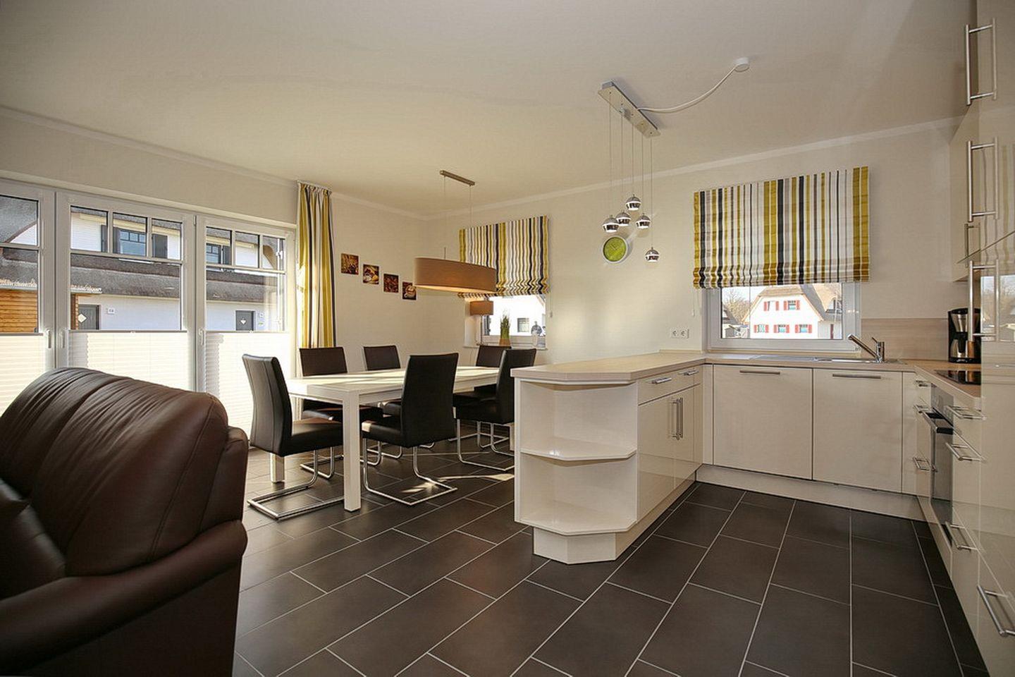 Auf drei Etagen vereint die großzügige Doppelhaushälfte mit Reetdach einen Wohnraum mit Zugang zur Terrasse, drei Schlafzimmer und zwei modernen Bädern. Zusammen mit dem Spitzboden hast du hier auf ca. 100 m² viel Platz für deinen Urlaub. Zum Strand sind es etwa 400 m.