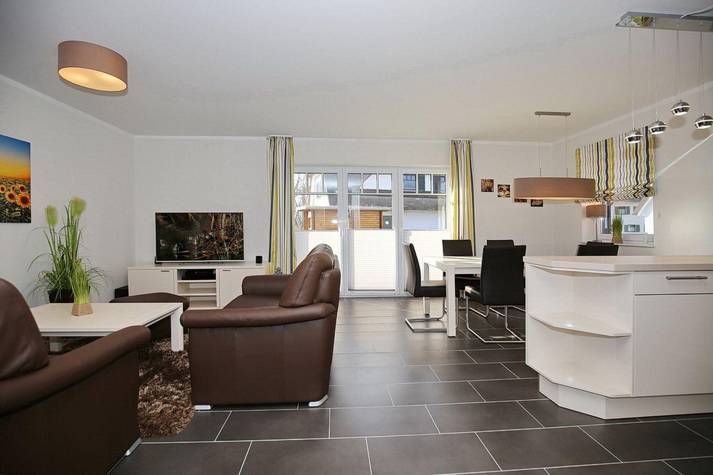 Der Zugang zur großen Süd/West Terrasse erfolgt direkt vom Wohnzimmer aus, von hier aus hast du einen schönen Blick. Im Wohnzimmer kannst du deine Lieblingsmusik per Bluetooth über die Surround-Anlage genießen, oder schau deine Blu-ray auf dem 55" Flachbild-TV. Zur Unterhaltung findest du eine Playstation 3 mit einer Auswahl an Spielen.