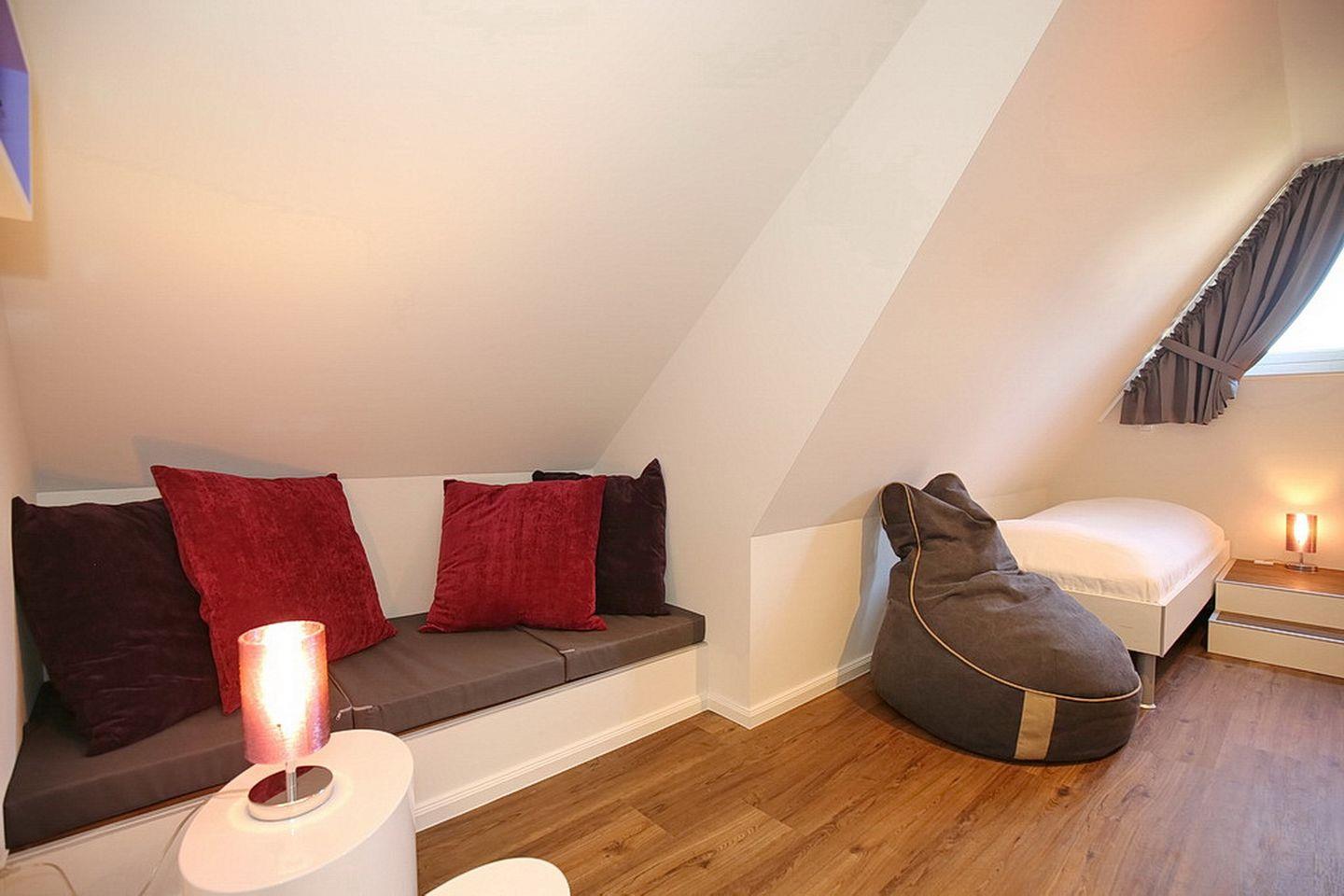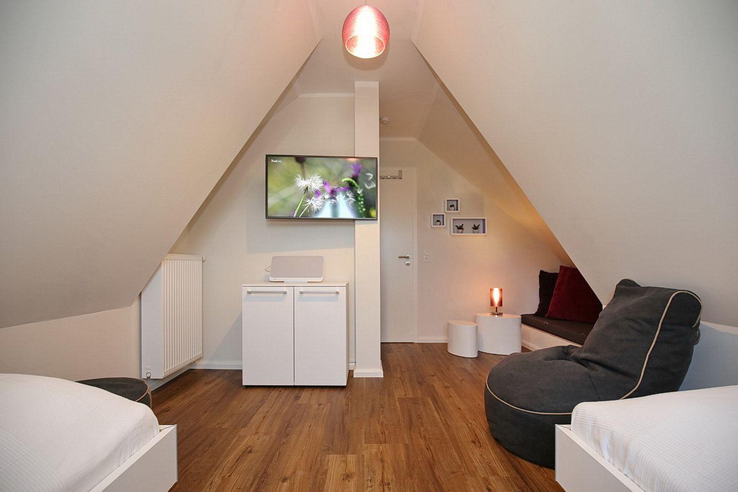 Im Spitzboden befindet sich ein weiteres Schlafzimmer das mit einem 40" TV, einem Radio/CD-Player mit Bluetooth-Streaming-Funktion und zwei Einzelbetten (90 x 200 cm) ausgestattet ist.