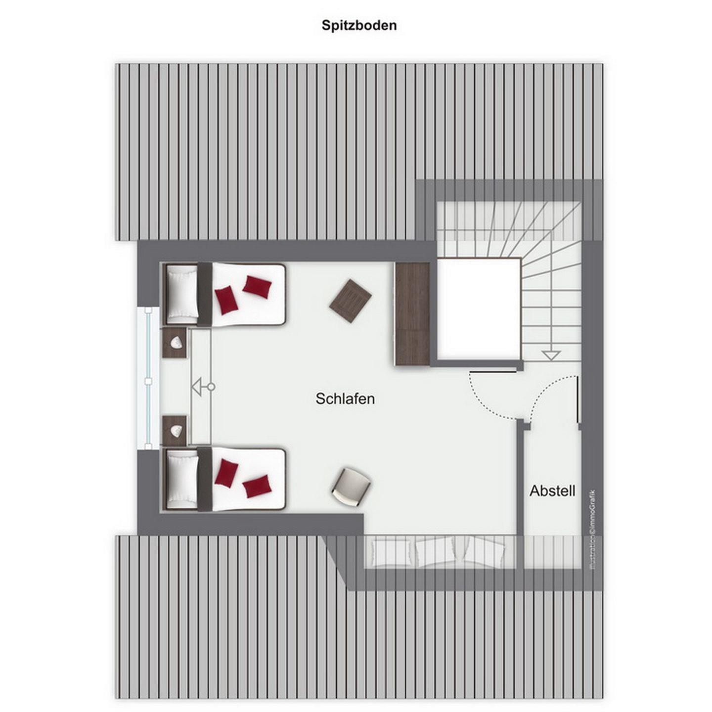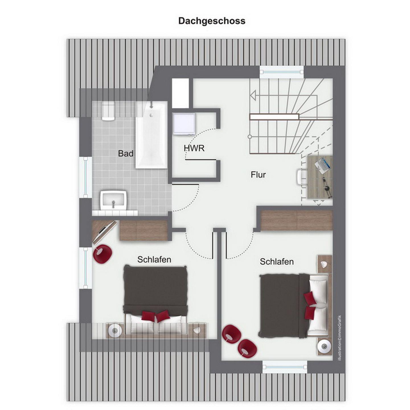 Im Dachgeschoss stehen dir zwei Schlafzimmer mit zwei Doppelbetten (2 x 90 x 200 cm) und Kleiderschränken zur Verfügung. Ein Schlafzimmer ist außerdem mit einem Flachbild-TV mit integriertem DVD-Player ausgestattet. Weiter verfügt das Dachgeschoss über eine Waschmaschine sowie ein Badezimmer mit Badewanne.