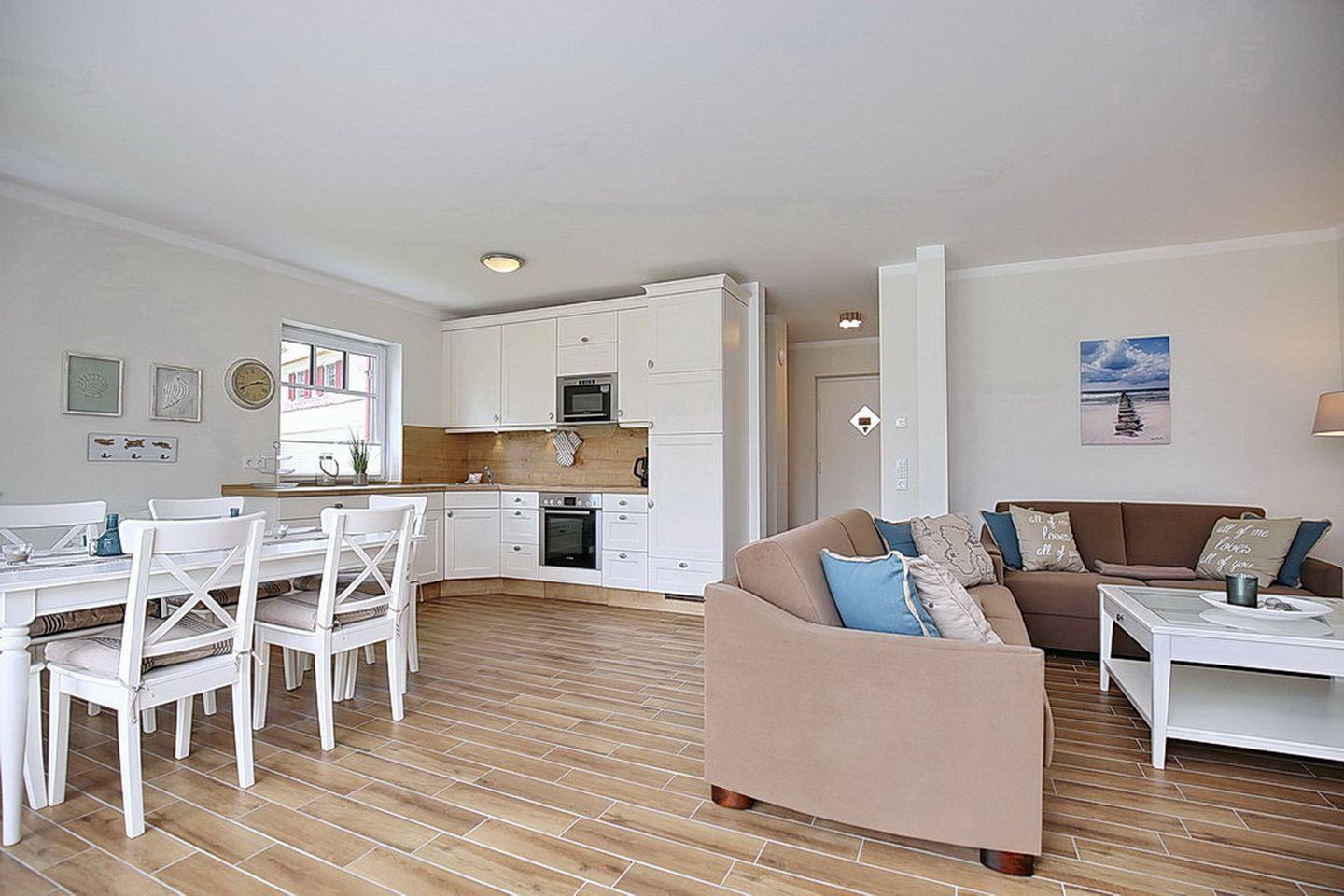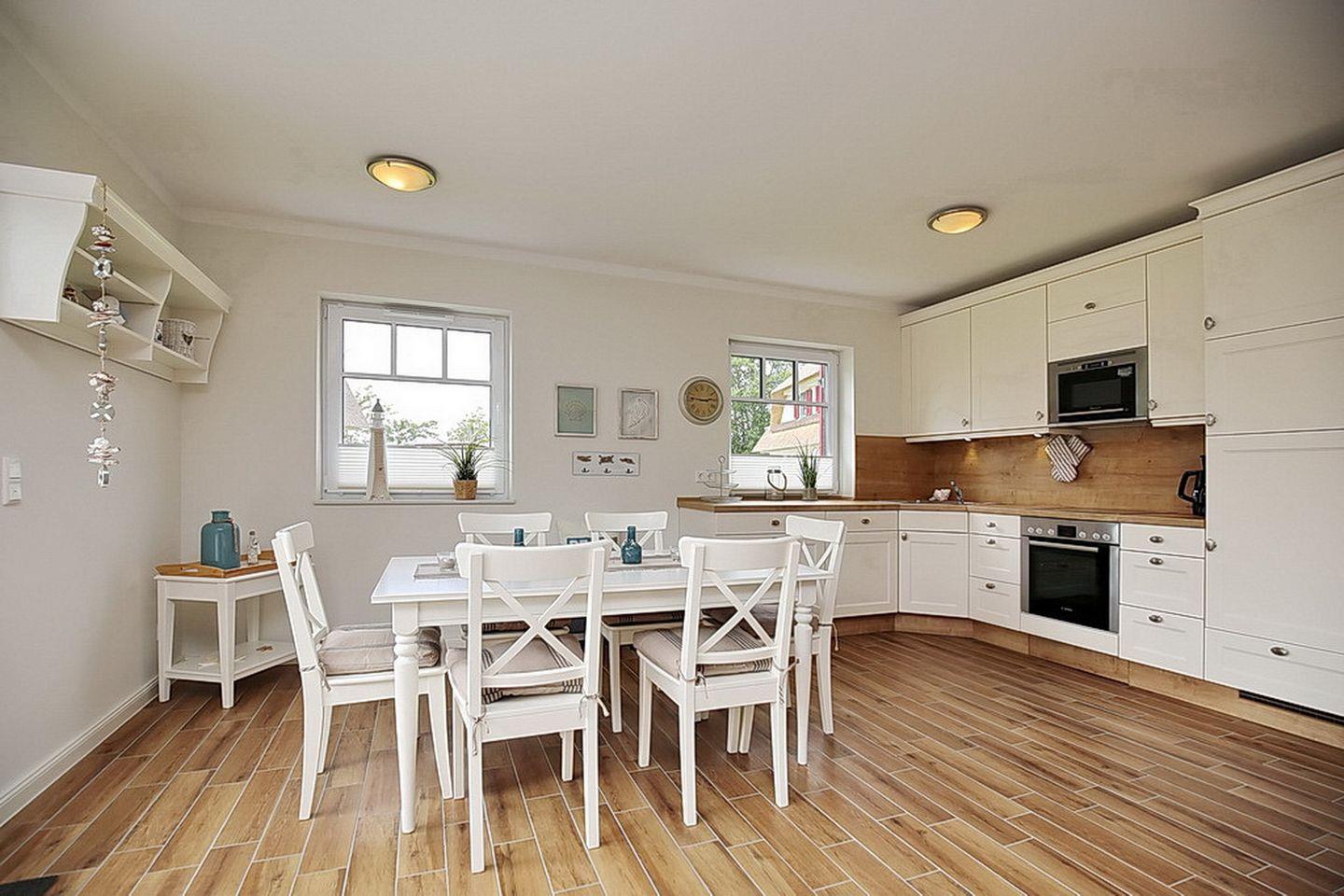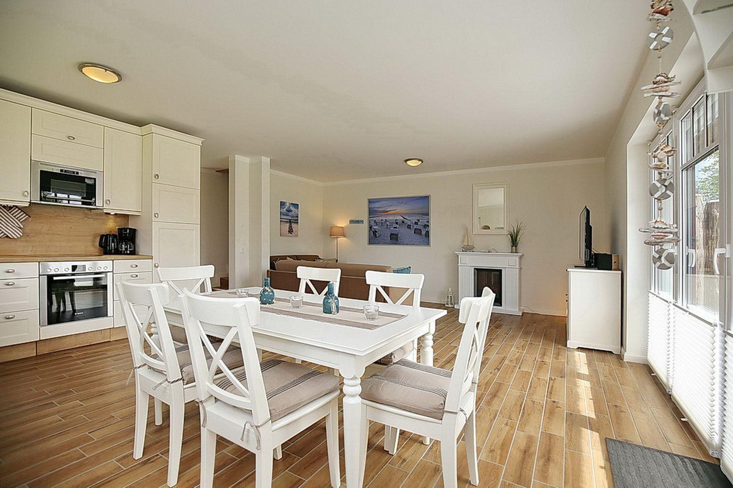 Auf drei Etagen vereint die großzügige Doppelhaushälfte mit Reetdach einen Wohnraum mit Zugang zur Terrasse, drei Schlafzimmer und zwei moderne Bäder. Zusammen mit dem Spitzboden hast du hier auf über 100 m² viel Platz für deinen Urlaub.