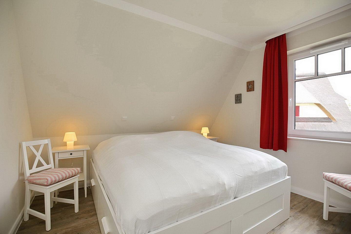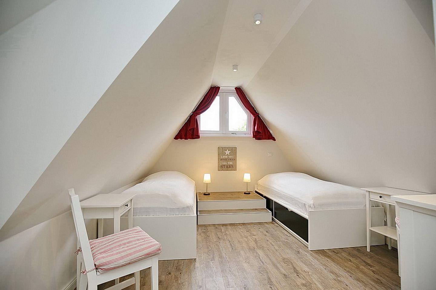 Im Spitzboden befindet sich ein weiteres Schlafzimmer, das mit zwei Einzelbetten (2 x 90 x 200 cm) ausgestattet ist. Für den Weg zum Strand stehen dir zwei Fahrräder (ohne Gewähr) und ein Bollerwagen (ohne Gewähr) zur Verfügung. In dieser Nichtraucherwohnung sind maximal zwei Haustiere erlaubt. WLAN (ohne Gewähr) steht dir kostenlos zur Verfügung.