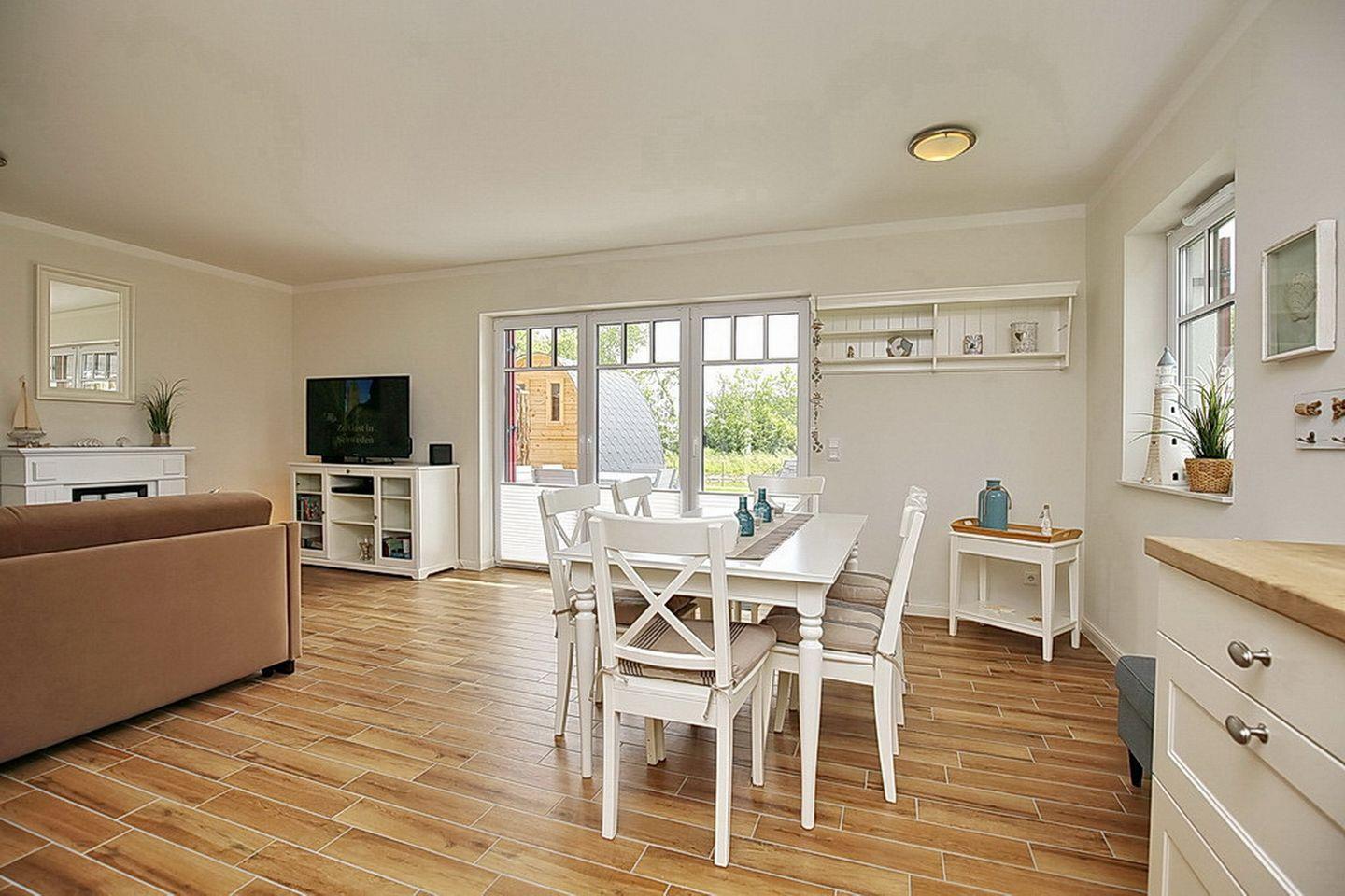 Im Erdgeschoss des Ferienhauses befindet sich der großzügige Wohnraum mit gemütlichem Essbereich, sowie der integrierten Küchenzeile. Auch das Gäste-WC mit Dusche und den Eingangsbereich findest du hier.
