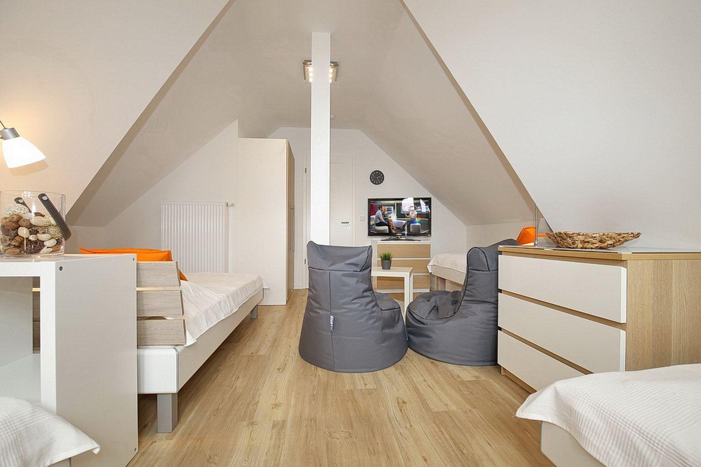 Im Spitzboden befindet sich ein weiteres Schlafzimmer mit vier Einzelbetten (90 x 200 cm). Das Schlafzimmer verfügt zusätzlich über einen TV und eine Spielekonsole (PS4). Spiele können bei der Rezeption (gegen Pfand) ausgeliehen werden.