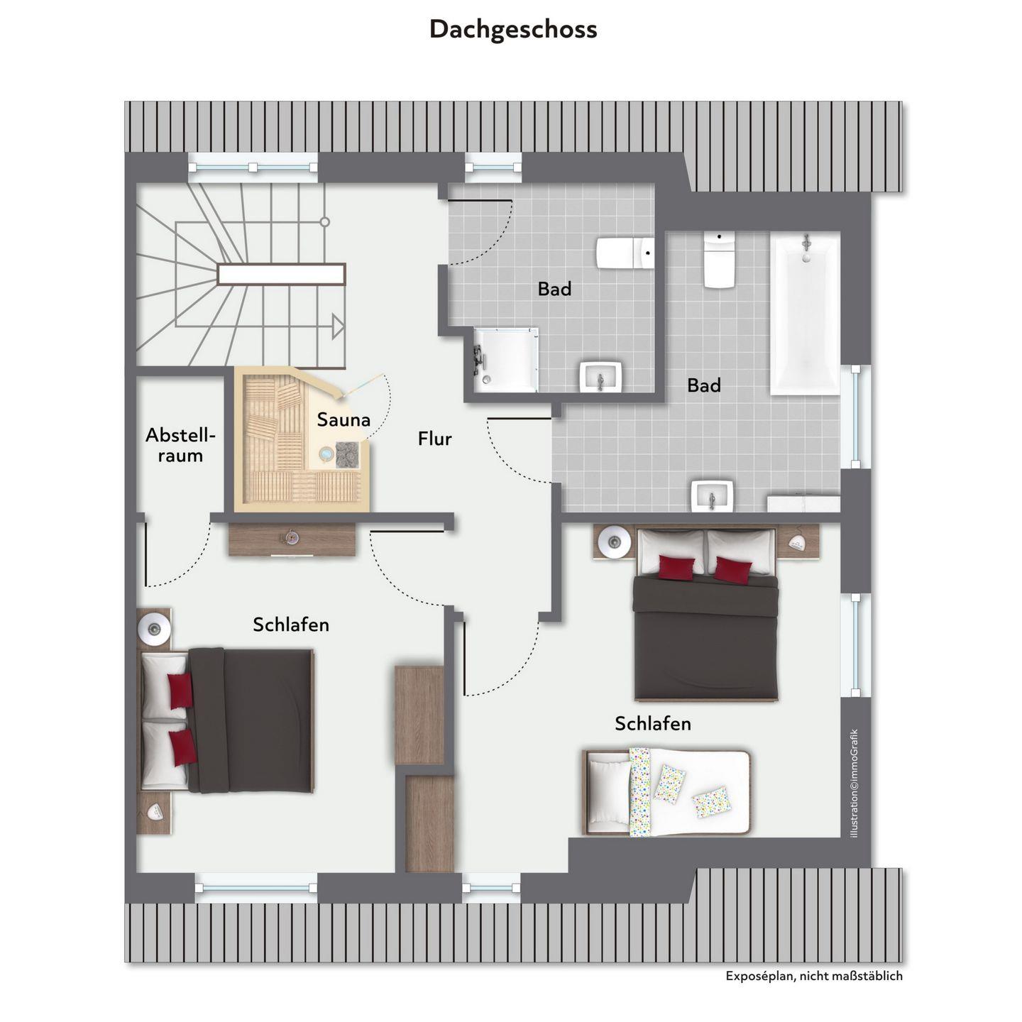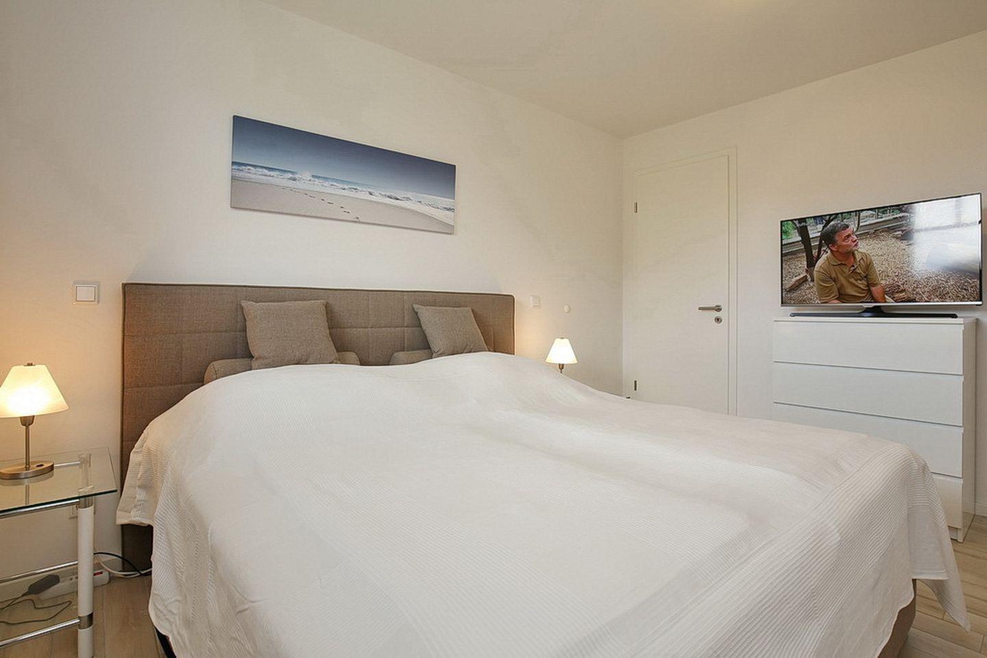 Im Obergeschoss finden Sie zwei Schlafräume vor, die beide mit Schränken für deine Urlaubsgarderobe ausgestattet sind. In einem stehen ein Boxspringbett (2 x 90 x 200 cm) und für die dritte Person ein Einzelbett (80 x 200 cm). Im zweiten Schlafzimmer ist ebenfalls ein Boxspringbett (2 x 90 x 200 cm) vorhanden und ein Fernseher. Hiervon geht ein Abstellraum ab, in dem sich ein Safe, ein Kinderbett, eine Babybadewanne und ein Toilettensitz für Kleinkinder befinden. Des Weiteren verfügt das Obergeschoss über zwei Bäder mit Badewanne und Dusche, den Flur und eine kleine Infrarotsauna mit integrierter Farblichttherapie zum Entspannen. Alle großen Fenster im Obergeschoss sind mit Fliegenschutzgitter ausgestattet.