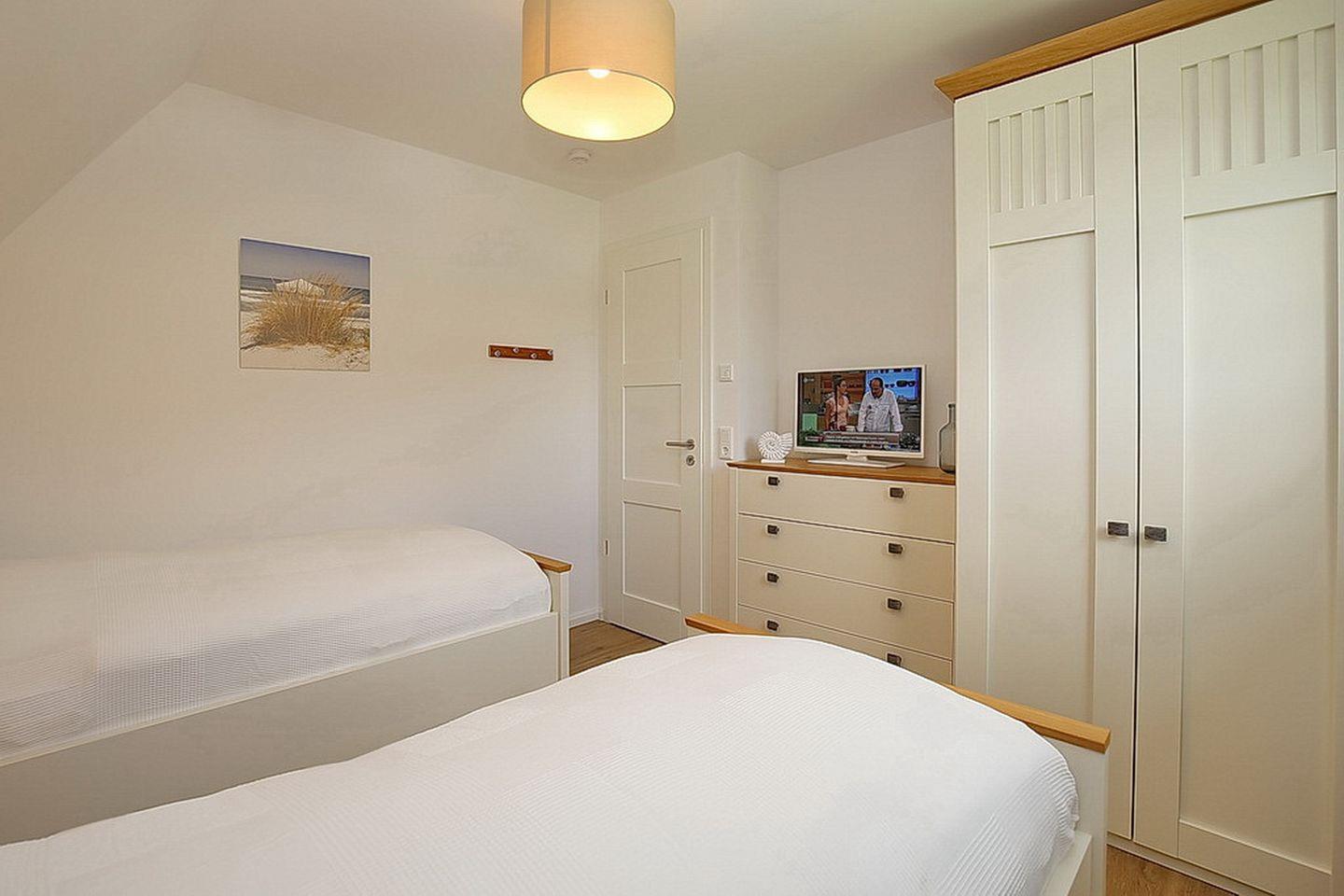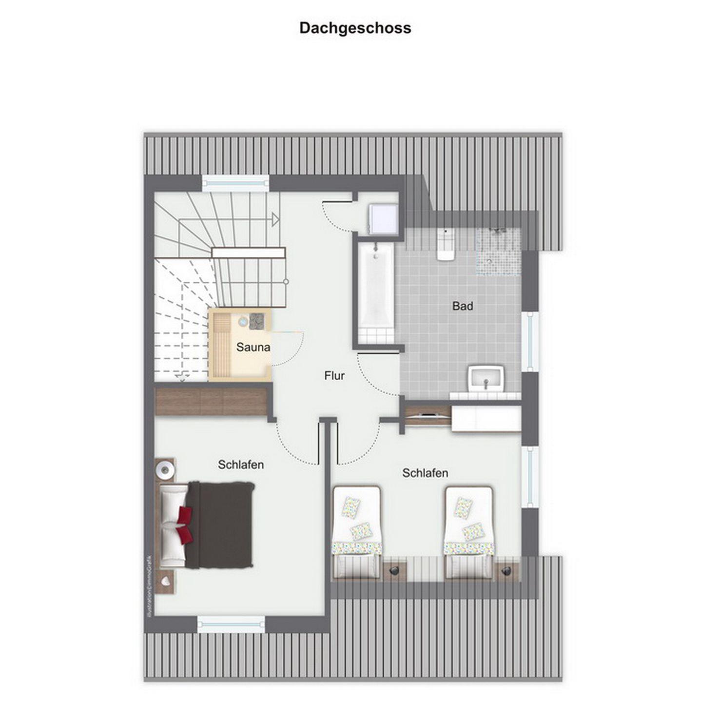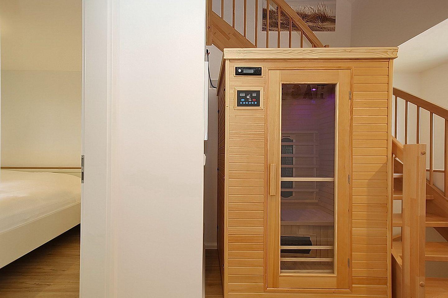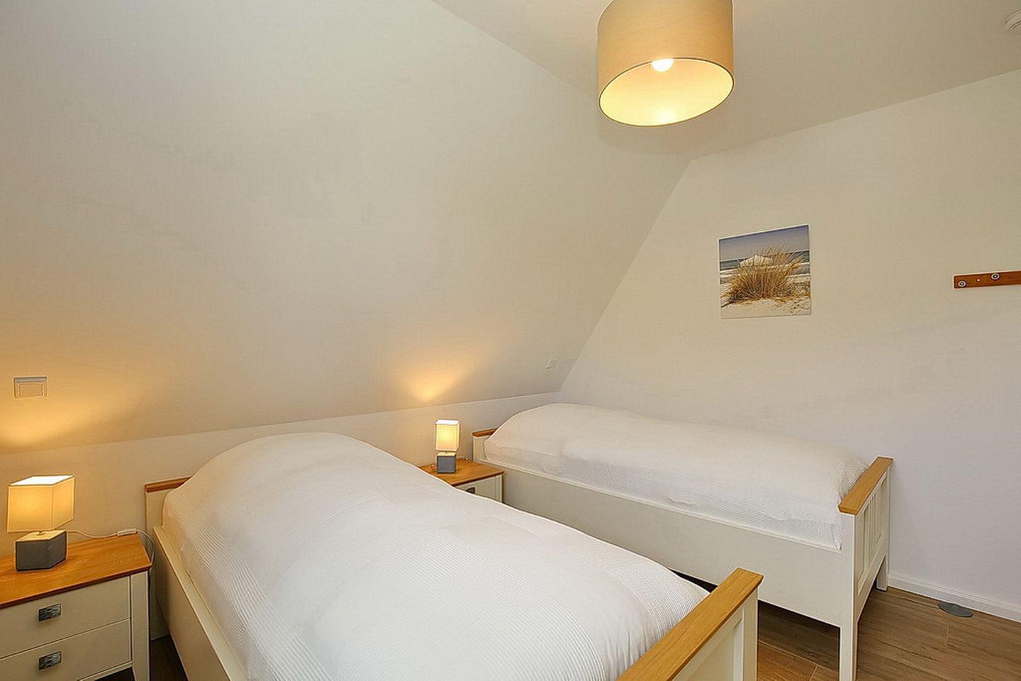 Im Spitzboden befindet sich ein weiteres Schlafzimmer mit zwei Einzelbetten (90 x 200 cm). In diesem Nichtraucherhaus sind Haustiere nicht erlaubt. Ein Kinderbett und ein Kinderhochstuhl sind inklusive. Die Besonderheiten in dem Ferienhaus sind die kleine Infrarotkabine, der Bollerwagen (ohne Gewähr) und der Strandkorb, der sich auf der Terrasse befindet. W-Lan (ohne Gewähr) Anschluss ist vorhanden.
