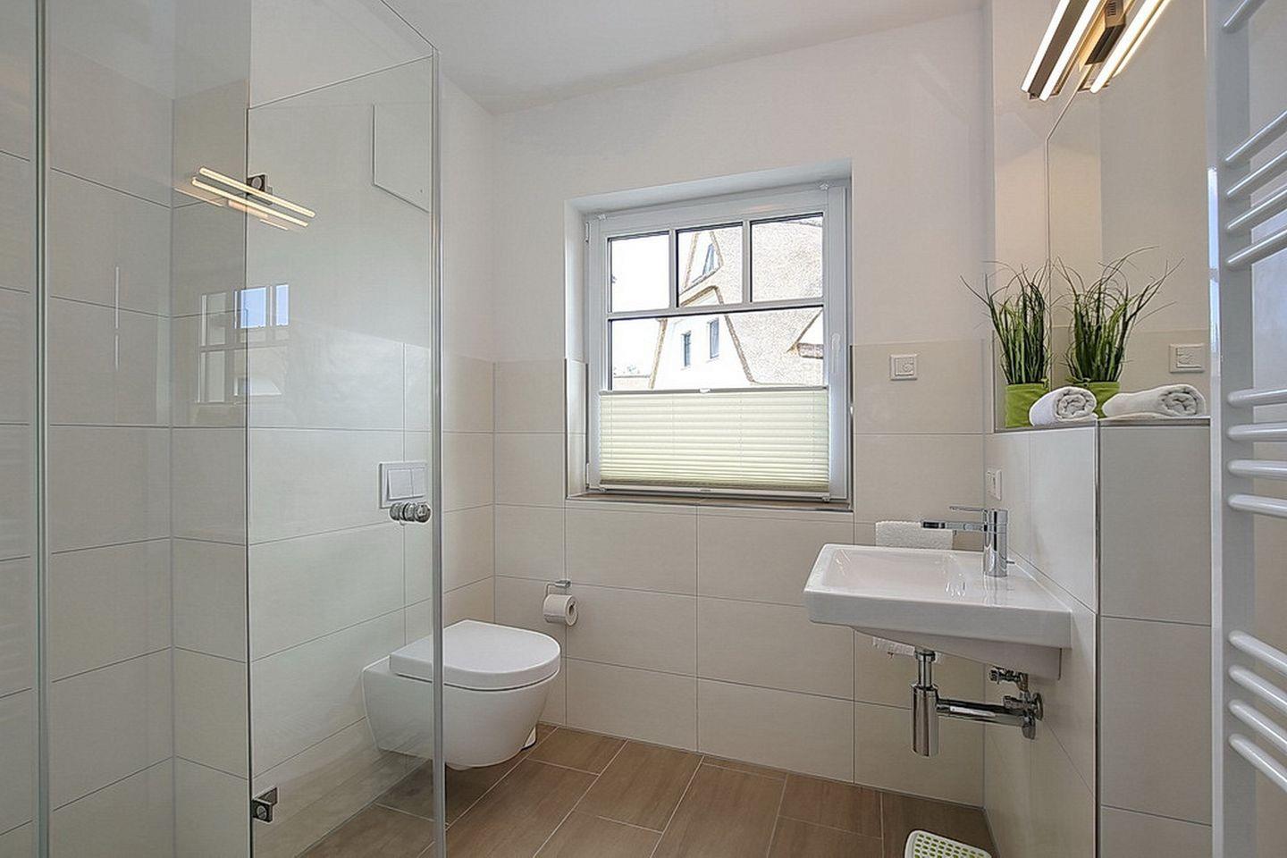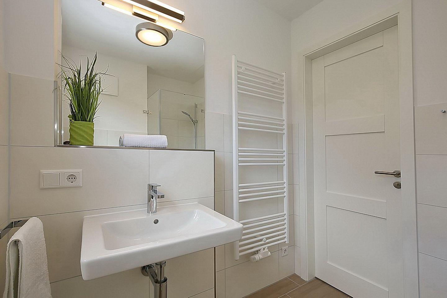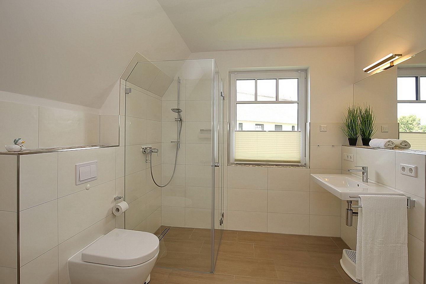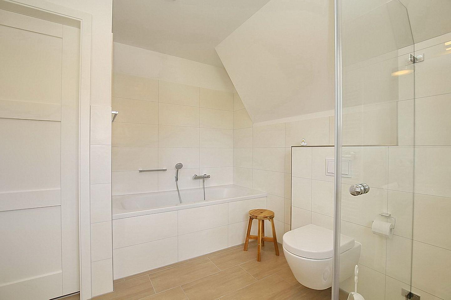 Im Obergeschoss bewohnst du zwei Schlafzimmer. Zur Einrichtung des ersten Schlafzimmers gehört ein Doppelbett mit zwei einzelnen Matratzen (2x90 x 200 cm). Im zweiten Schlafbereich befinden sich zwei Einzelbetten (90 x 200 cm). Weiter verfügt das Obergeschoß über einen Hauswirtschaftsraum und eine Waschmaschine. Die komfortablen Bäder sind mit ebenerdiger Dusche ausgestattet. Das Badezimmer im Obergeschoss lädt zusätzlich mit Badewanne zum Entspannen ein.