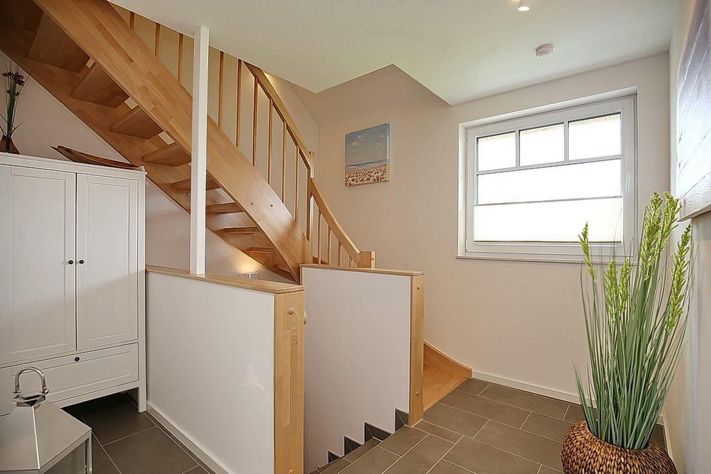 Im Erdgeschoss des Ferienhauses befinden sich der Wohnraum, eine gemütliche Essgruppe, ein Sofa sowie die integrierte Küchenzeile mit Kochinsel. Auch das Gäste-WC mit bodengleicher Dusche sowie der Eingangsbereich befinden sich hier. Der Zugang zur großzügigen Süd-West Terrasse mit einem Strandkorb und zwei Sonnenliegen erfolgt direkt vom Wohnzimmer aus. Für deine Unterhaltung stehen dir ein Flachbild-TV, ein DVD-Player und eine Stereoanlage zur Verfügung. In der modernen Küchenzeile findest du einen Geschirrspüler, eine Mikrowelle, einen Induktionsherd mit Backofen, einen Kühlschrank mit Gefrierfach und eine Nespressomaschine vor.