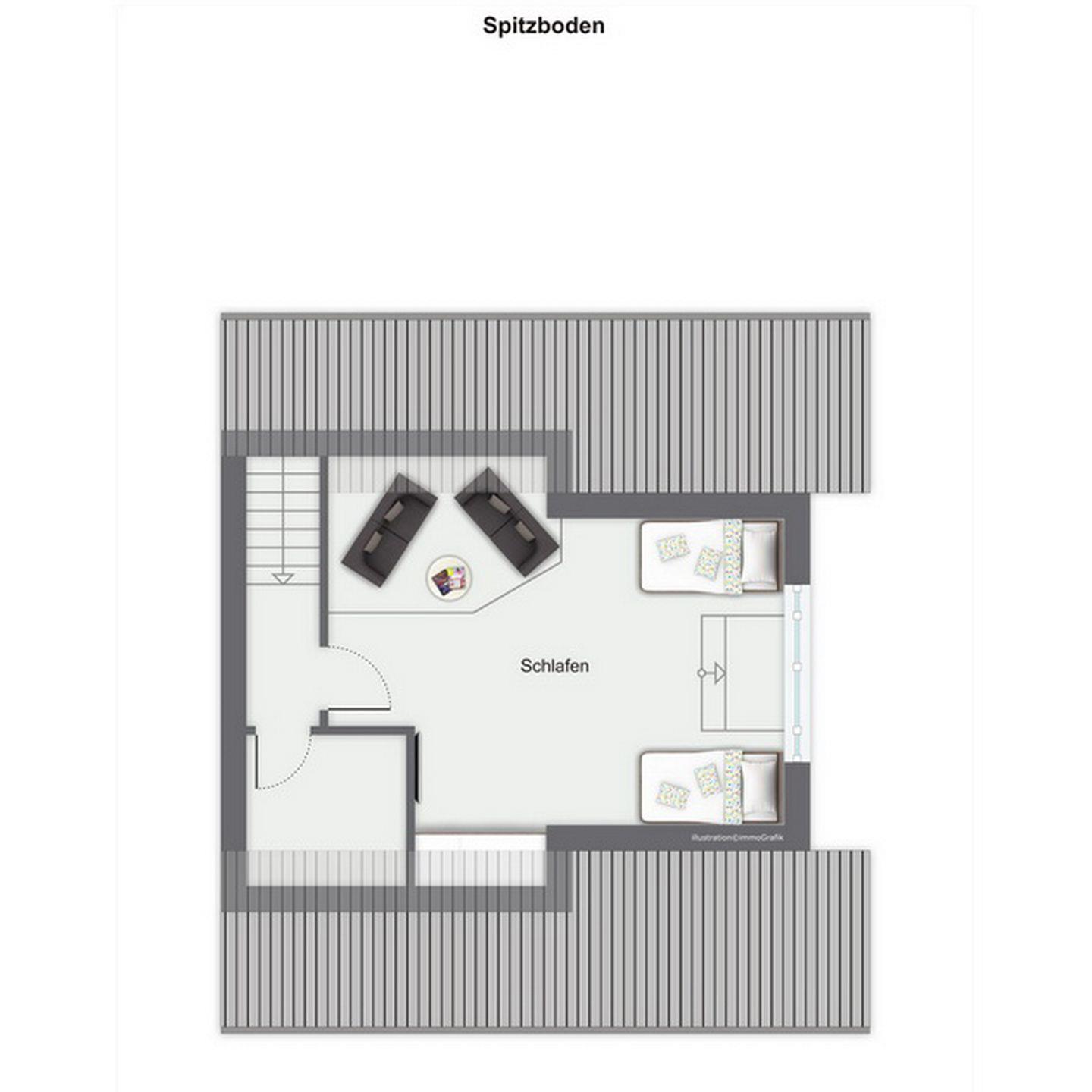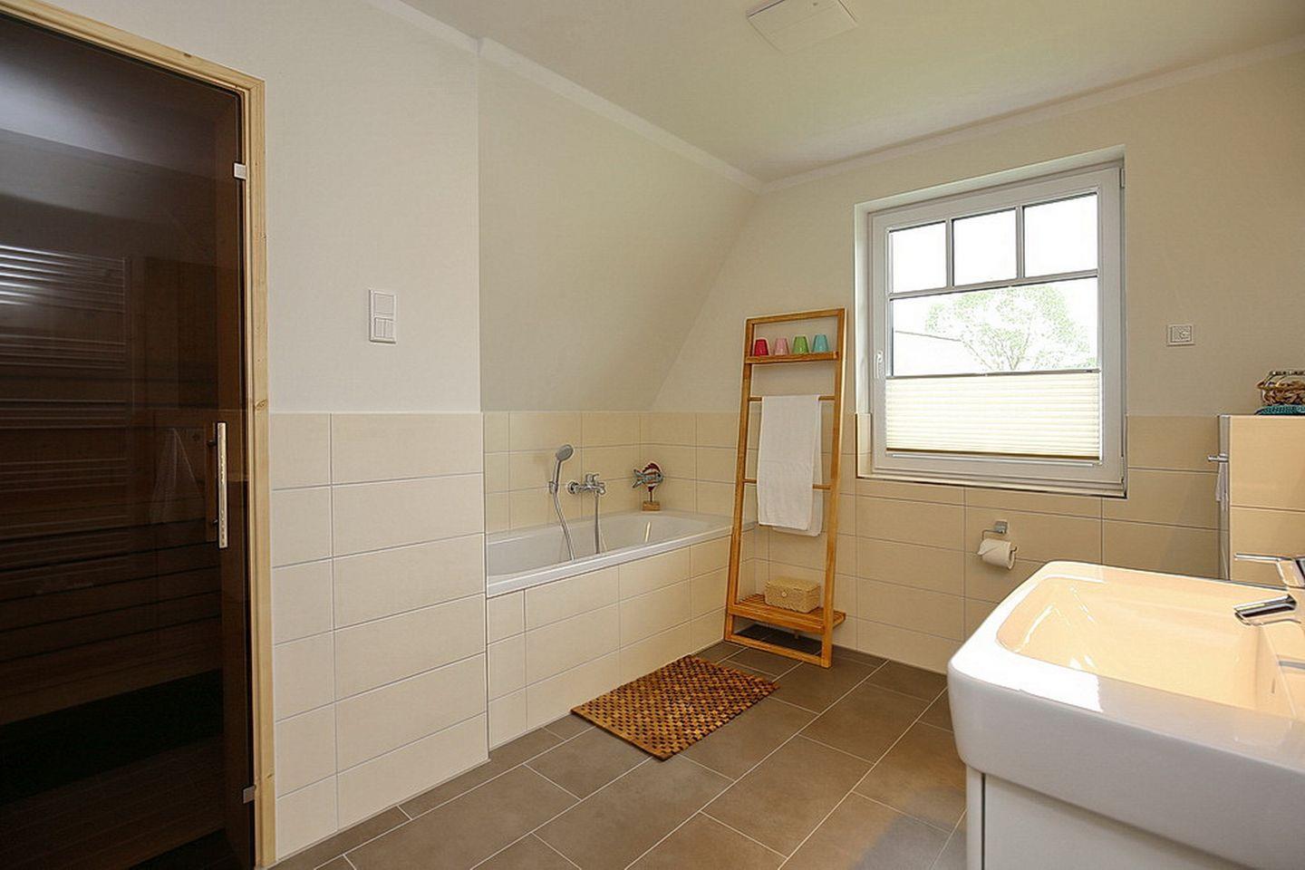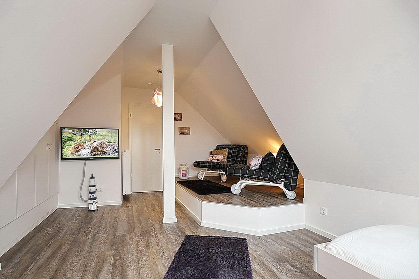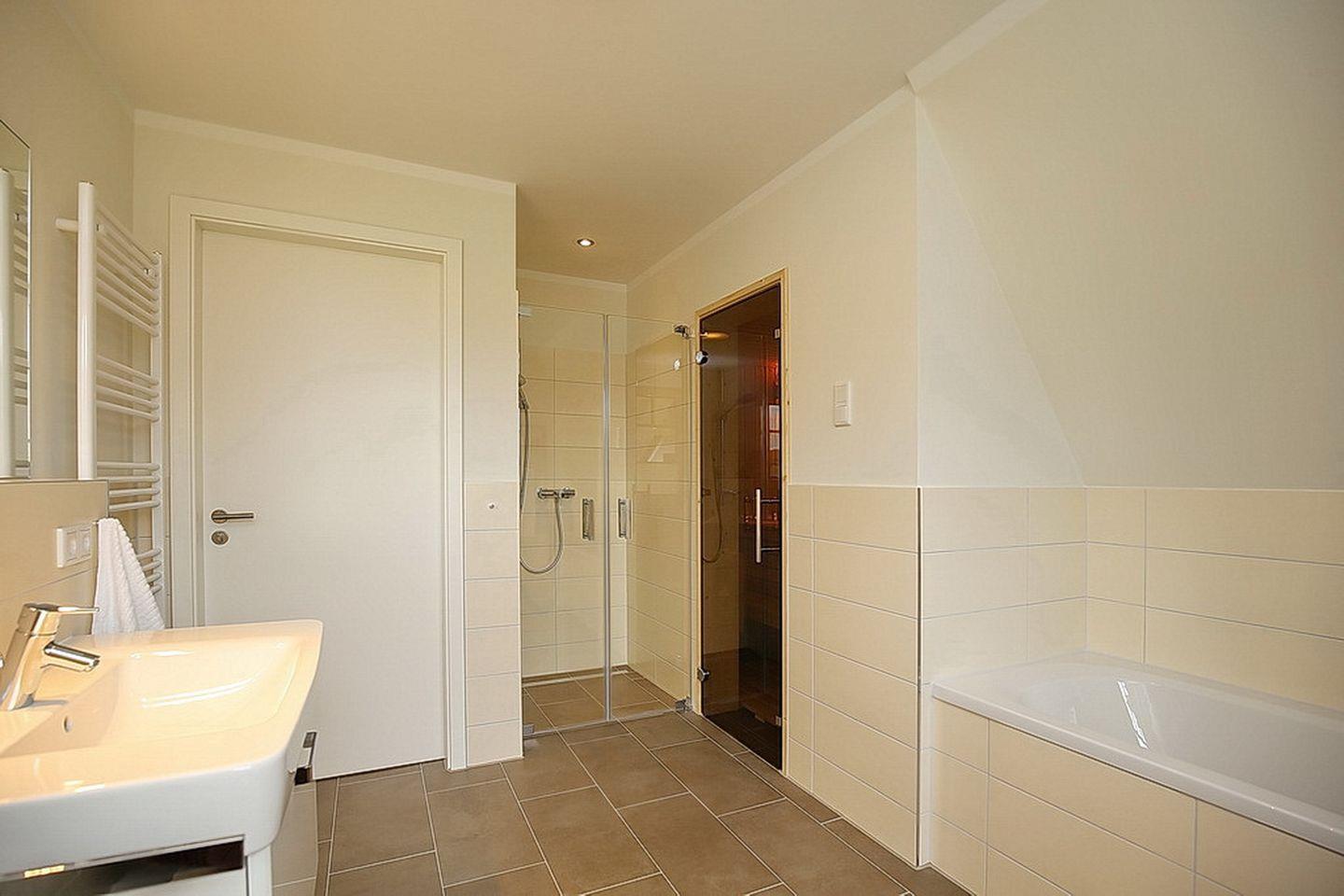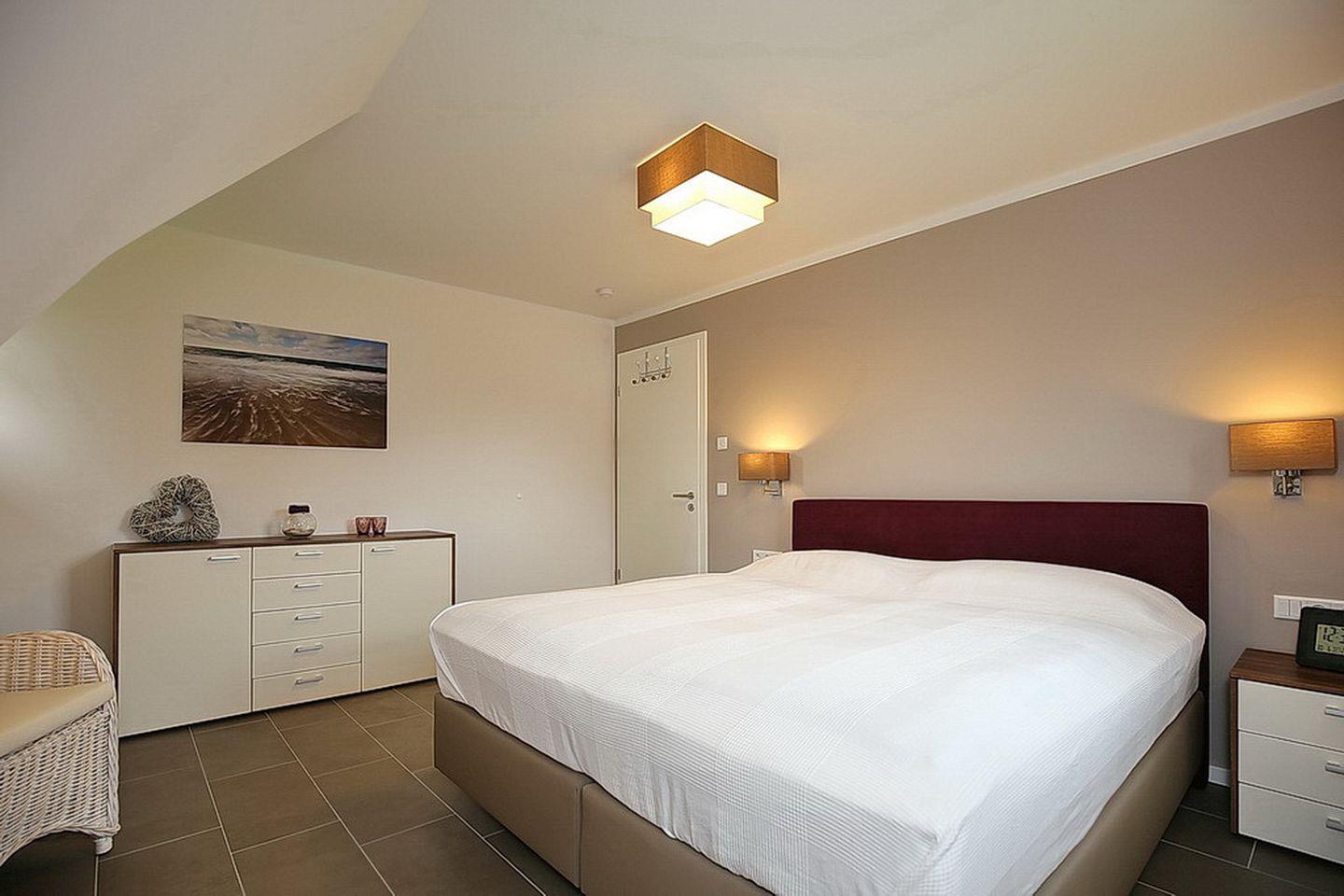 In den zwei Schlafzimmern im Dachgeschoss stehen dir zwei Doppelbetten (180 x 200 cm und 2 x 90 cm x 200 cm), jeweils ein TV und Schränke mit ausreichend Platz für deine Urlaubsgarderobe zur Verfügung. Des Weiteren verfügt das Dachgeschoss über ein Bad mit Badewanne und Sauna sowie den Flur.