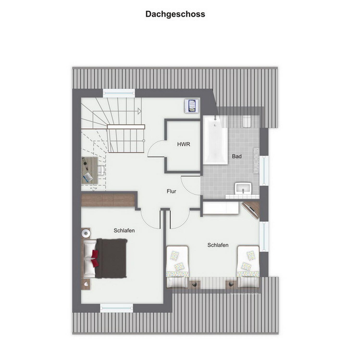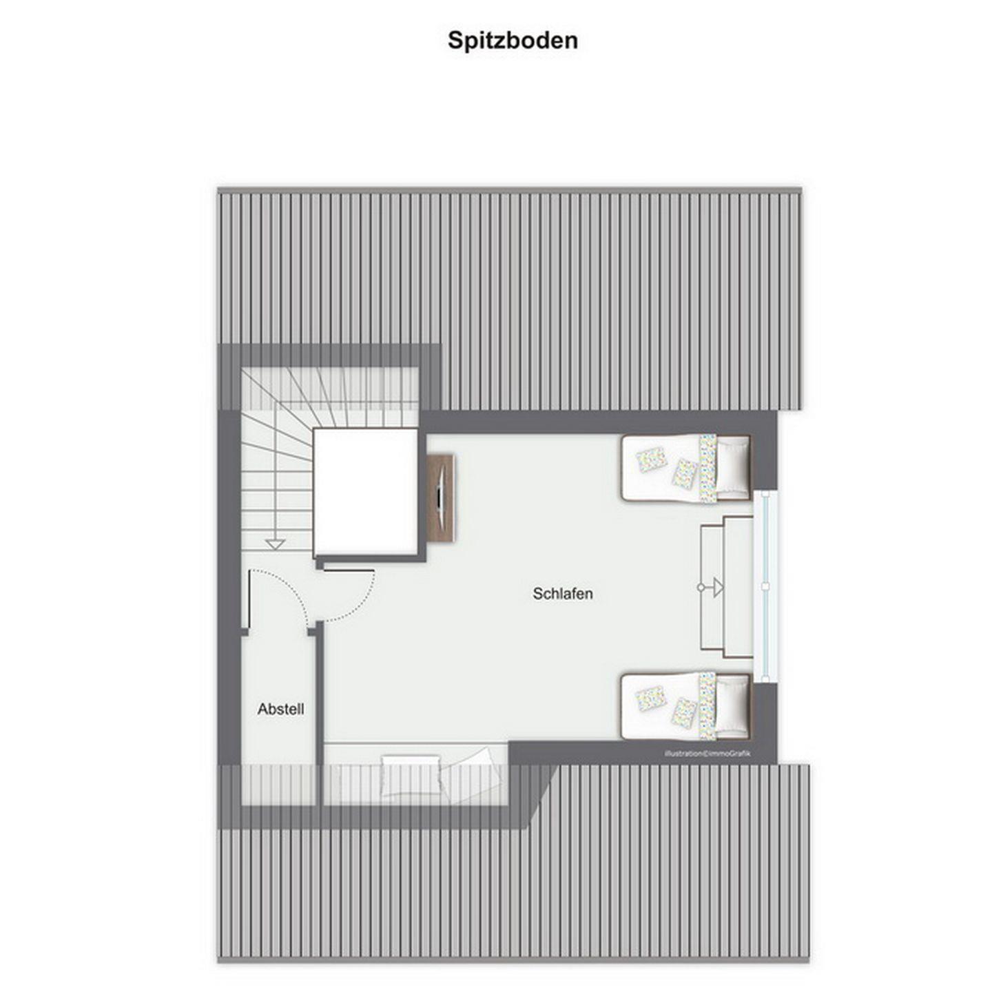 Im Spitzboden befindet sich ein weiteres Schlafzimmer, welches über zwei Einzelbetten (90 x 200 cm) und zusätzlich über einen weiteren Fernseher verfügt. Zur weiteren Ausstattung des Ferienhauses gehören ein Gemeinschaftsschuppen, eine Waschmaschine sowie ein Kinderreisebett, ein Hochstuhl und ein Bollerwagen (ohne Gewähr) kleinen Gäste. Das gesamte Haus verfügt über WLAN (ohne Gewähr). In diesem Nichtraucherhaus sind Haustiere nicht erlaubt.