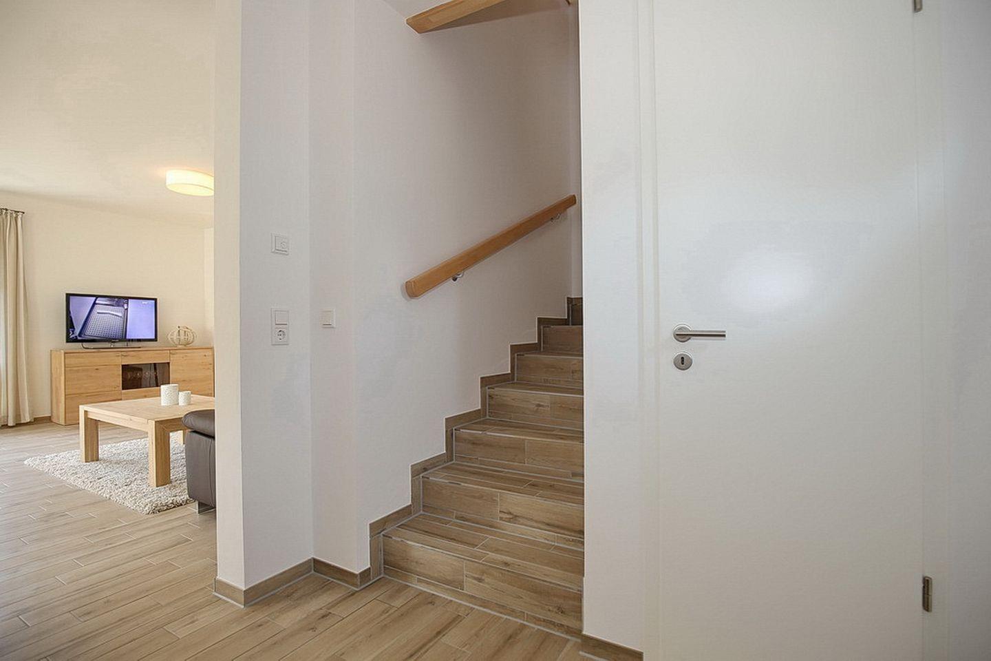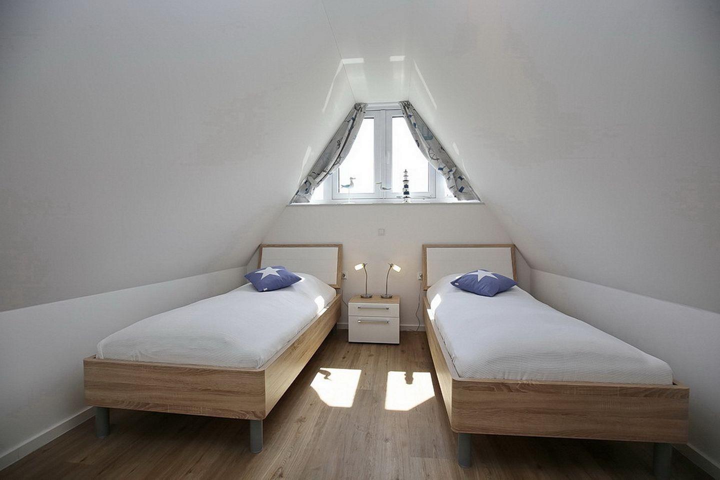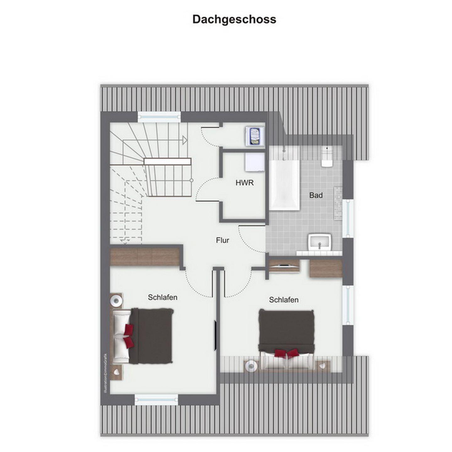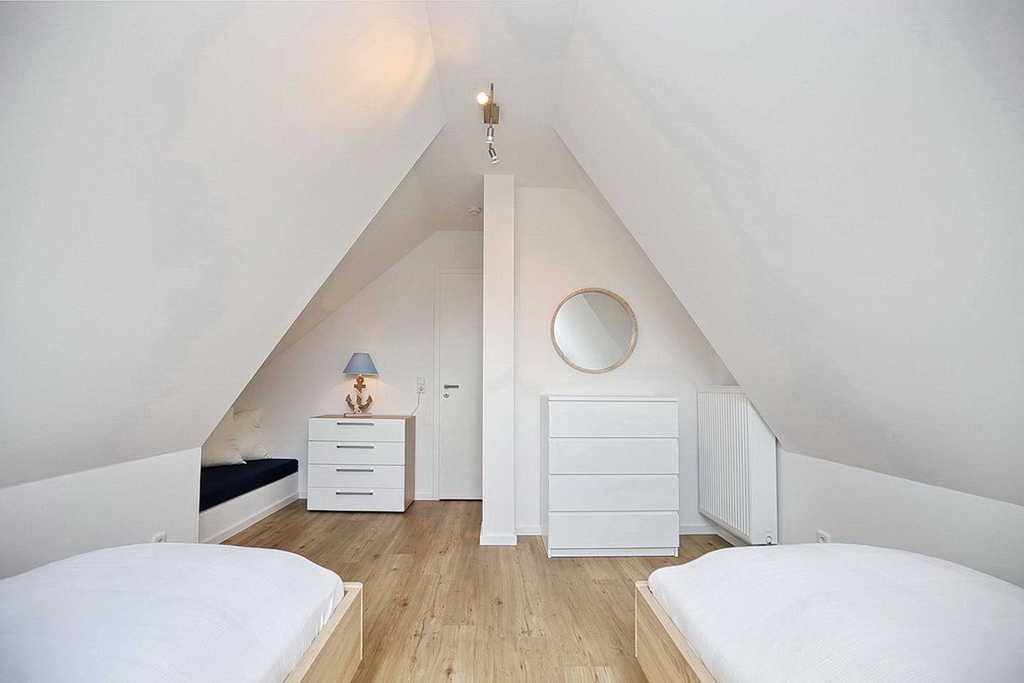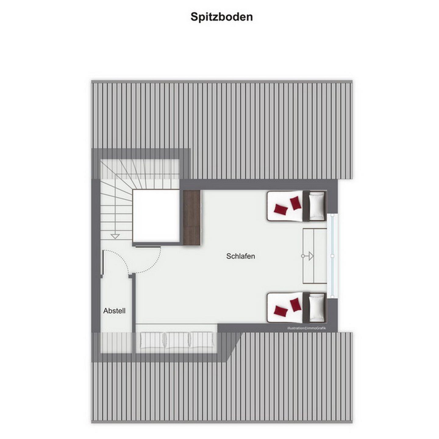 Im Dachgeschoss stehen dir zwei Schlafzimmer mit je zwei Doppelbetten (2 x 90 x 200cm) und mit je einem Fernseher zur Verfügung. Weiter verfügt das Dachgeschoß über einen Hauswirtschaftsraum mit Waschmaschine, ein Bad mit Badewanne und den Flur. Im Spitzboden befindet sich ein weiteres Schlafzimmer mit zwei Einzelbetten (90 x 200cm).