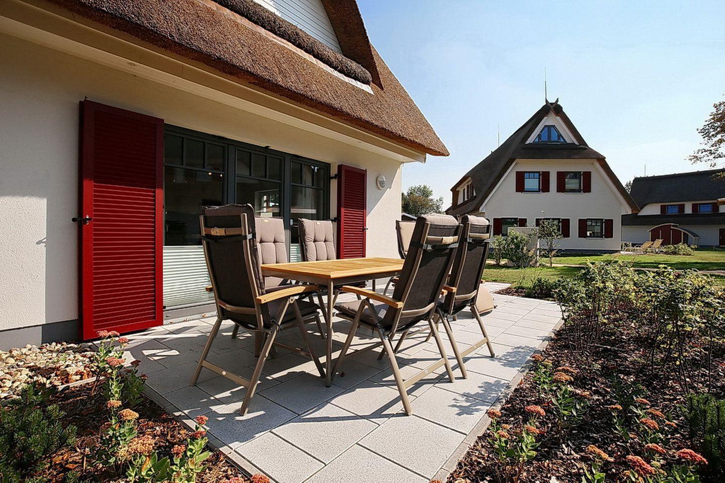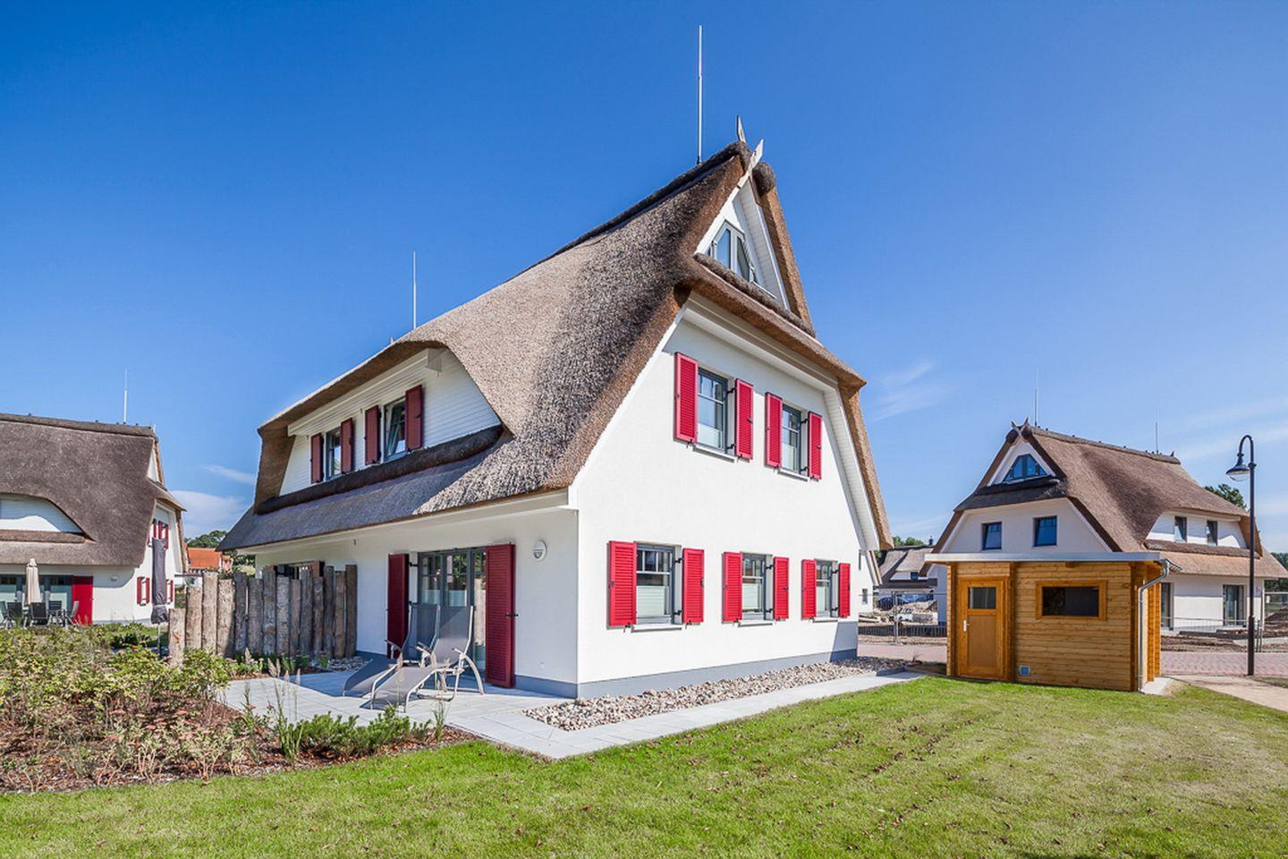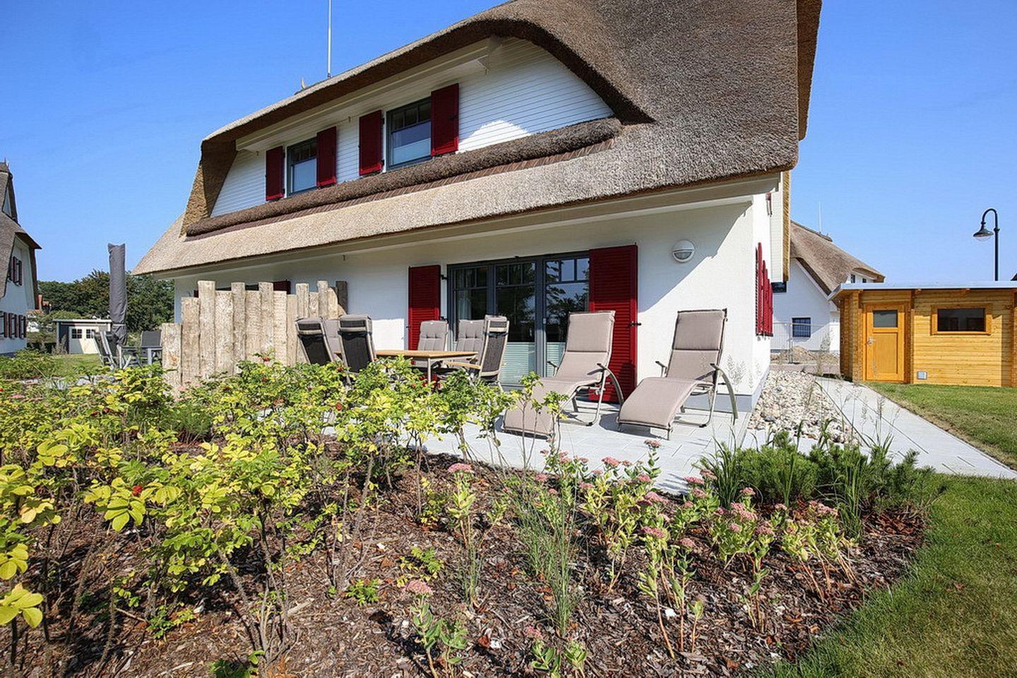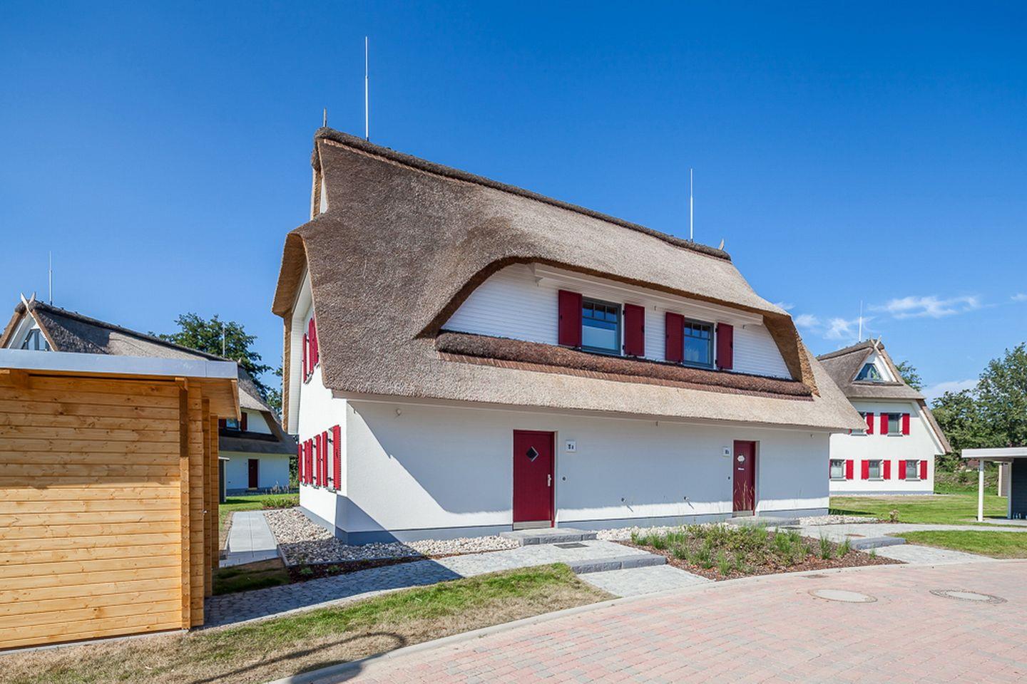 Gemütliche Doppelhaushälfte mit Reetdach, Terrasse und Sauna in Boltenhagen, nur 400 m vom Strand entfernt.