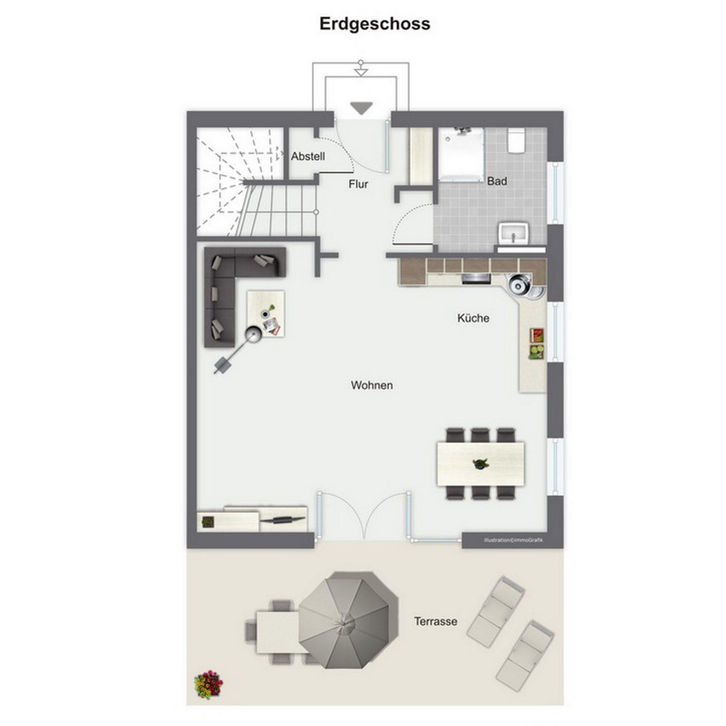 Im Erdgeschoss des Ferienhauses befindet sich der großzügige Wohnraum mit gemütlichem Essbereich sowie der integrierten Küchenzeile. Auch das Gäste-WC mit Dusche und den Eingangsbereich findest du hier.
