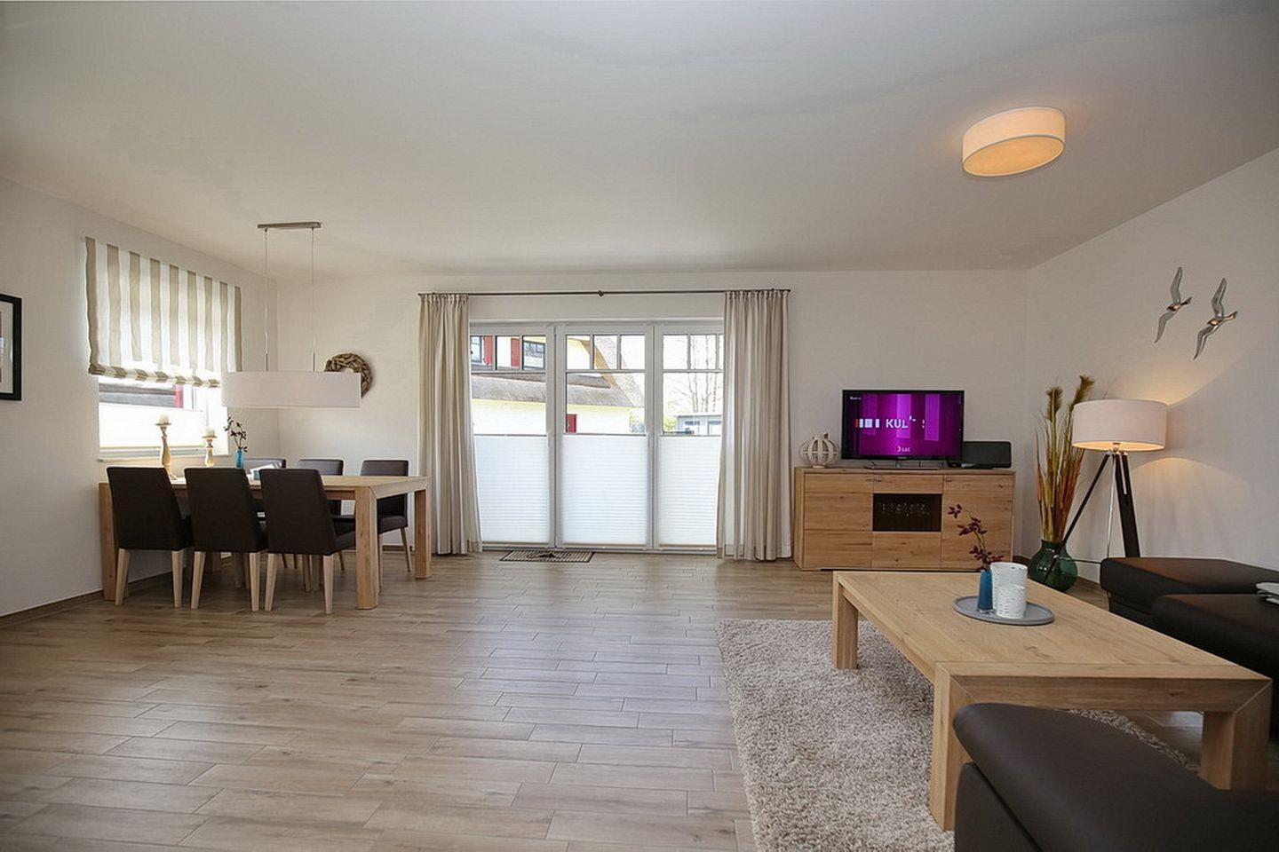 Auf drei Etagen vereint die großzügige Doppelhaushälfte mit Reetdach einen Wohnraum mit Zugang zur Terrasse, drei Schlafzimmer und zwei modernen Bäder. Zusammen mit dem Spitzboden hast du hier auf über 100 m² viel Platz für deinen Urlaub.