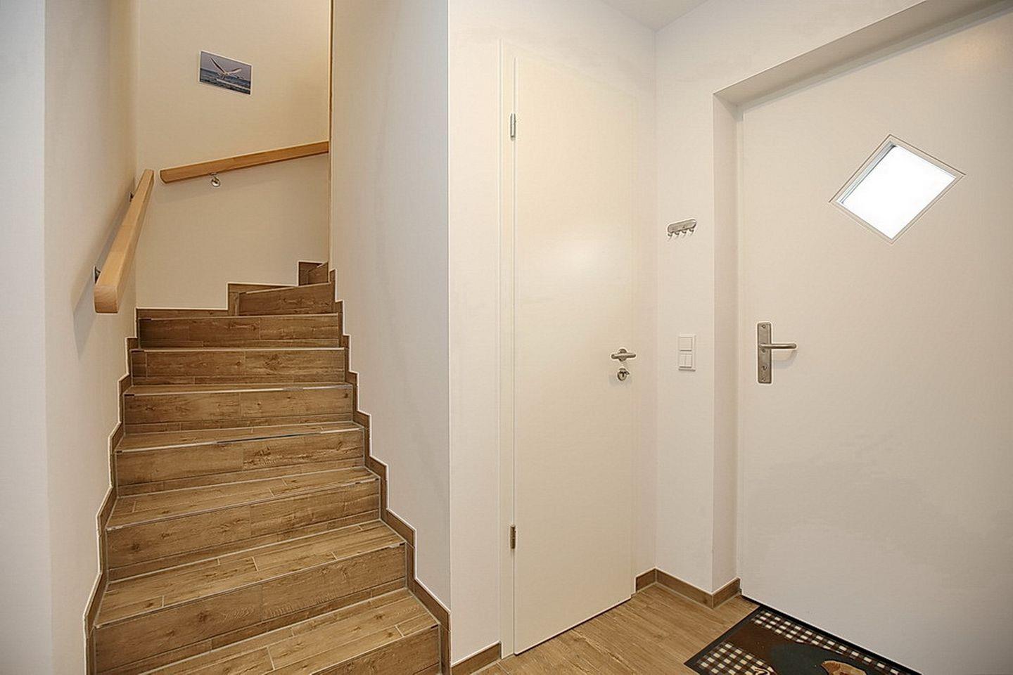Im Erdgeschoss des Ferienhauses befinden sich der Wohnraum, eine gemütliche Essgruppe, eine Eck-Couch sowie die integrierte Küchenzeile. Auch das Duschbad sowie der Eingangsbereich befinden sich hier.