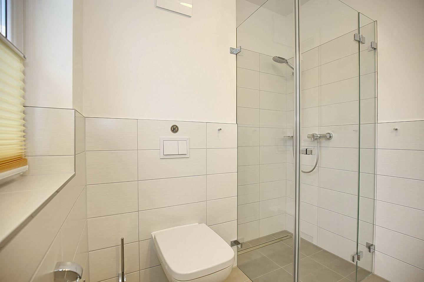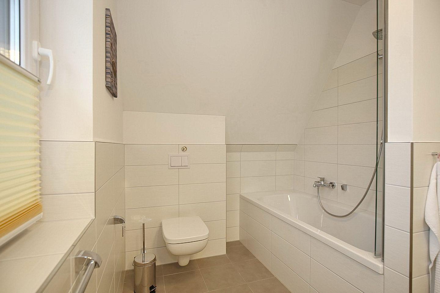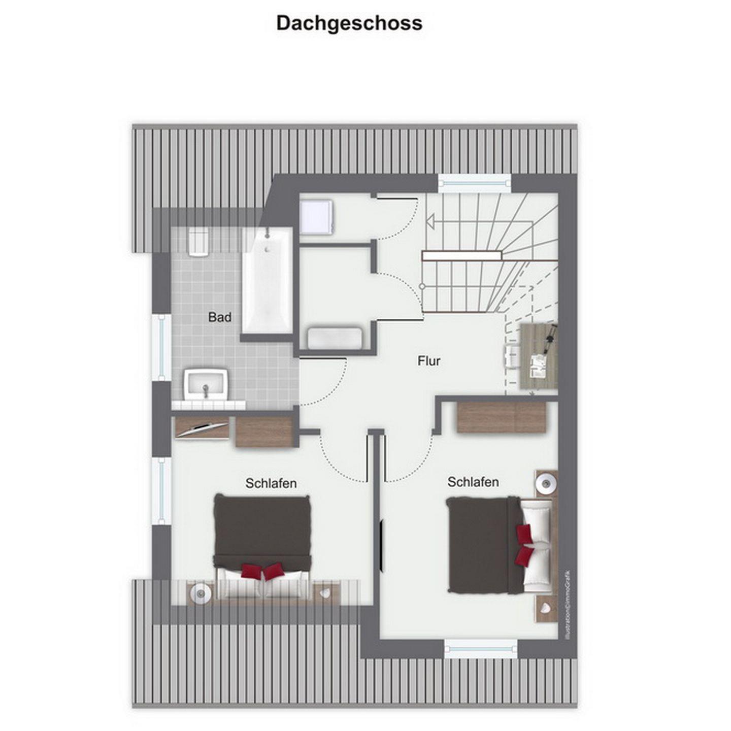 In den Schlafzimmern im Dachgeschoss stehen dir zwei Doppelbetten (2 x 90 x 200 cm) sowie Kleiderschränke mit ausreichend Platz zur Verfügung. In einem der beiden Schlafzimmer findest du einen Fernseher vor. Des Weiteren verfügt das Dachgeschoss über ein Bad mit Badewanne und Duschabtrennung sowie den Flur. Zusätzlich bietet dir dieses Haus einen Abstellraum, eine zweite Garderobe und eine Schreibtischecke.