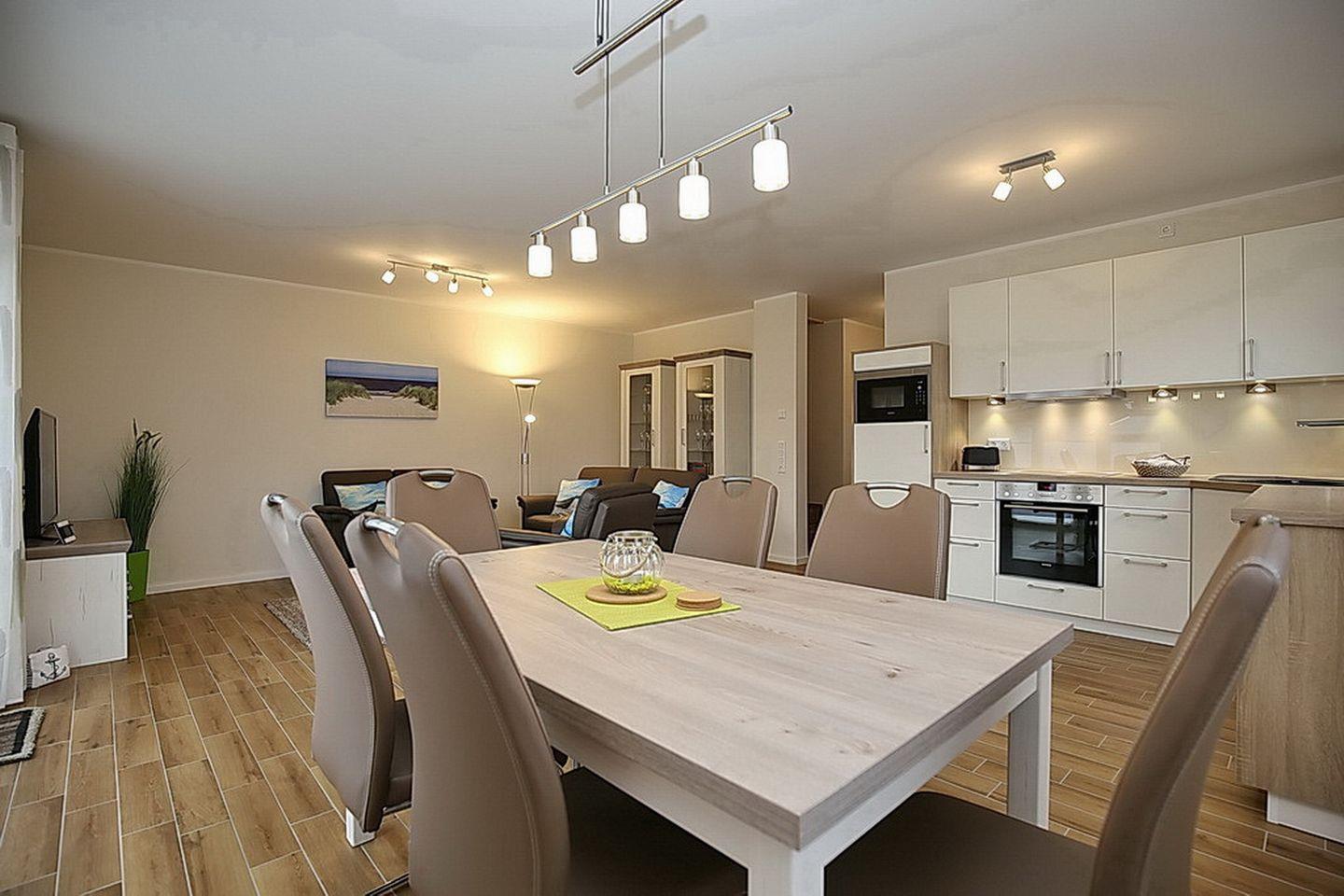 Die integrierte Küchenzeile enthält Backofen, 4- Platten Cerankochfeld, Geschirrspüler, Kühlschrank mit Gefrierfach und eine Mikrowelle.