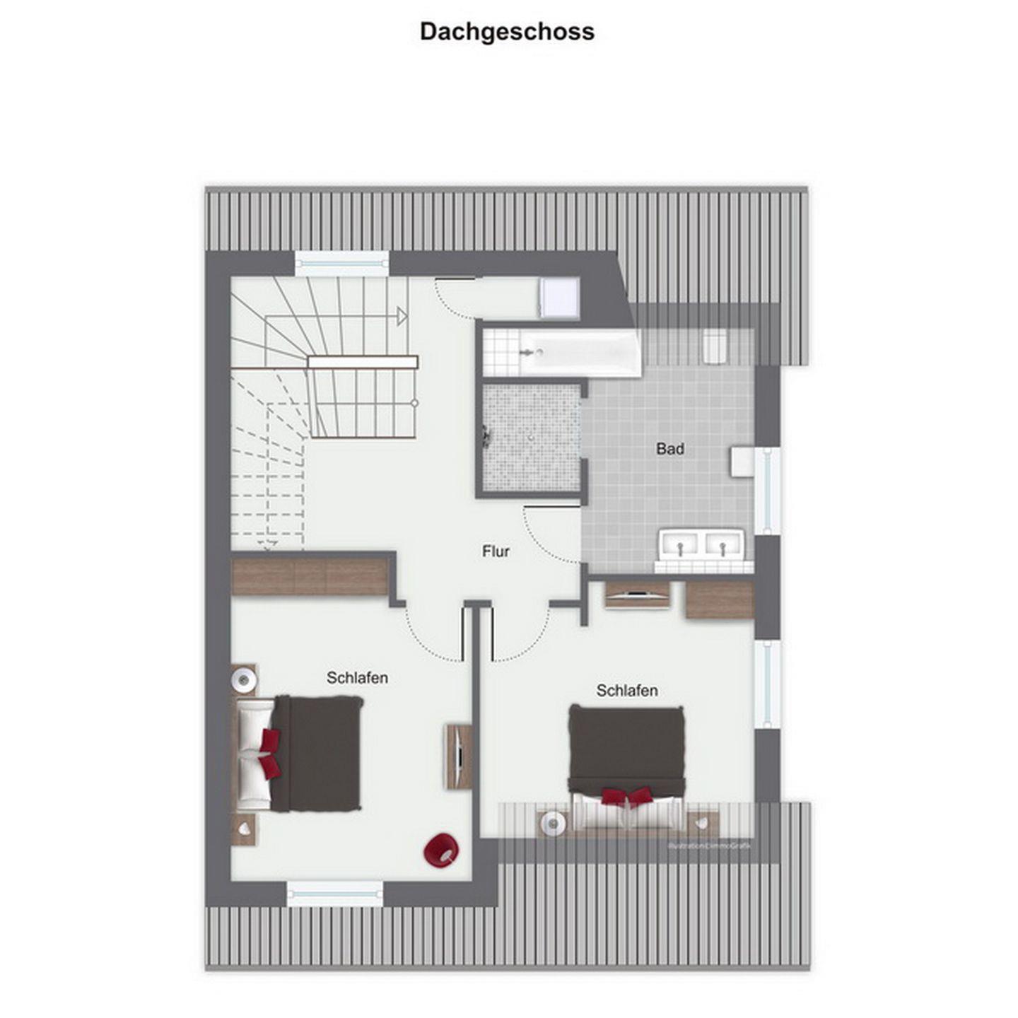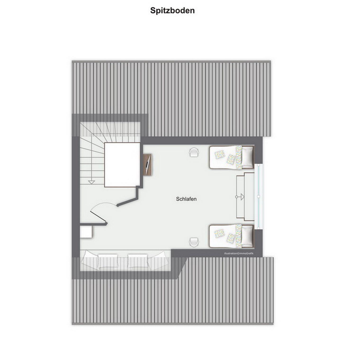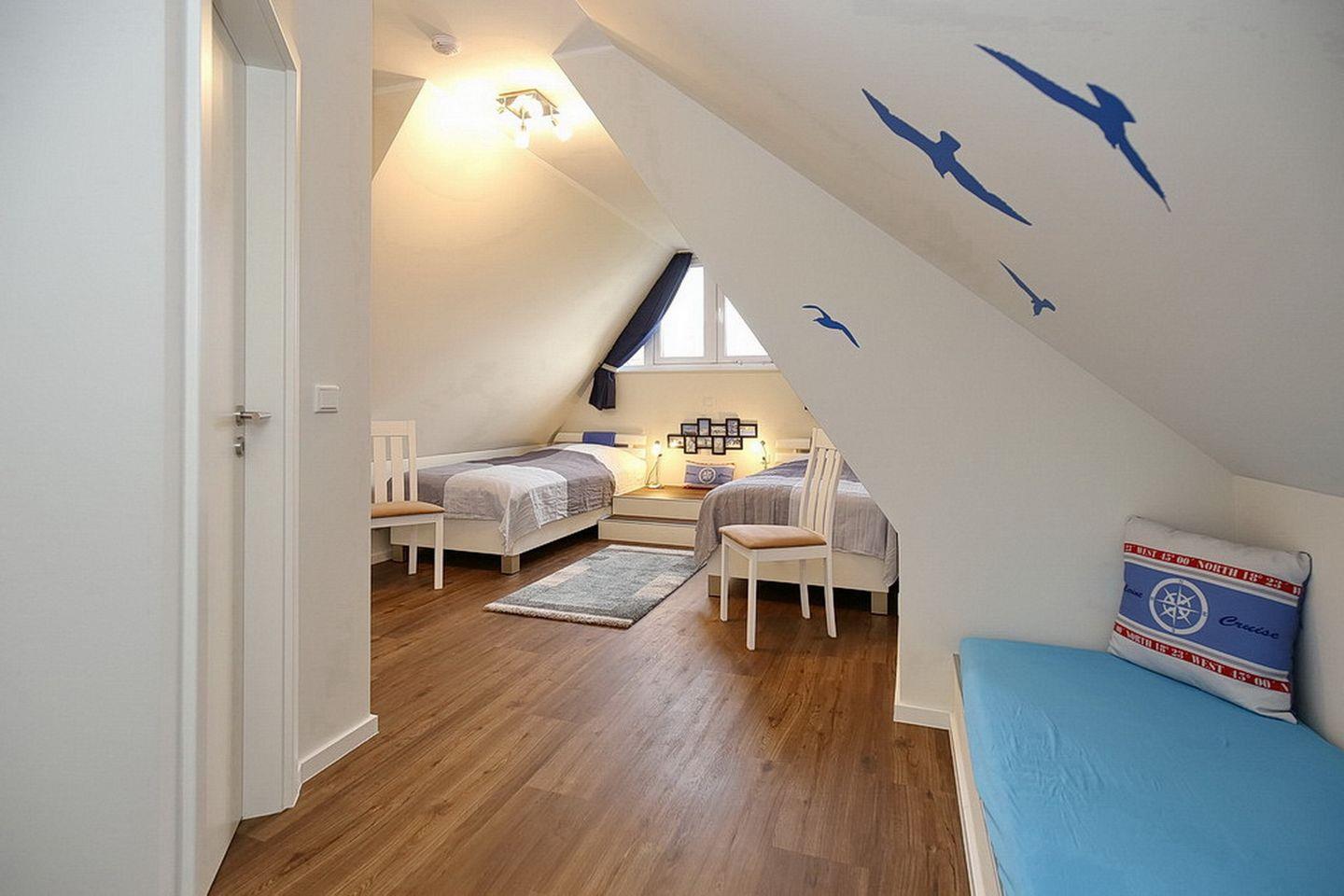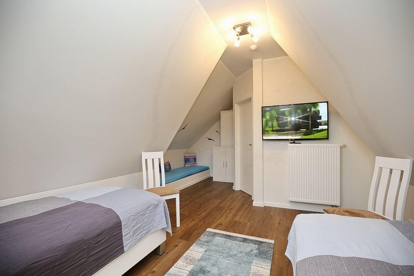 Im Dachgeschoss befindet sich ein weiteres Schlafzimmer mit zwei Einzelbetten (90 x 200 cm) sowie ein Schlafpodest für ein Kind (7. Person) ohne Lattenrost. Zwei Kinderbettmatratzen (á 70cm x 140 cm) stehen hierfür als Unterlage zur Verfügung. Auch dieser Schlafraum bietet einen TV.
