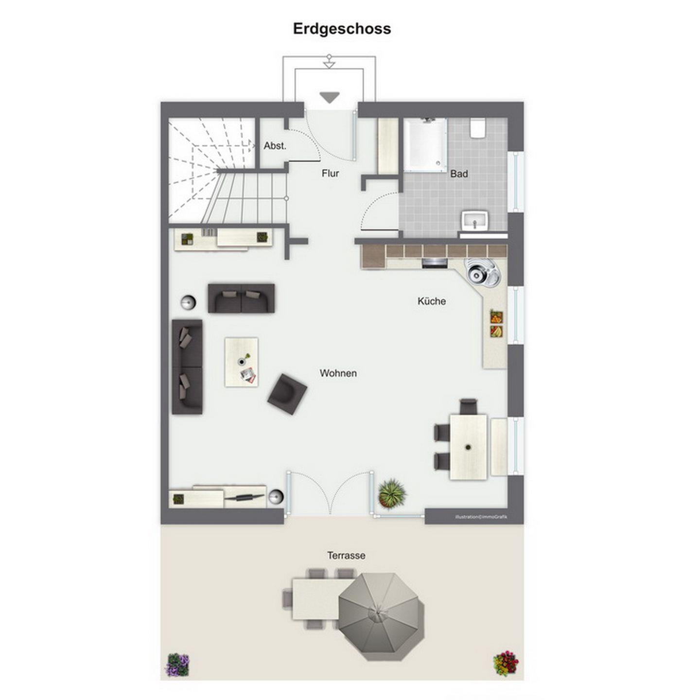 Im Erdgeschoss des Ferienhauses befindet sich der großzügige Wohnraum mit gemütlichem Essbereich. Der Zugang zur Terrasse erfolgt direkt vom Wohnzimmer aus, diese hat eine Süd-Ost-Ausrichtung und gibt den Blick frei in den Garten. Für deine Unterhaltung stehen dir ein Flachbild TV und eine Stereo-Anlage zur Verfügung. Die integrierte Küchenzeile enthält Backofen, 4-Platten-Cerankochfeld, Geschirrspüler, Kühlschrank mit Gefrierfach und eine Mikrowelle. Das Bad im EG ist mit einer Dusche ausgestattet.