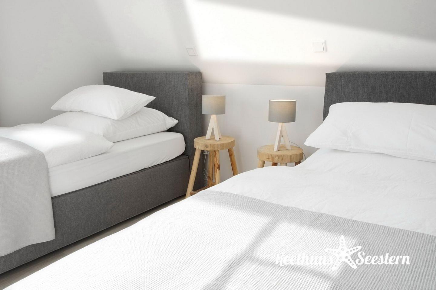 Im ersten Obergeschoss befinden sich zwei Schlafzimmer. Im ersten Schlafzimmer steht ein Boxspringbett (1 x 180 x 200 cm), im zweiten zwei Einzelboxspringbetten (100 x 200 cm). Eine gemütliche Schreibtischecke für eure Urlaubspost befindet sich ebenfalls im Obergeschoss. Dieser Arbeitsplatz ist mit einem Computermonitor ausgestattet (DVI-Anschluss und USB-Station). Auch eine Waschmaschine und ein Trockner stehen im 1.OG bereit. Im Dachgeschoss des Hauses findet ihr das dritte Schlafzimmer im Spitzboden mit zwei Einzelbetten (80 x 200 cm), Schreibtisch und einer gemütlichen Sofa-Nische vor.
