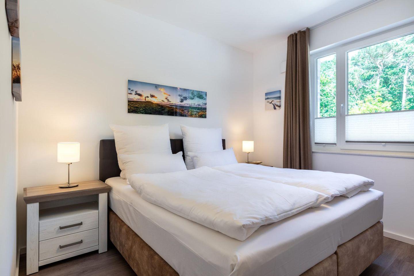 Das helle und moderne Nichtraucher-Apartment verfügt über Fußbodenheizung, bodentiefe Fenster mit 3-fach Isolierung, kostenfreies WLAN und eine voll ausgestattete offene Küche mit Geschirrspüler, Gefrierfach, Tassimo-Kaffeemaschine, Toaster, Wasserkocher, Backofen und Mikrowelle sowie über einen Essbereich. Im Wohnbereich befindet sich eine Doppelschlafcouch (1,60 x 2,00 m) und ein großer Flatscreen-TV mit Blu-ray-Player. Beide separaten Schlafzimmer sind jeweils mit einem modernen Boxspringbett (1,80 x 2,00 m) und Flatscreen-TV ausgestattet. Ein Kinderbett kann gegen Entgelt aufgestellt werden und auf Wunsch könnt ihr einen Kinderhochstuhl hinzubuchen. Die stilvollen Badezimmer verfügen jeweils über eine ebenerdige Dusche, WC, Waschtisch, Föhn, Kosmetikspiegel und Handtuchheizkörper. Das Apartment verfügt über einen großzügigen Flur mit Garderobe. Auf der mit Gartenmöbeln und Sonnenschirm ausgestatteten Dachterrasse, lässt sich herrlich entspannen, sonnenbaden und gesellig beisammen sitzen. Die Dachterrasse ist vom Wohn-Essbereich aus begehbar. Das Apartment ist überdies barrierefrei konzipiert.